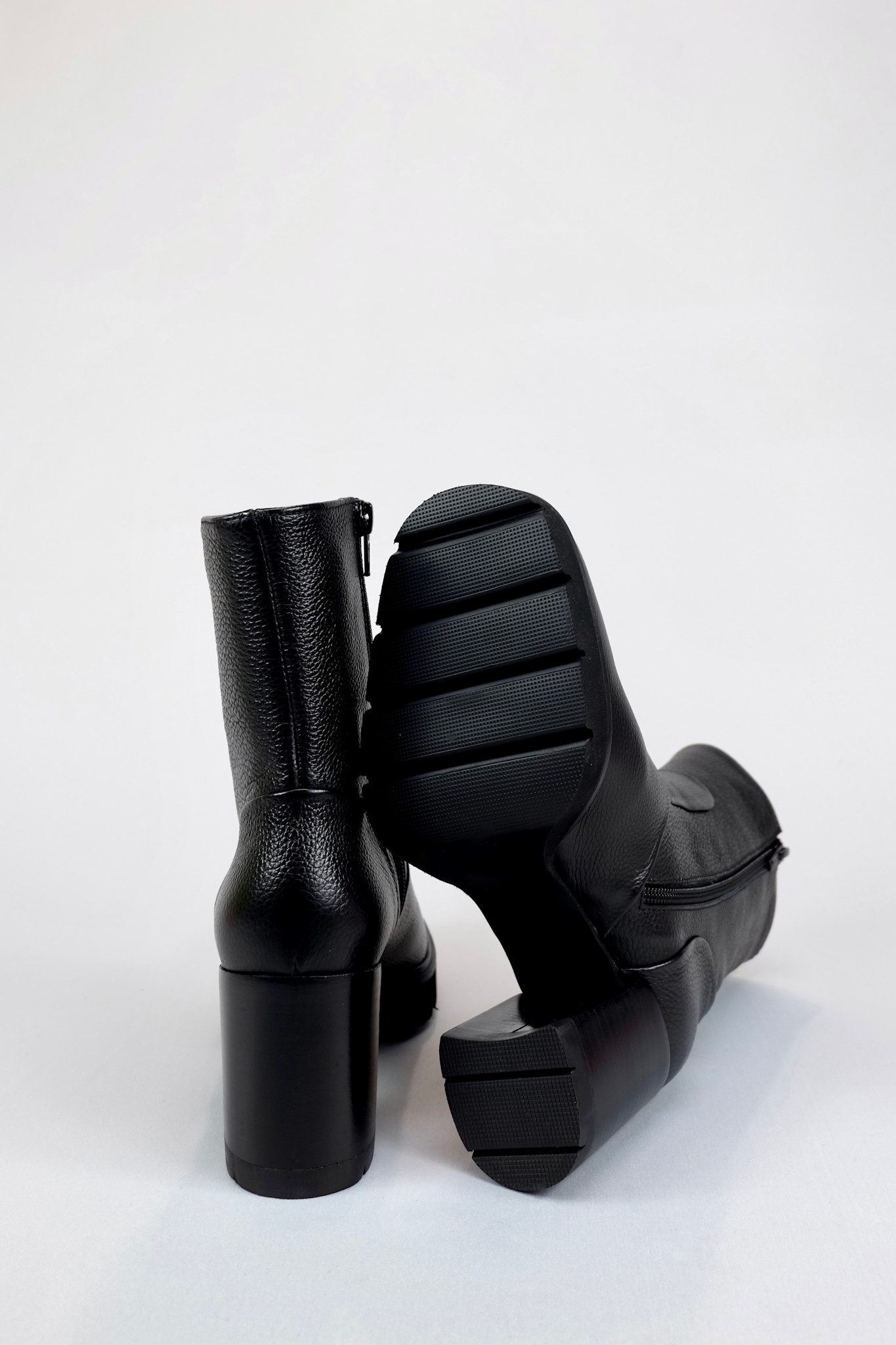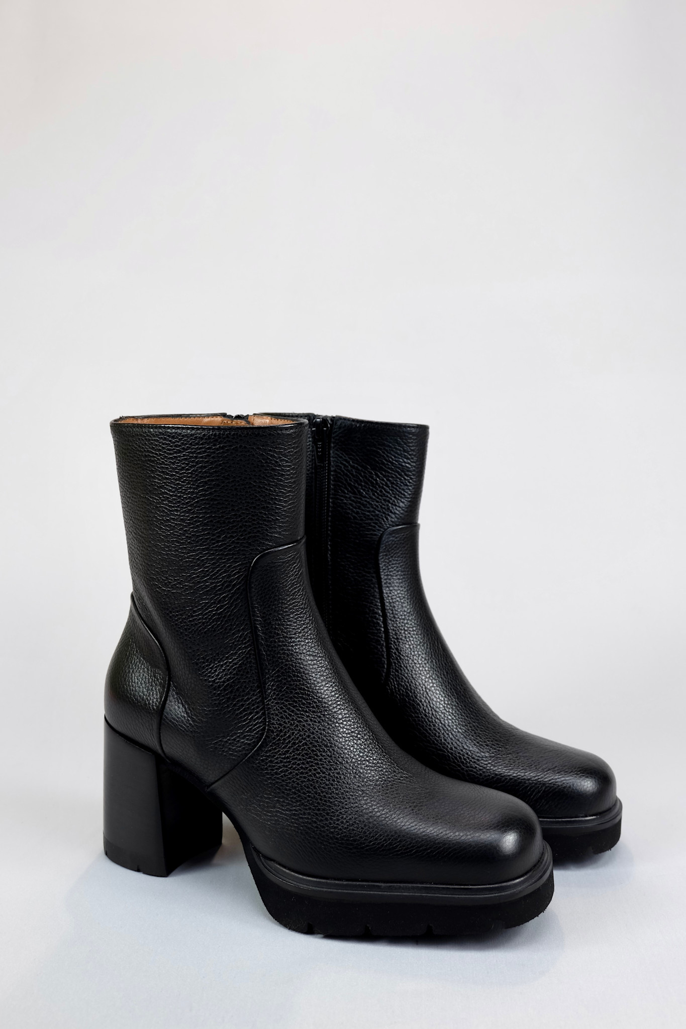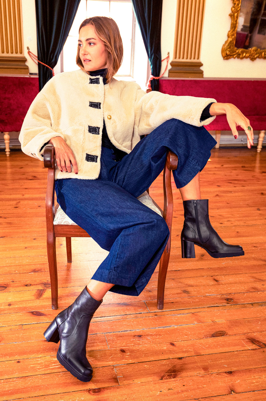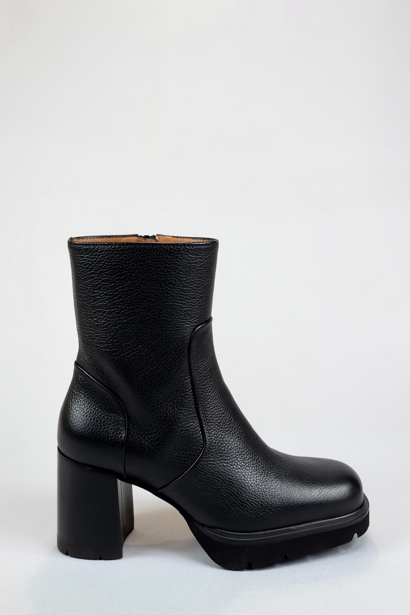 Ankle boot that is both a little dressed up and a little edgy in black pebbled leather on a block heel and lightly lugged platform