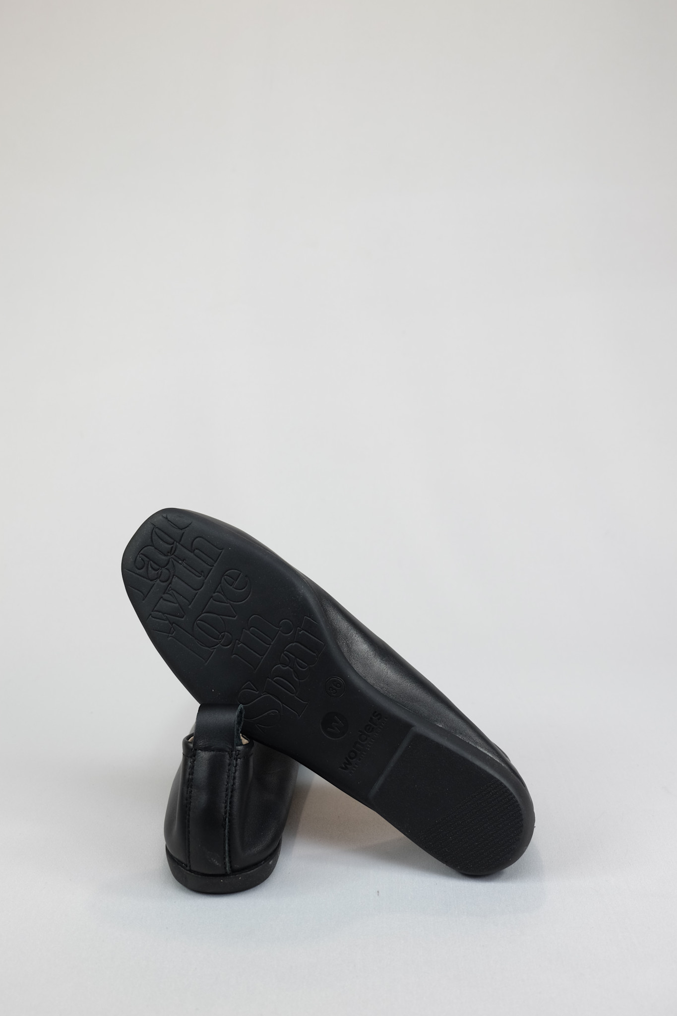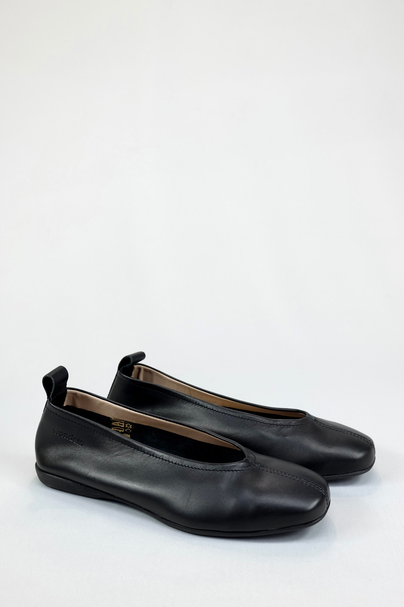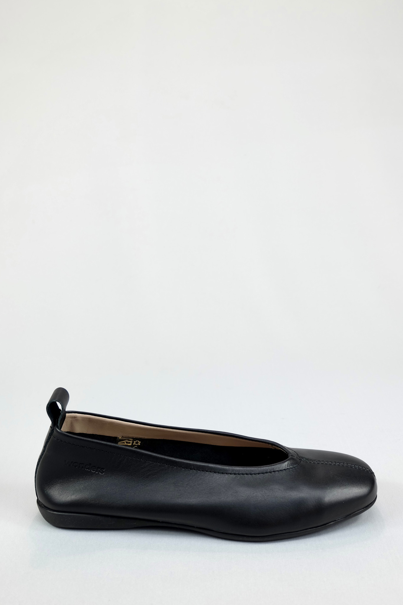 Minimalist ballet flat in black soft leather with a softly squared toe, front seam, and flexible rubber outsole