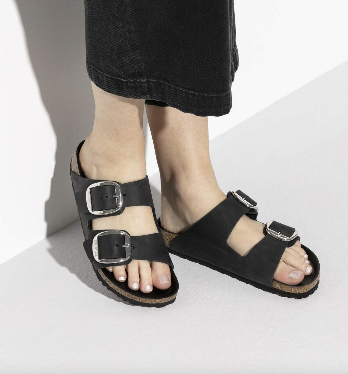 Birkenstock's iconic double strap sandal on a supportive cork footbed in a black oiled leather updated with an accentuated large chrome buckle in a narrower fit