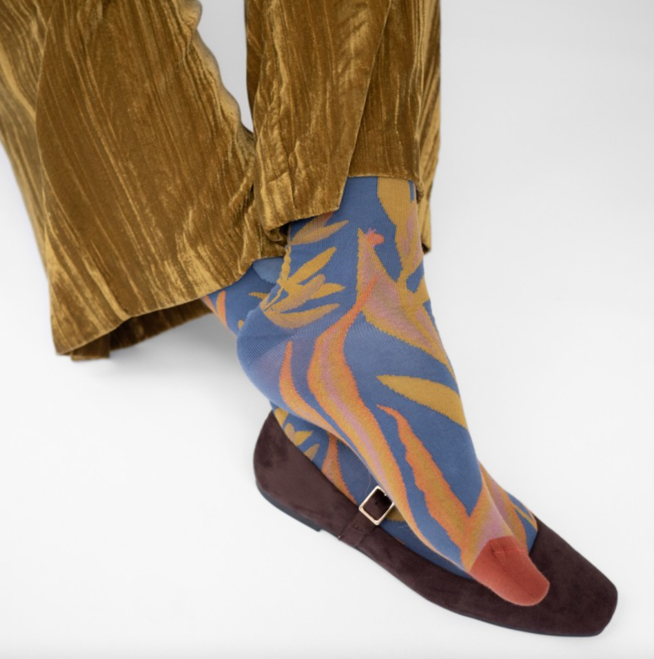 Cotton trouser sock in denim blue patterned with plants, inspired by Luigi Lucioni's Harmony in Minor Key