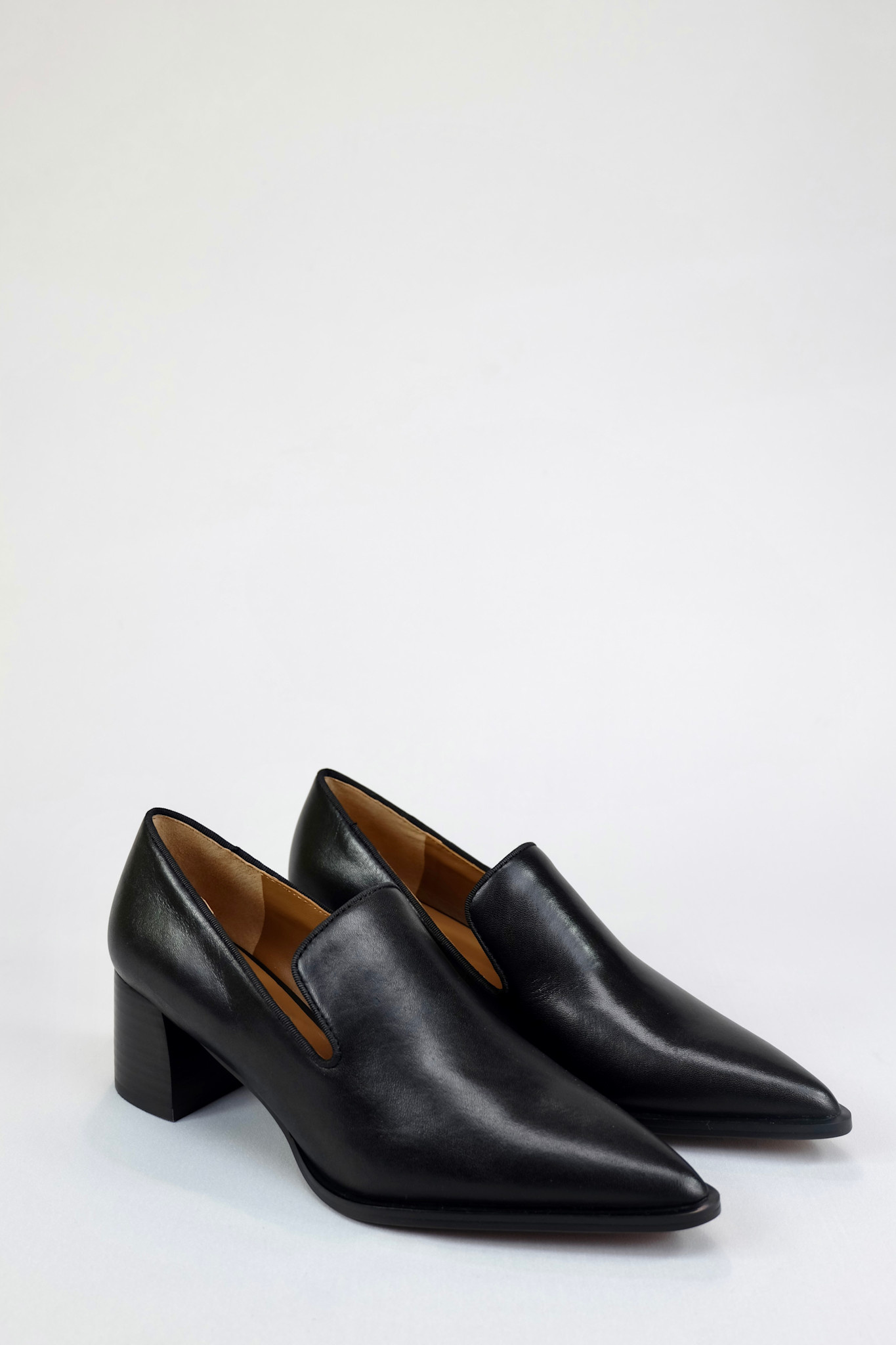 Sleek and simple block heel loafer in black leather with a minimalist design and pointed toe