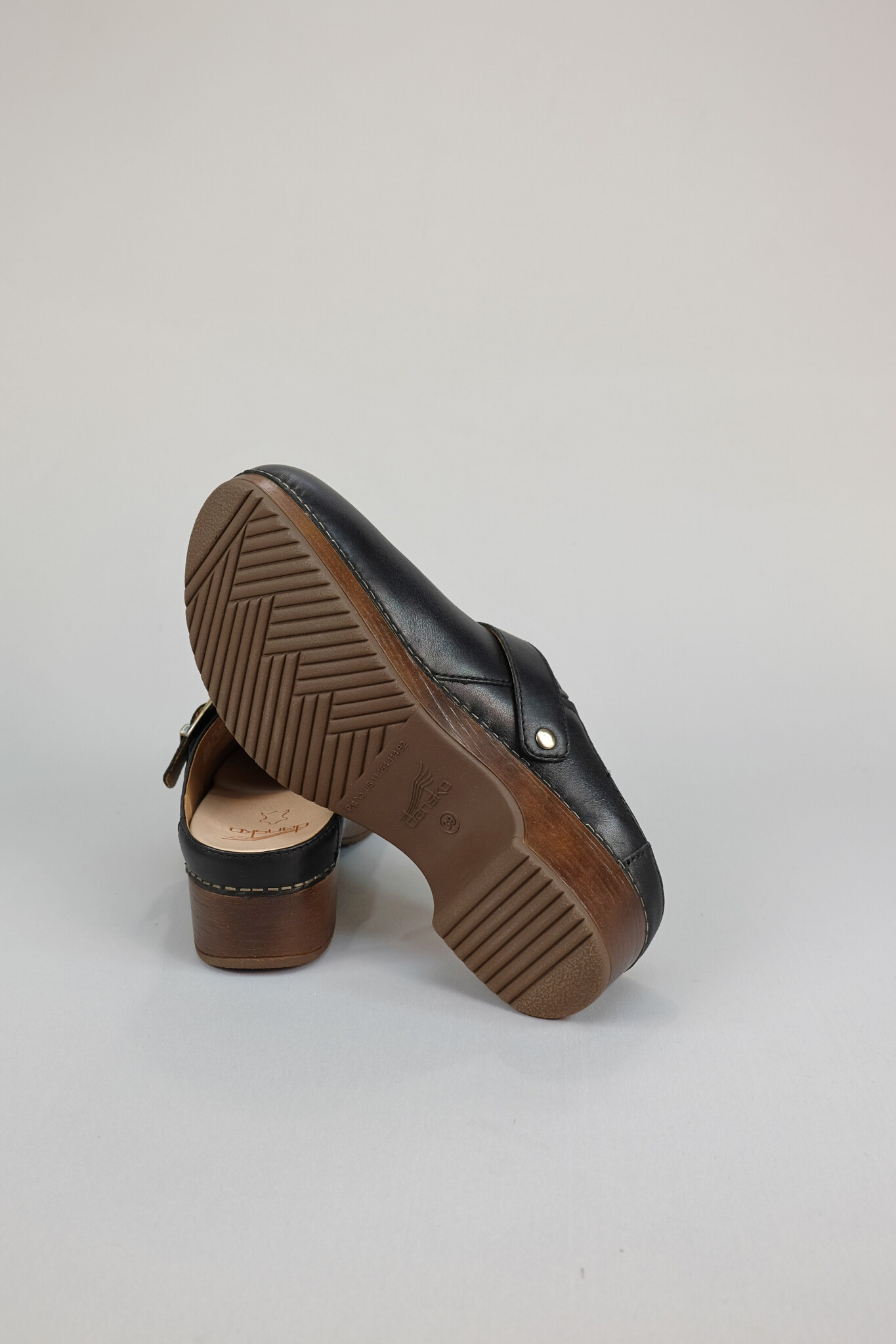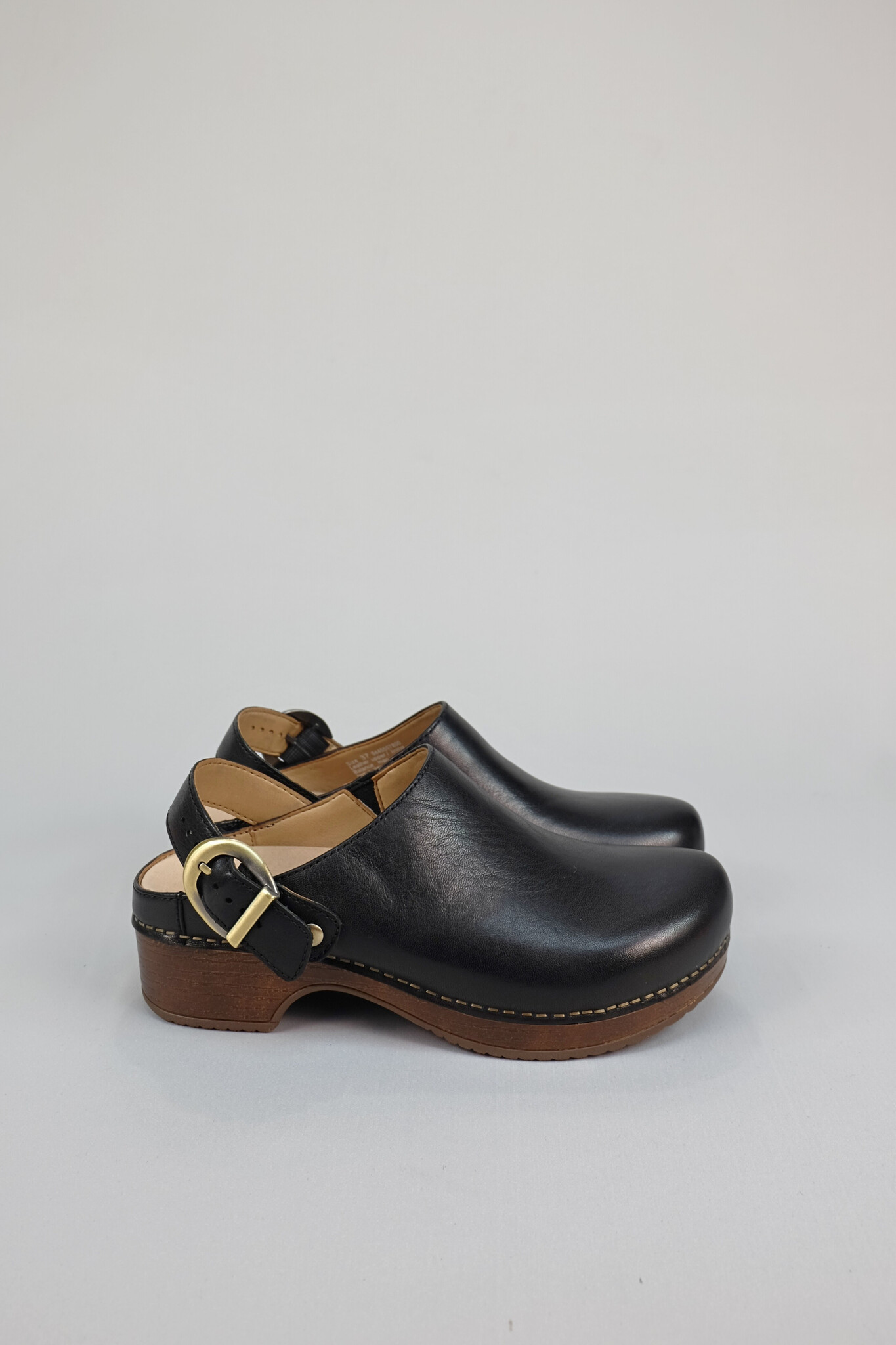Slip on clog with arch support in black leather with an optional back strap featuring an accentuated buckle on a PU sole with traditional staple finishing