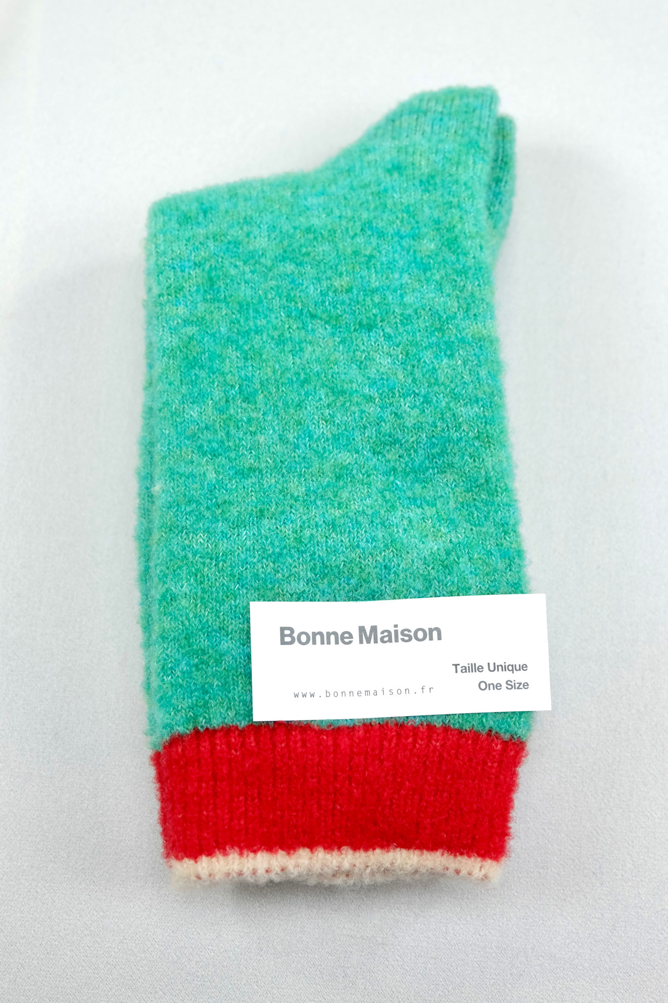 Plush and flexible merino wool blend crew sock in a vibrant teal green with a red elastic cuff