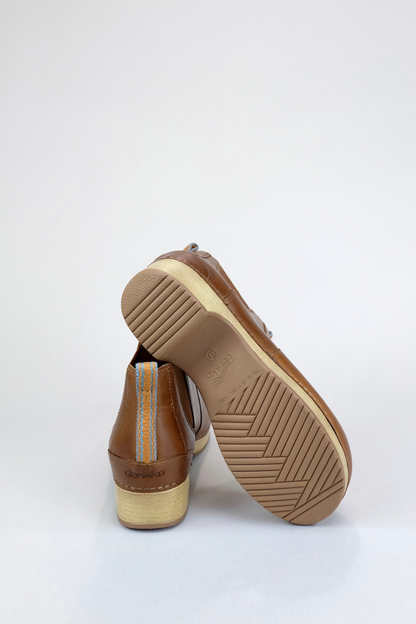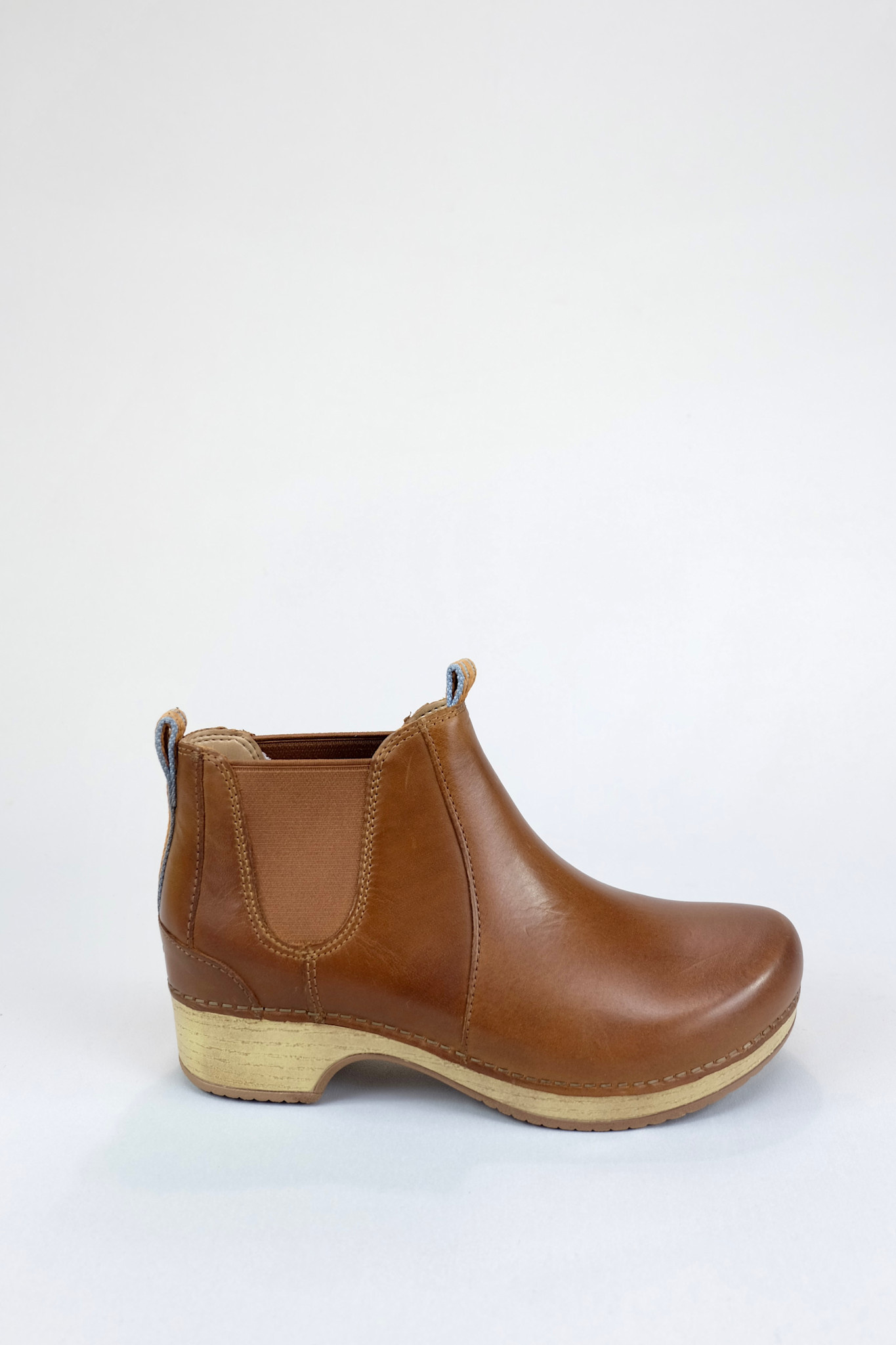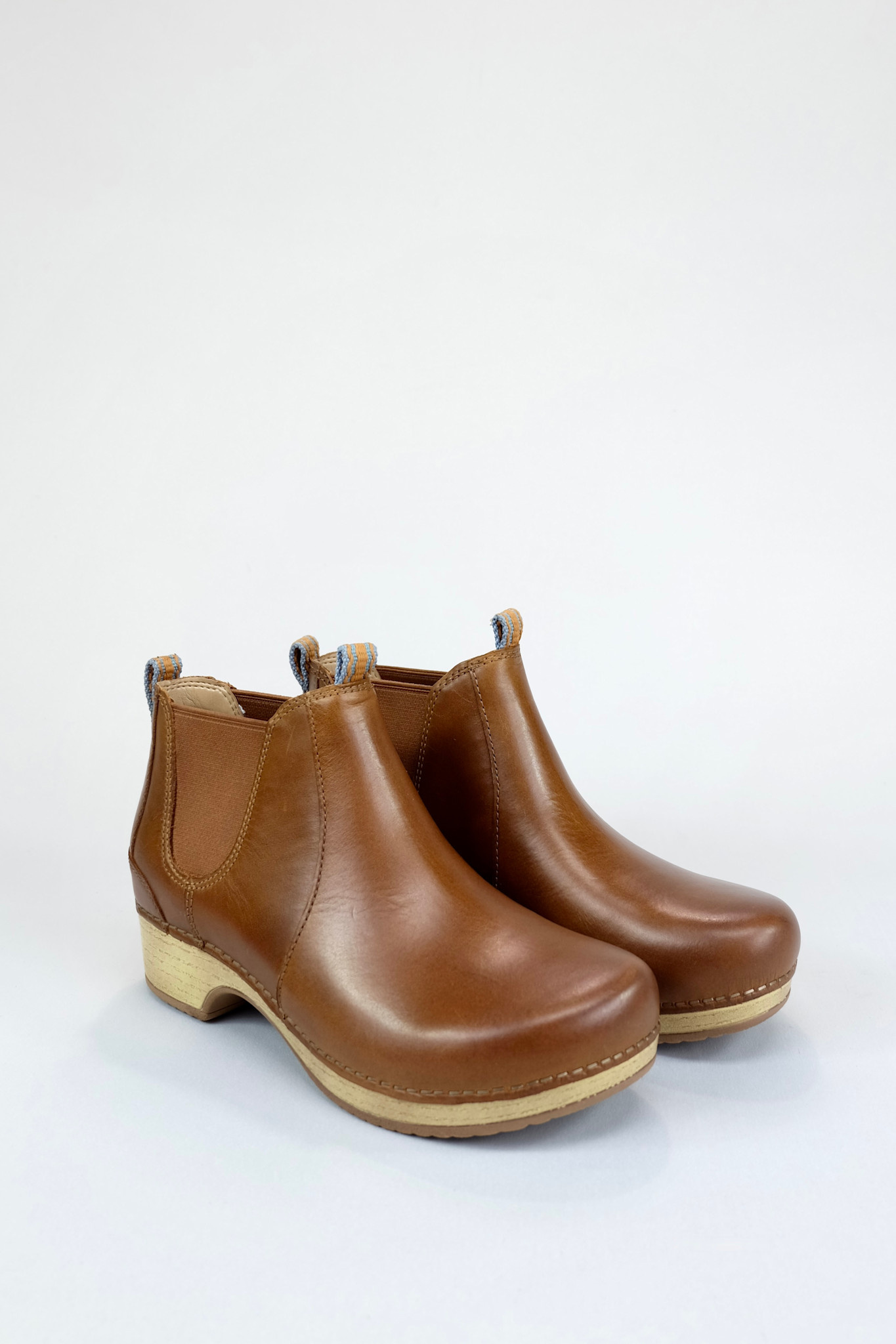 Double elastic pull on ankle boot for both style and comfort in tan oiled leather with a wood toned PU clog-based sole with built in arch support and a broad toe box