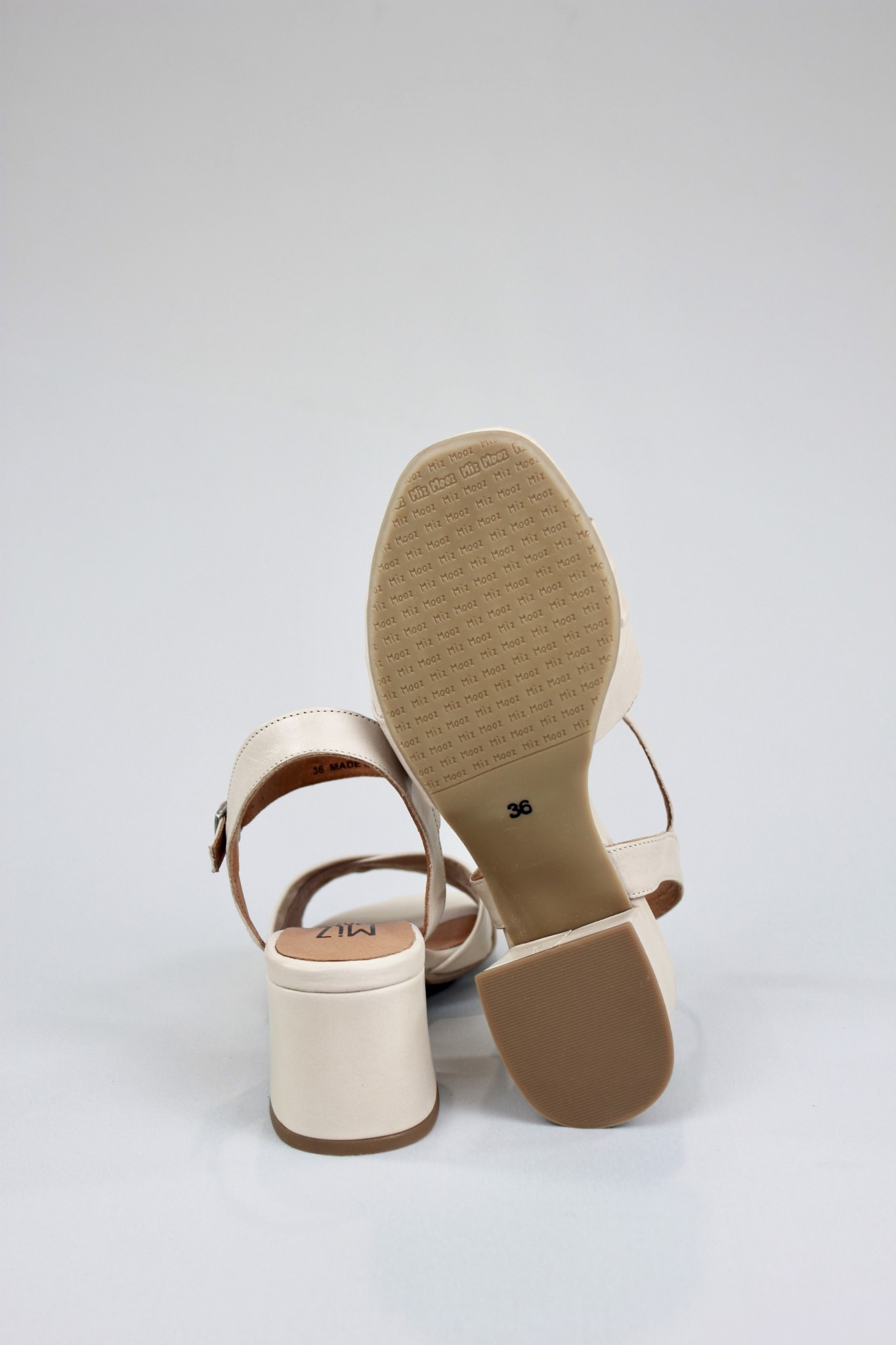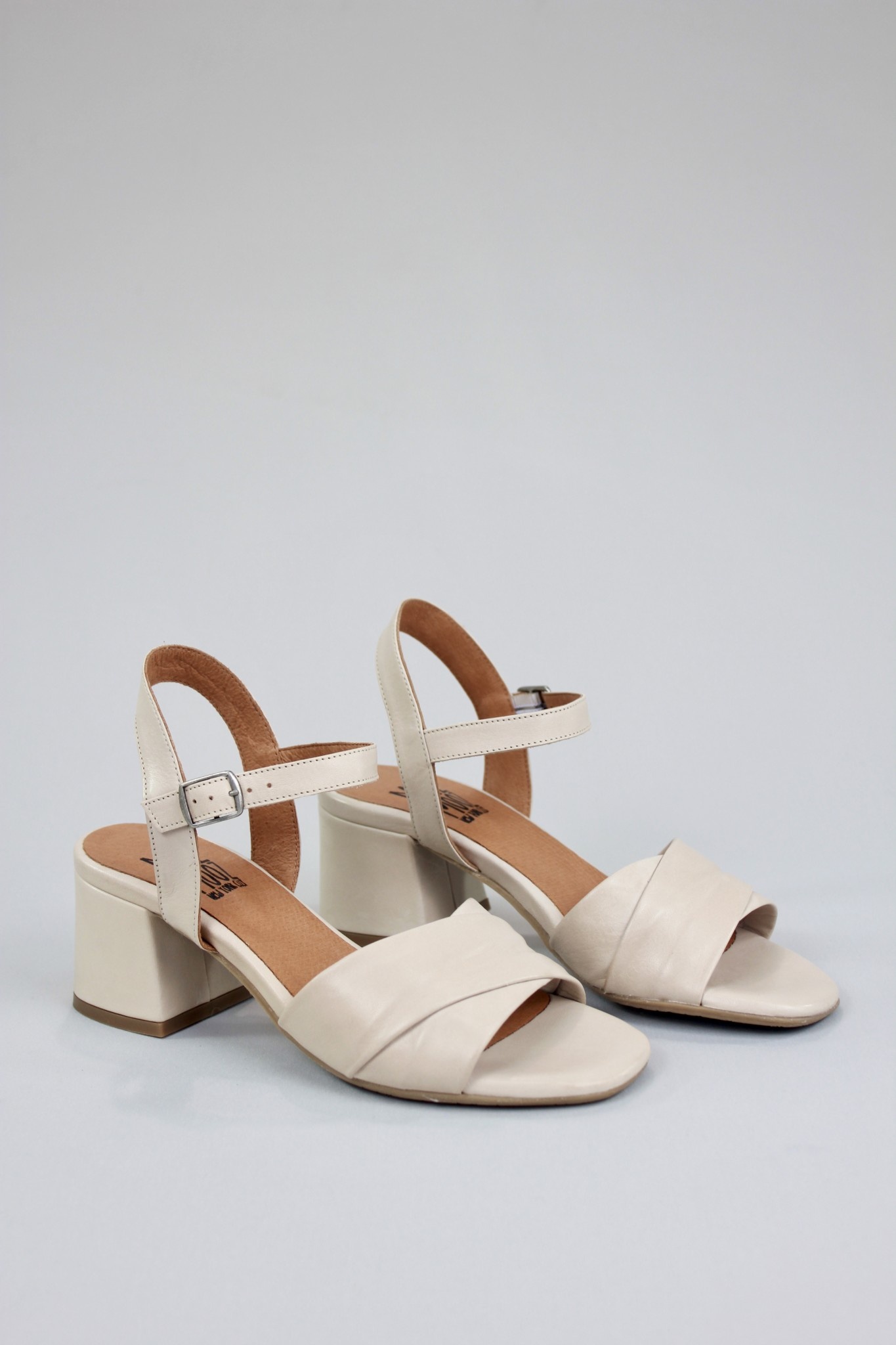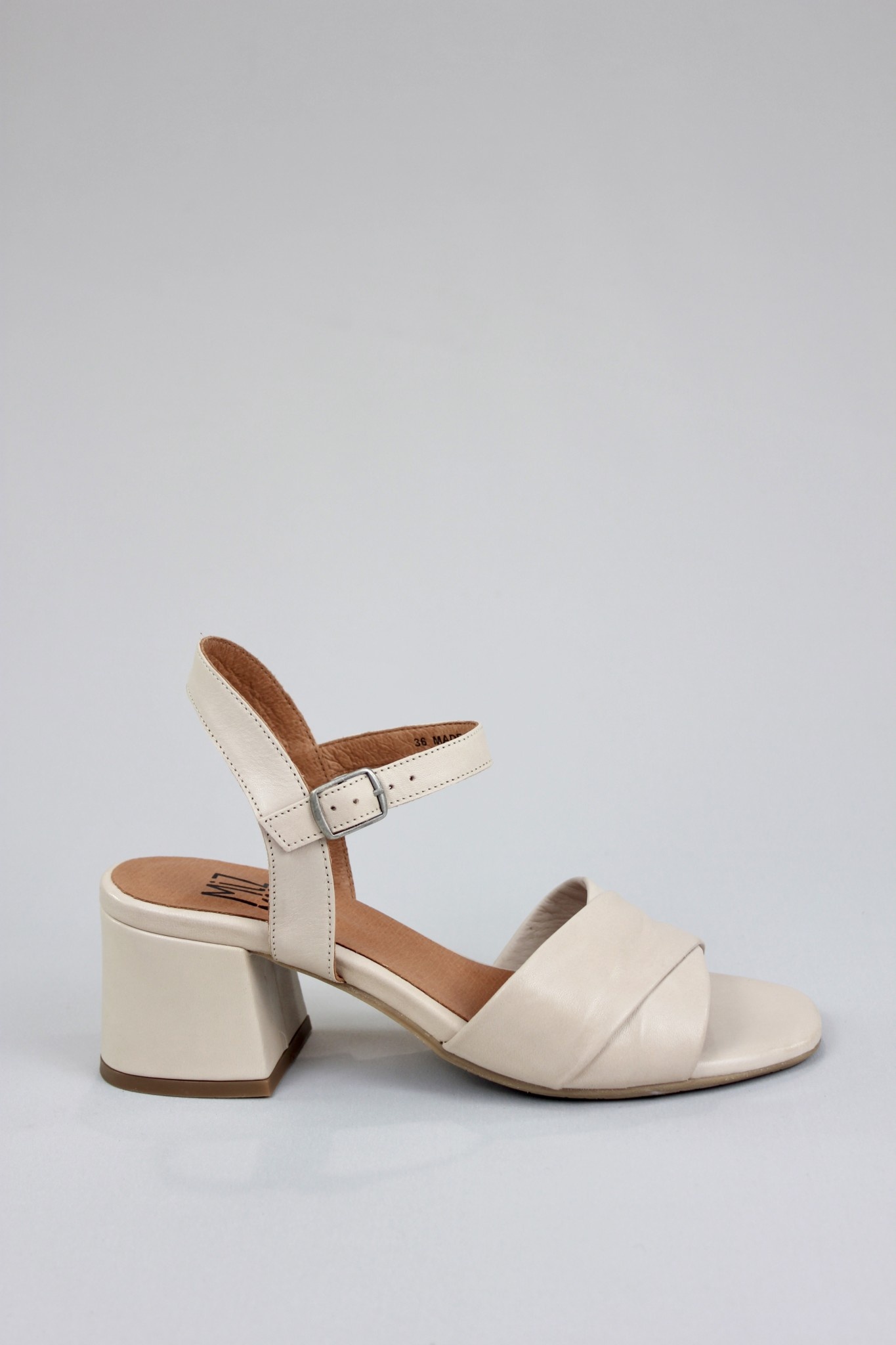 Clean and simple ankle strap dress sandal in creamy light beige leather with a comfortable block heel