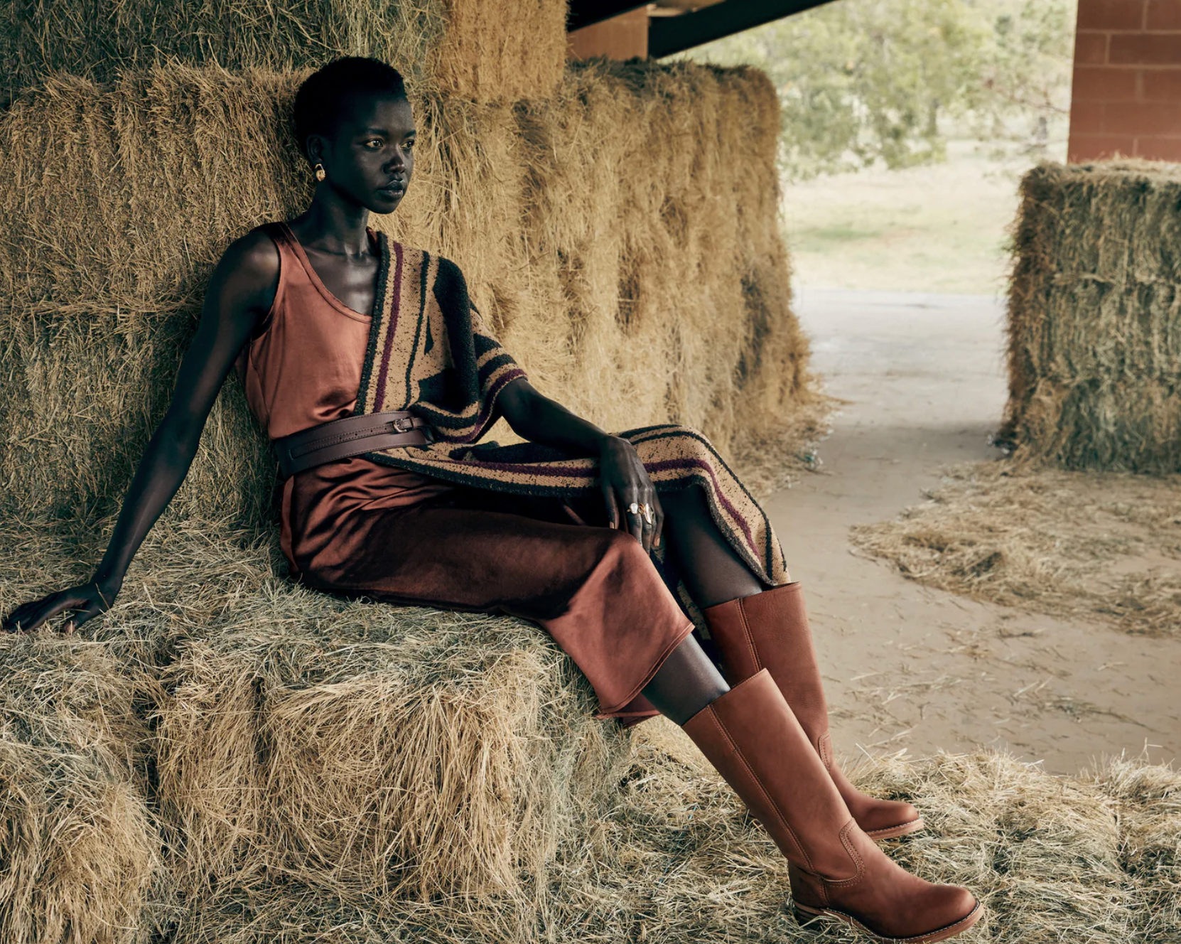 Frye's most iconic boot: tall pull-on boot with a quintessential 60s and 70s silhouette in beautiful saddle brown leather with a chunky toe and stacked block heel on a traditional leather sole