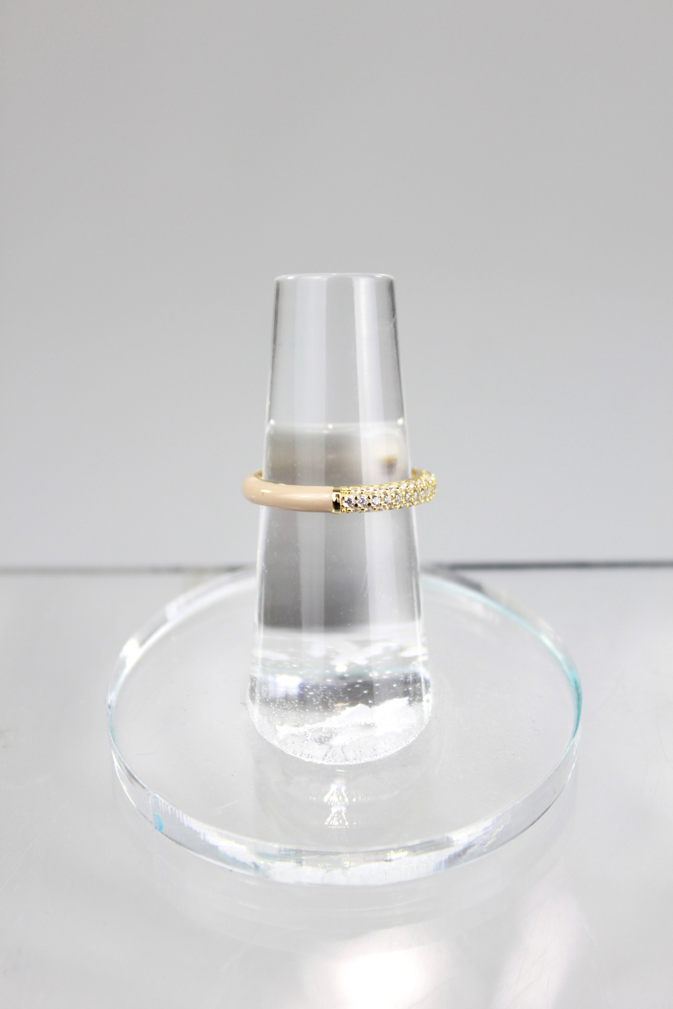Playful 14k gold plated ring featuring a half-and-half design of dual hand-painted oat beige enamel and shimmering cubic zirconia