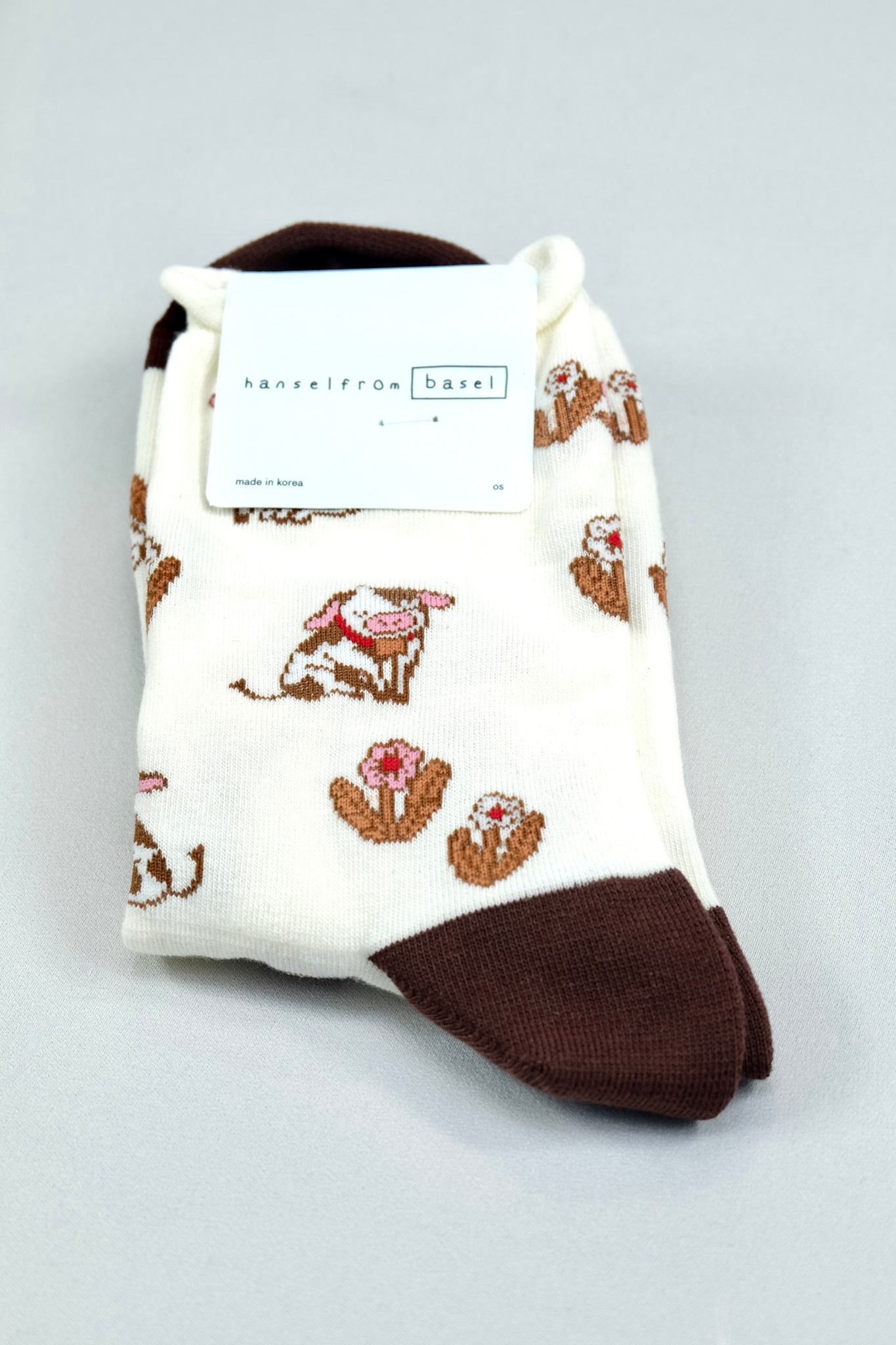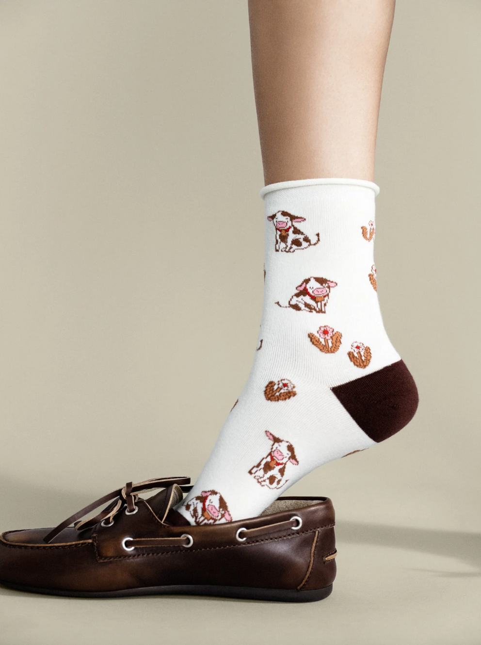 Cotton blend crew sock with a lightly rolled cuff featuring the cutest and coziest cows