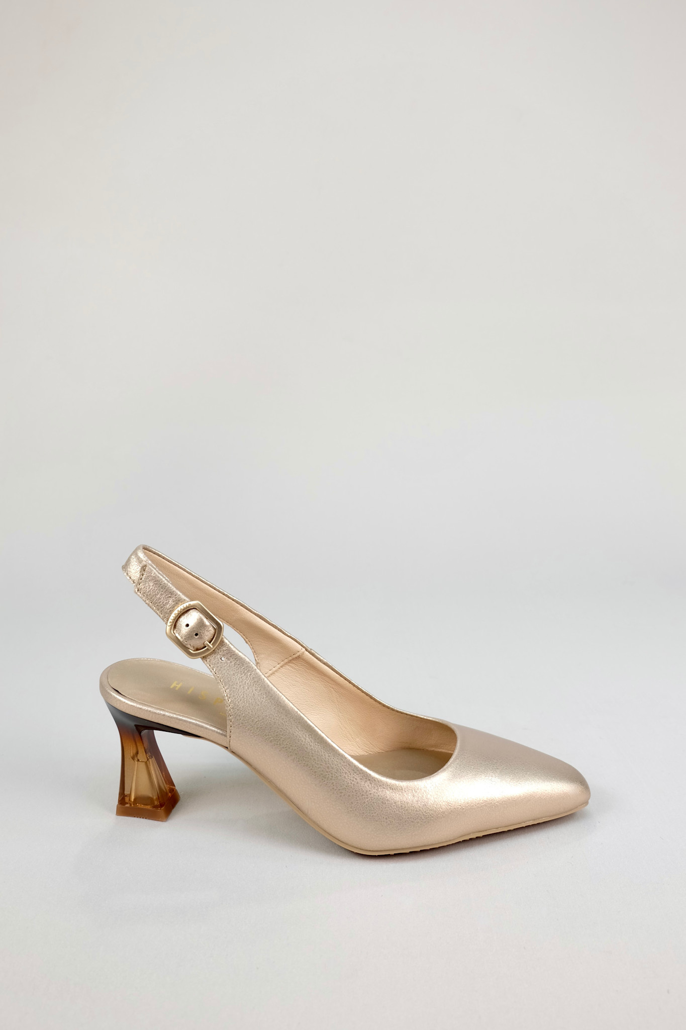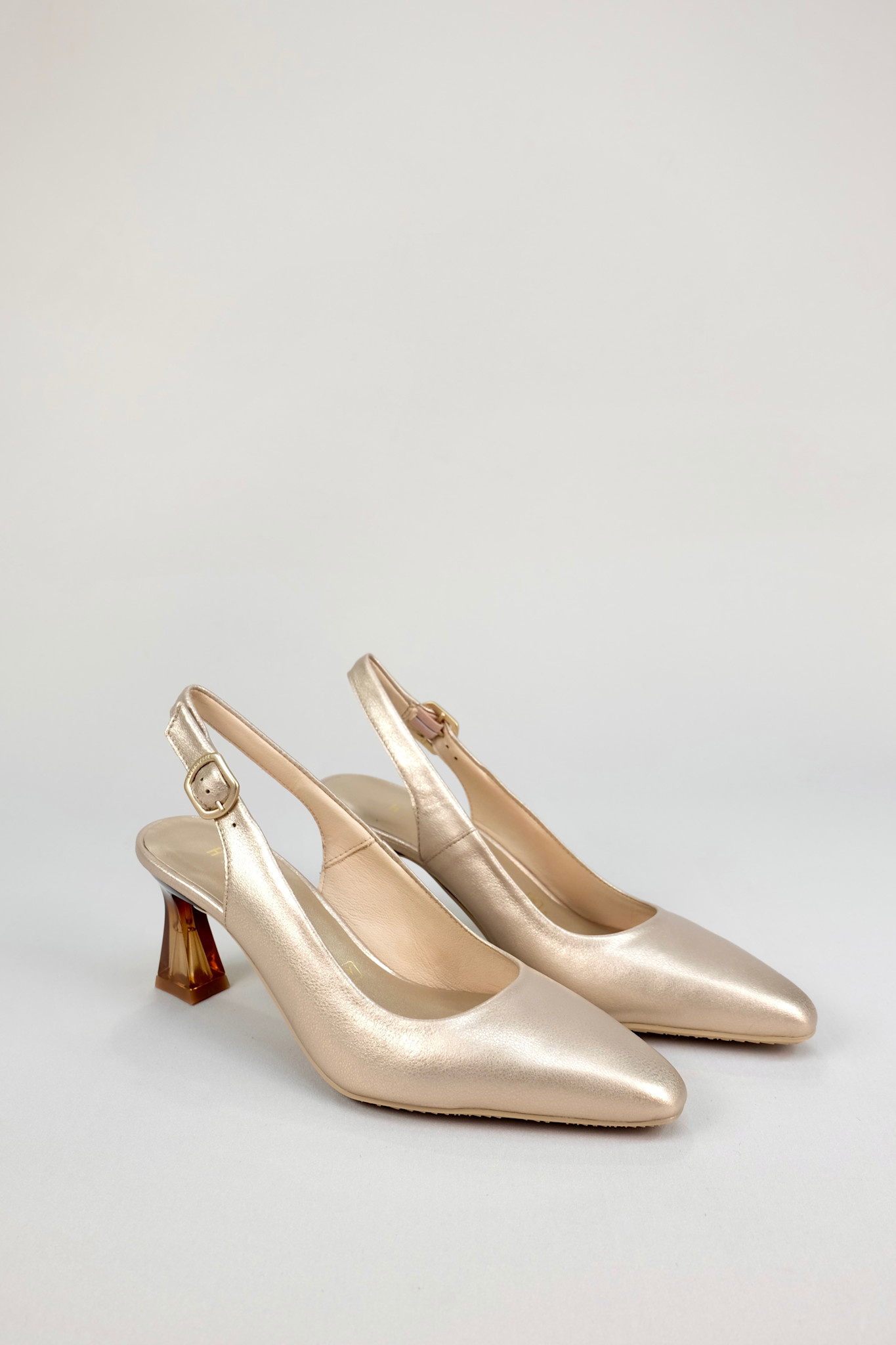 Staple slingback pump in metallic champagne gold leather with a pointed toe and ombre semi-translucent slim heel