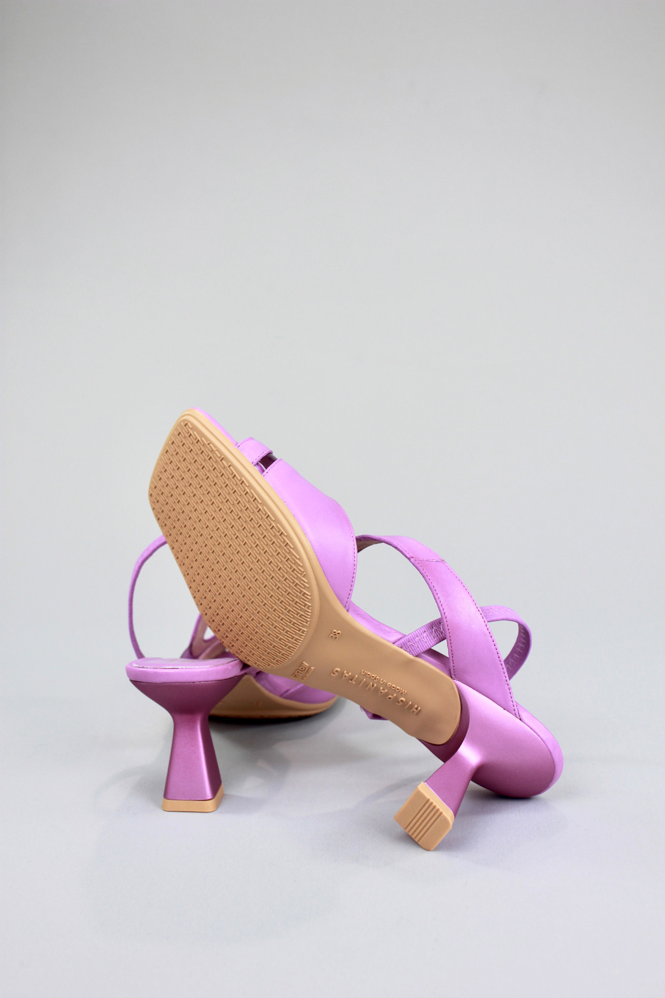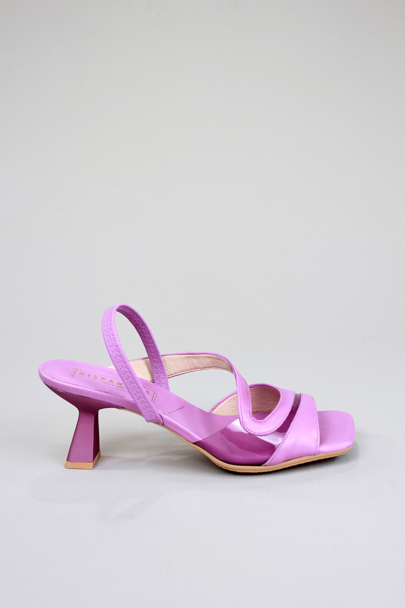 Fun and feminine dress sandal in a violet purple leather with a flexible translucent vinyl panel and elastic slingback on a square toe and slanted heel