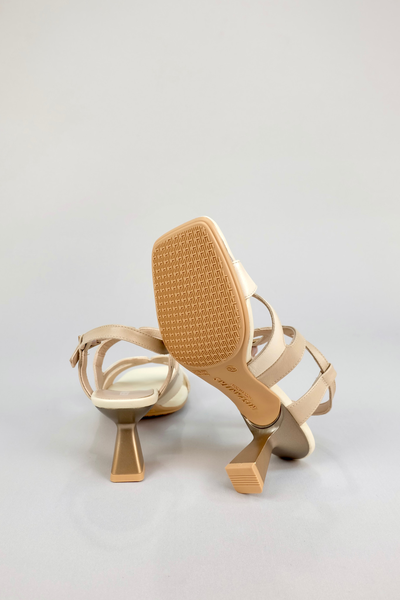 Chic feminine dress sandal in neutral beige leathers on a fashionable square toe and slanted heel