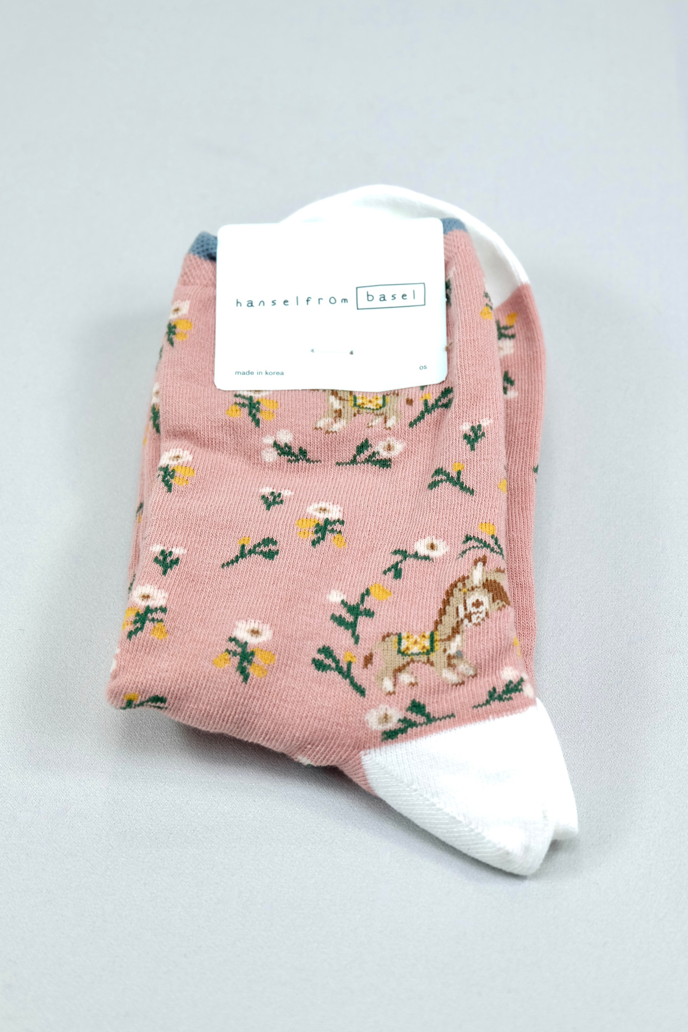Cotton blend crew sock in soft mauve pink featuring whimsical donkeys tucked amidst a sweet floral pattern