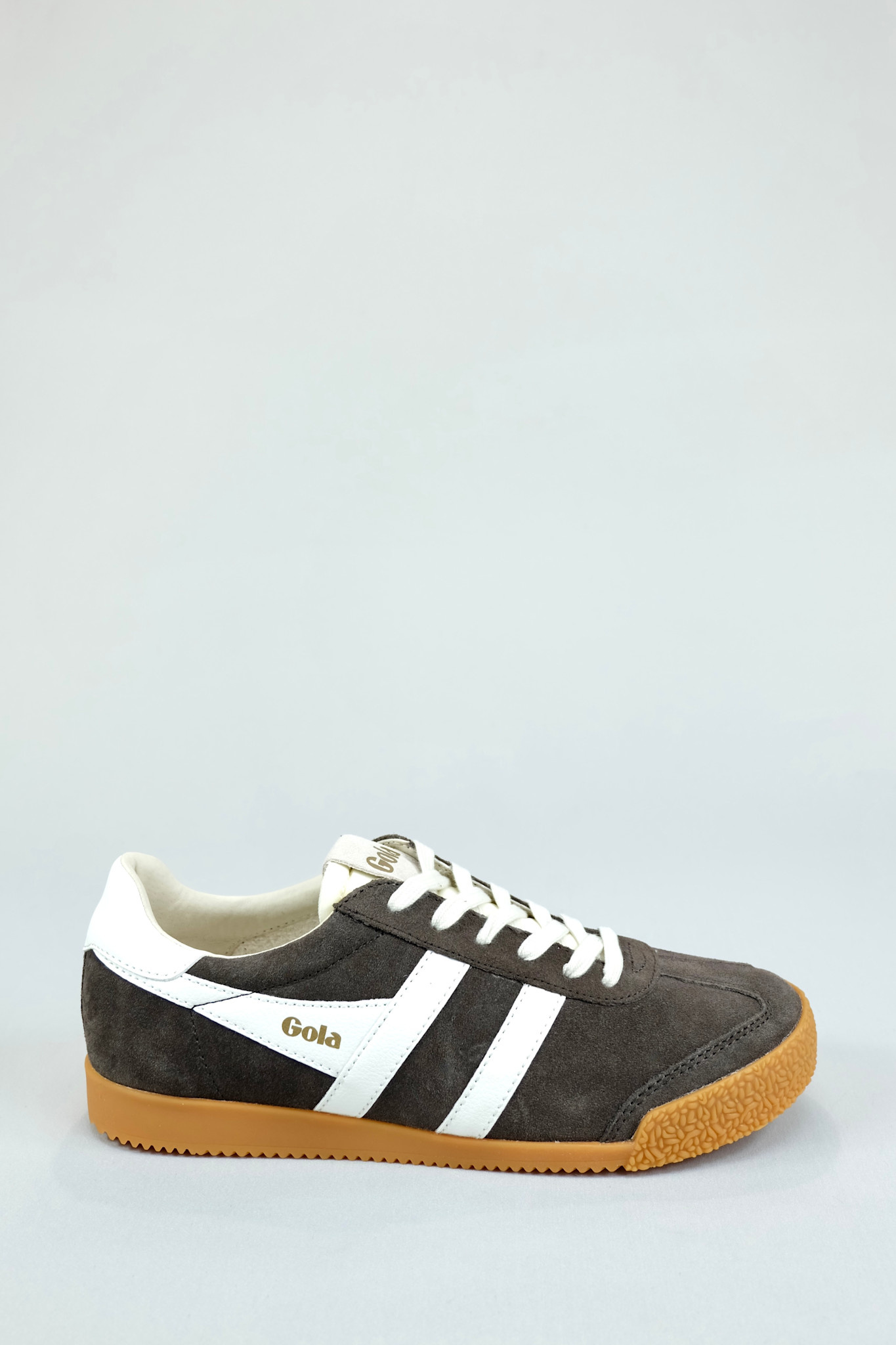Retro gum sole lace up sneaker with a rounded toe in an effortless everyday mocha brown suede with white accents