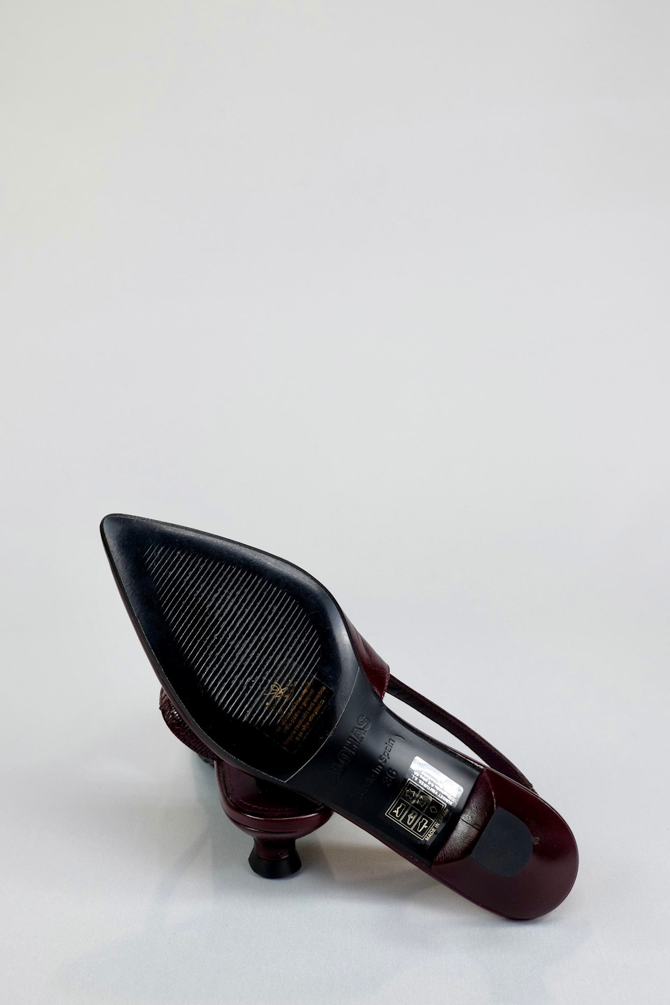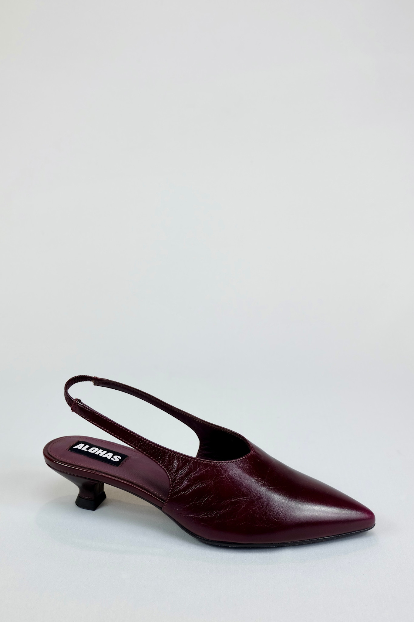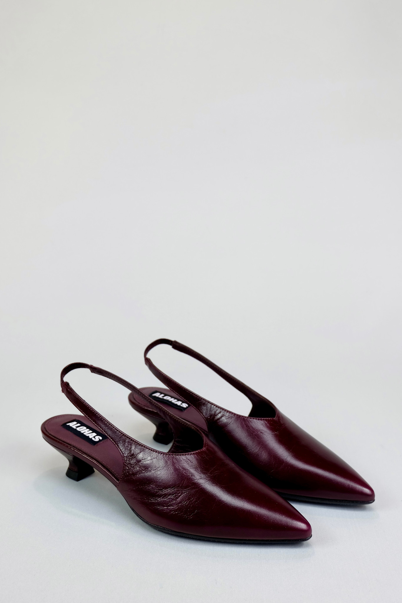 Fresh and elegant take on an 80s slingback pump with a pointed toe, feminine kitten heel, and high vamp in crinkled deep burgundy leather