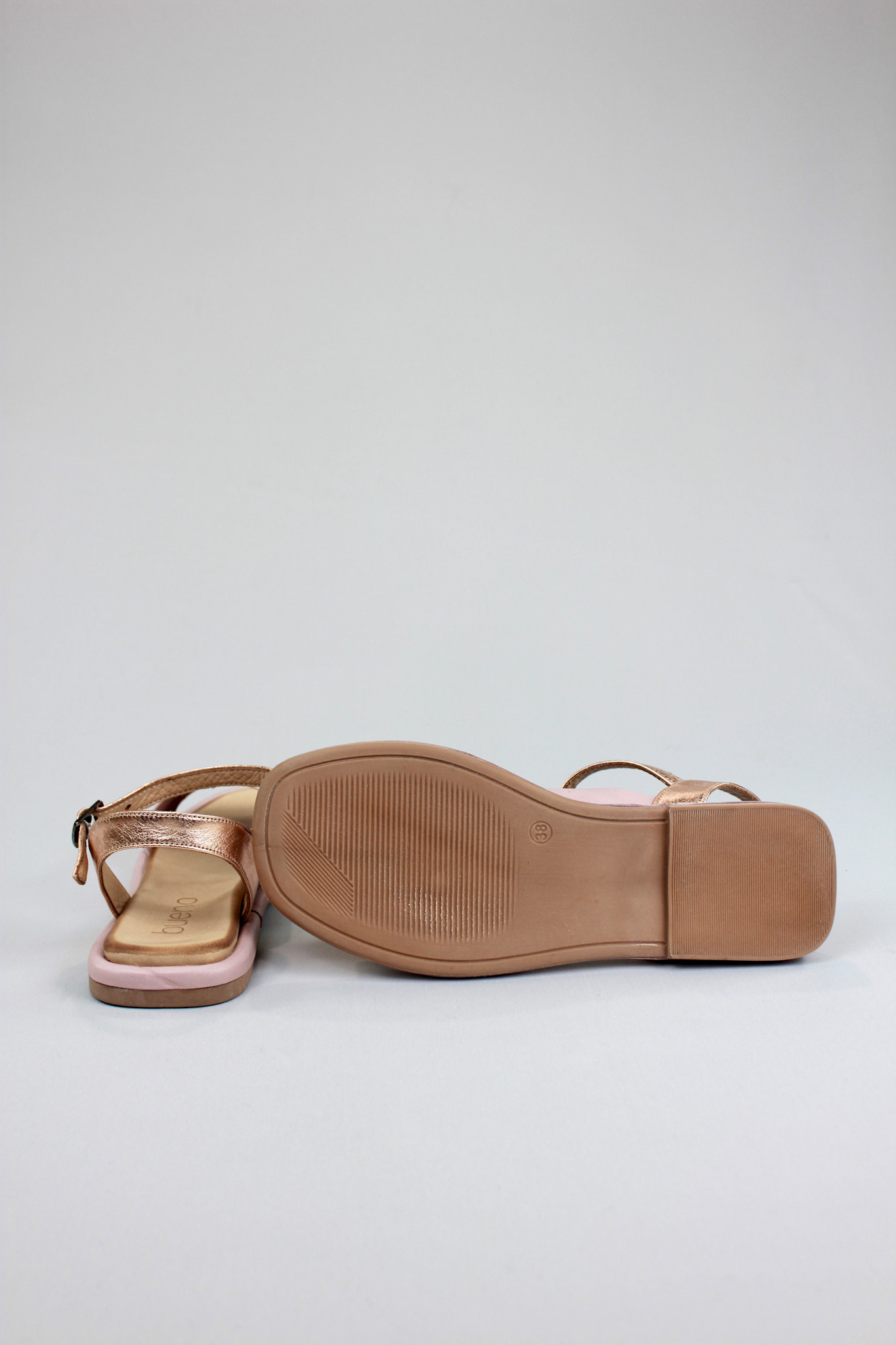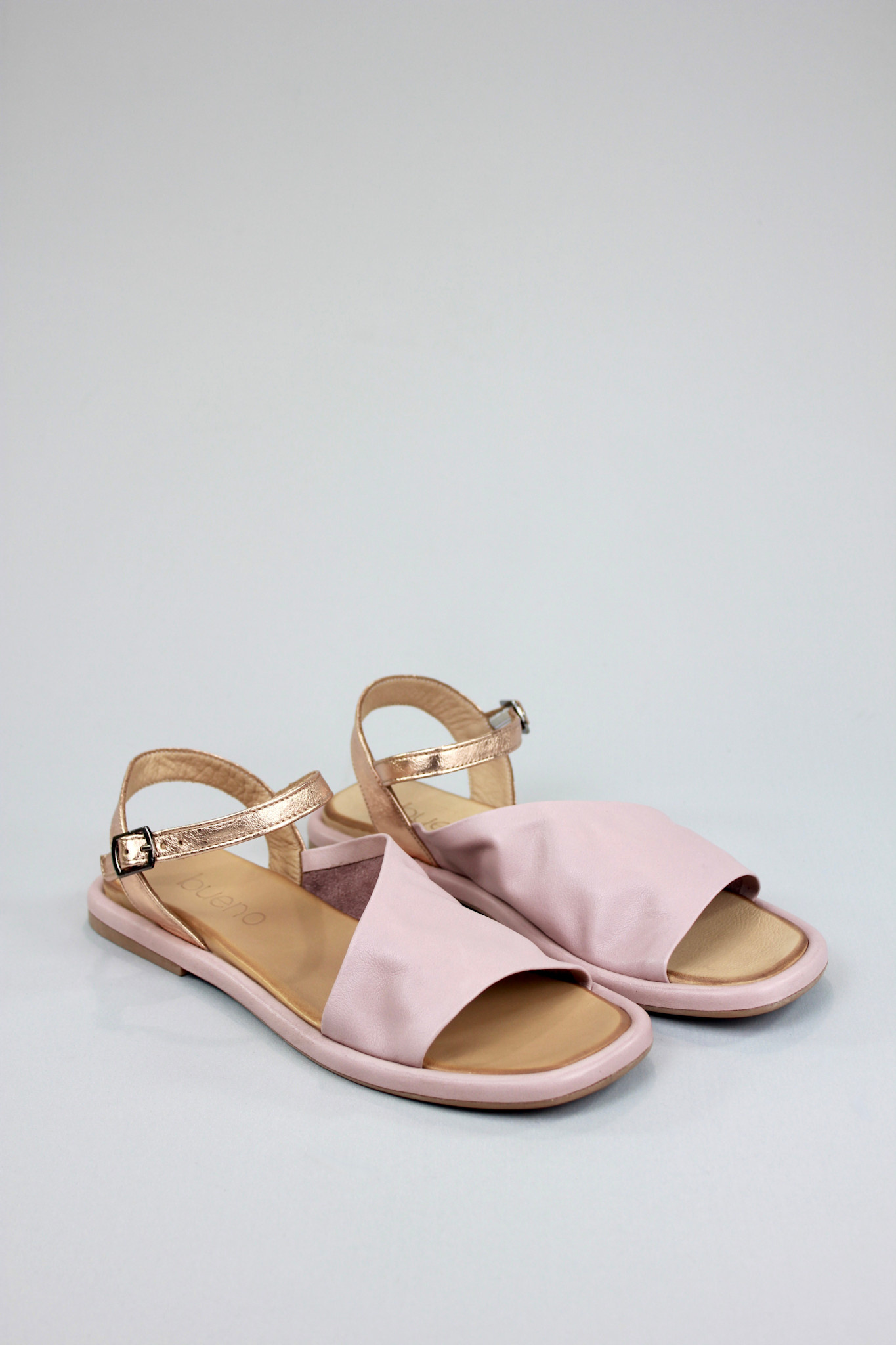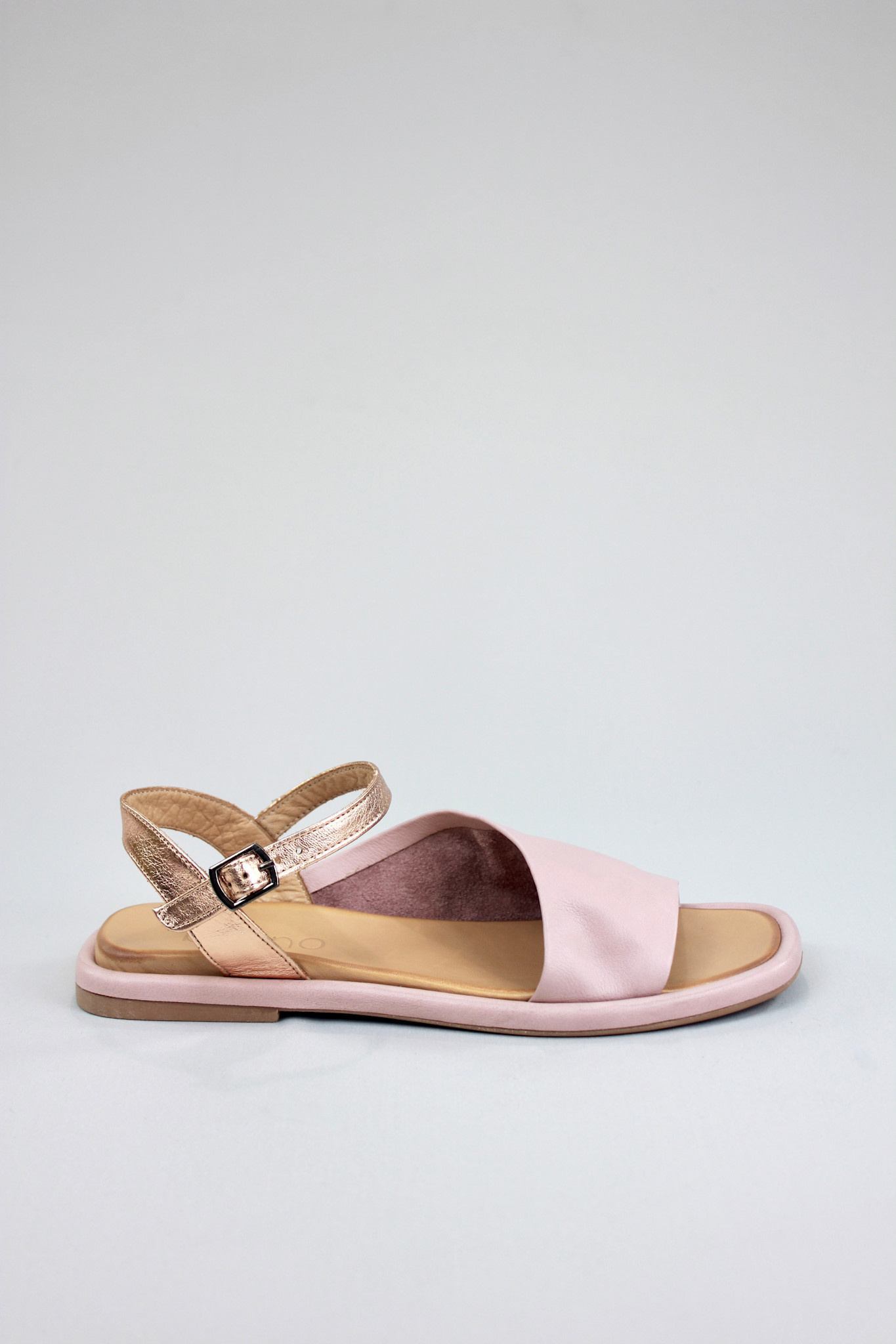 Flat sandal with a super soft leather bias cut upper in dusty mauve pink and contrasting metallic rose gold ankle strap
