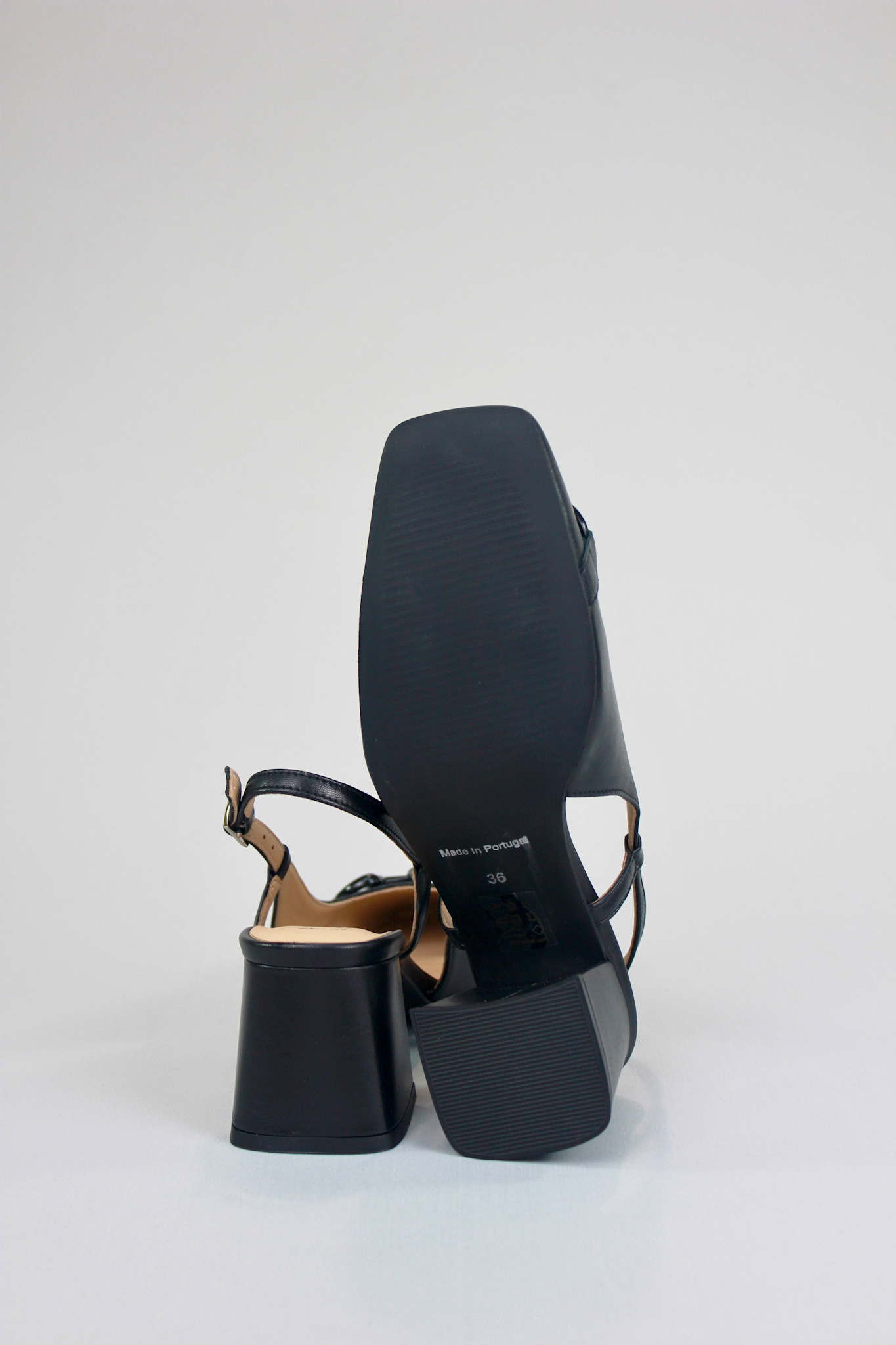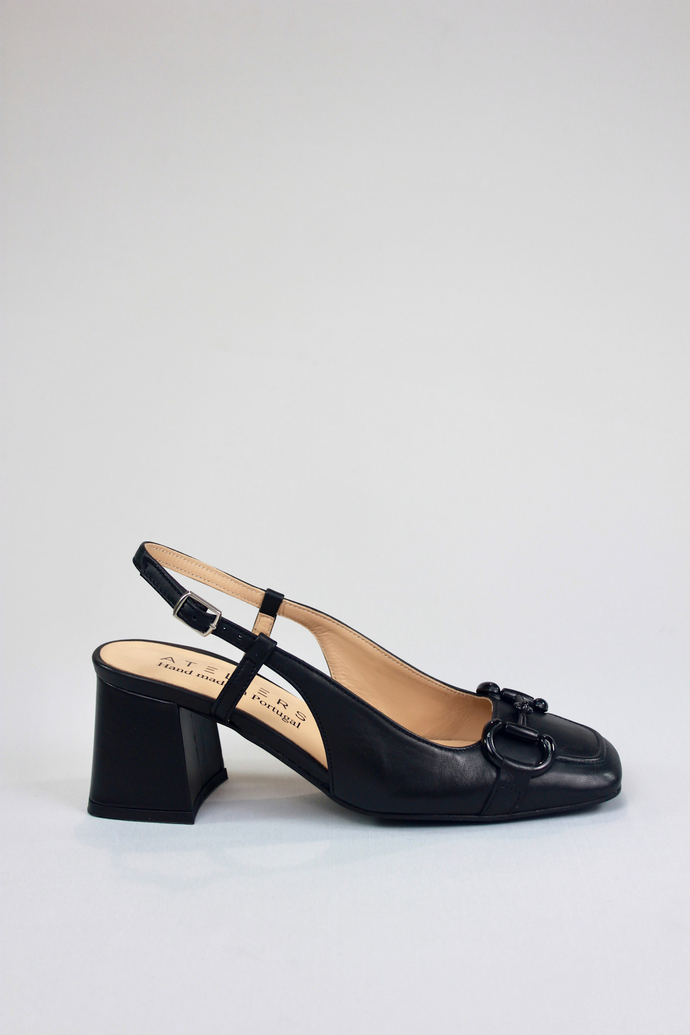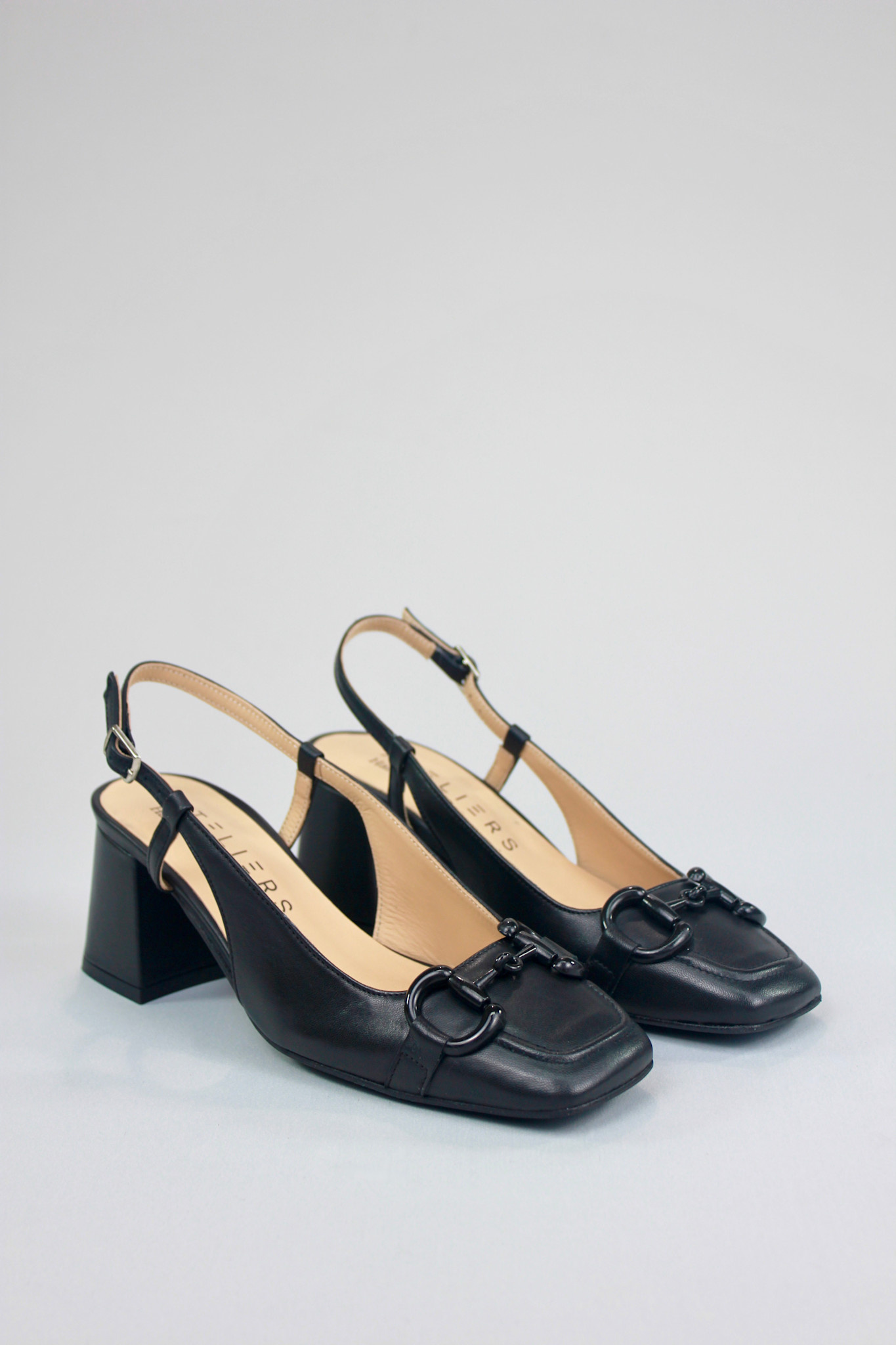 Elegant slingback pump in black leather with a flared block heel and square toe featuring a black metal loafer horsebit
