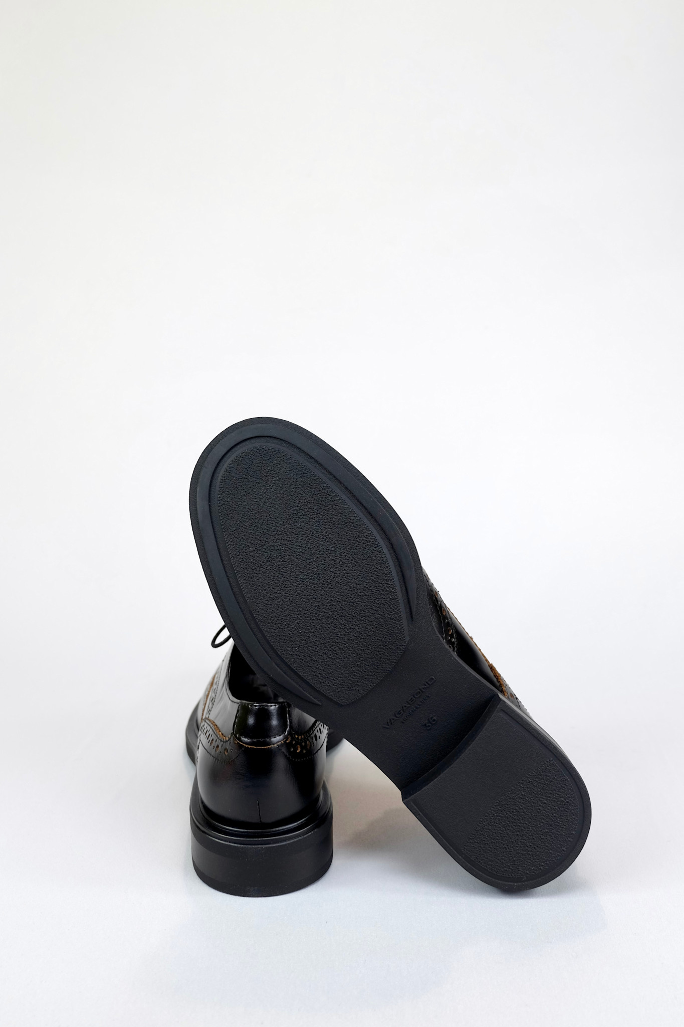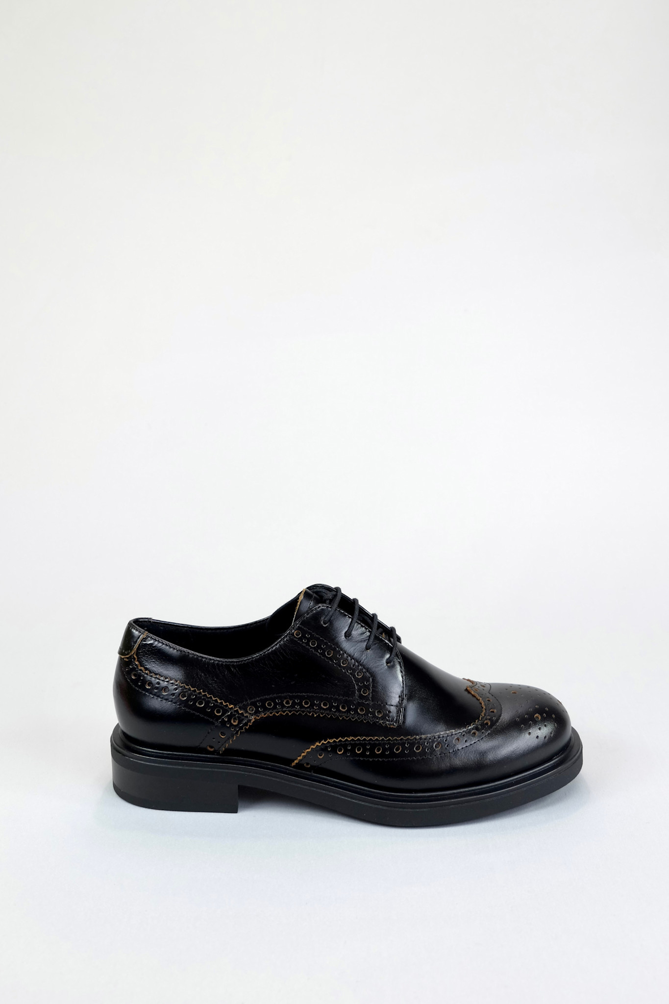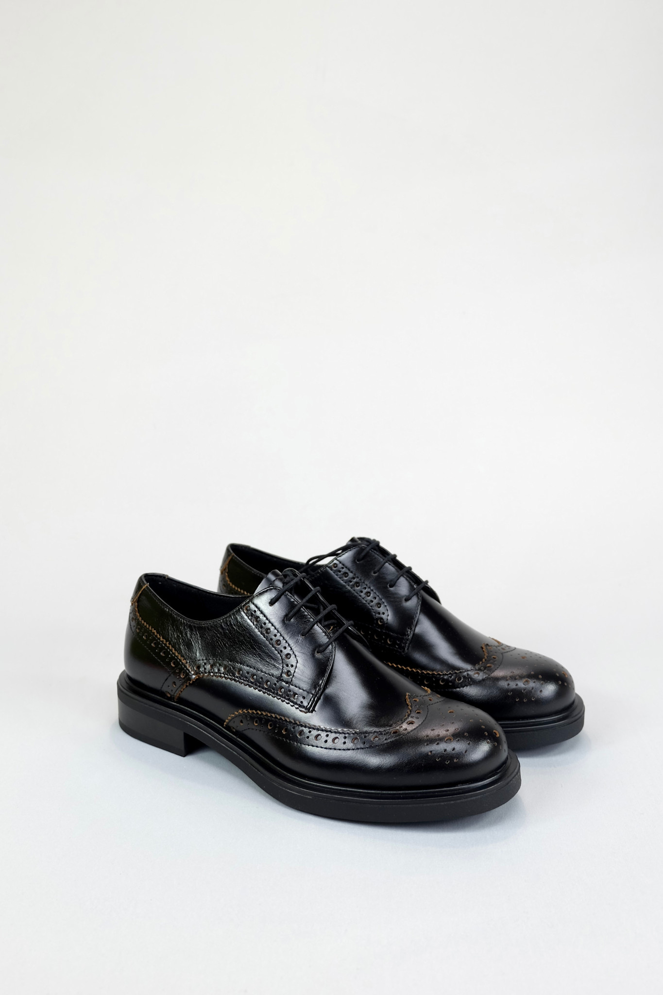 Menswear-inspired derby lace up shoe in black leather that is an effortless balance between dress wear and casual wear featuring classic brogue detailing with contrasting raw edges