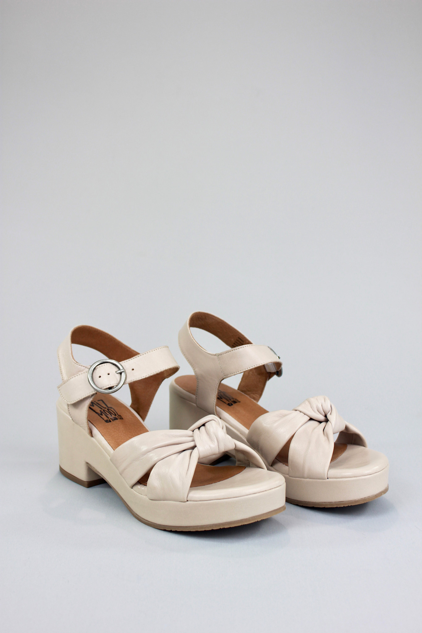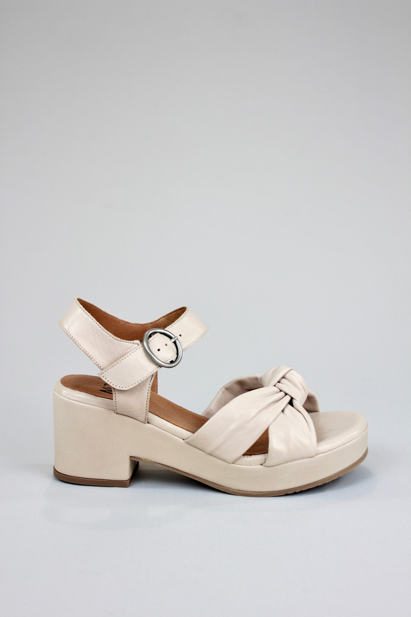 Platform sandal in soft cream leather with a buckled ankle strap and knotted cross strap detailing