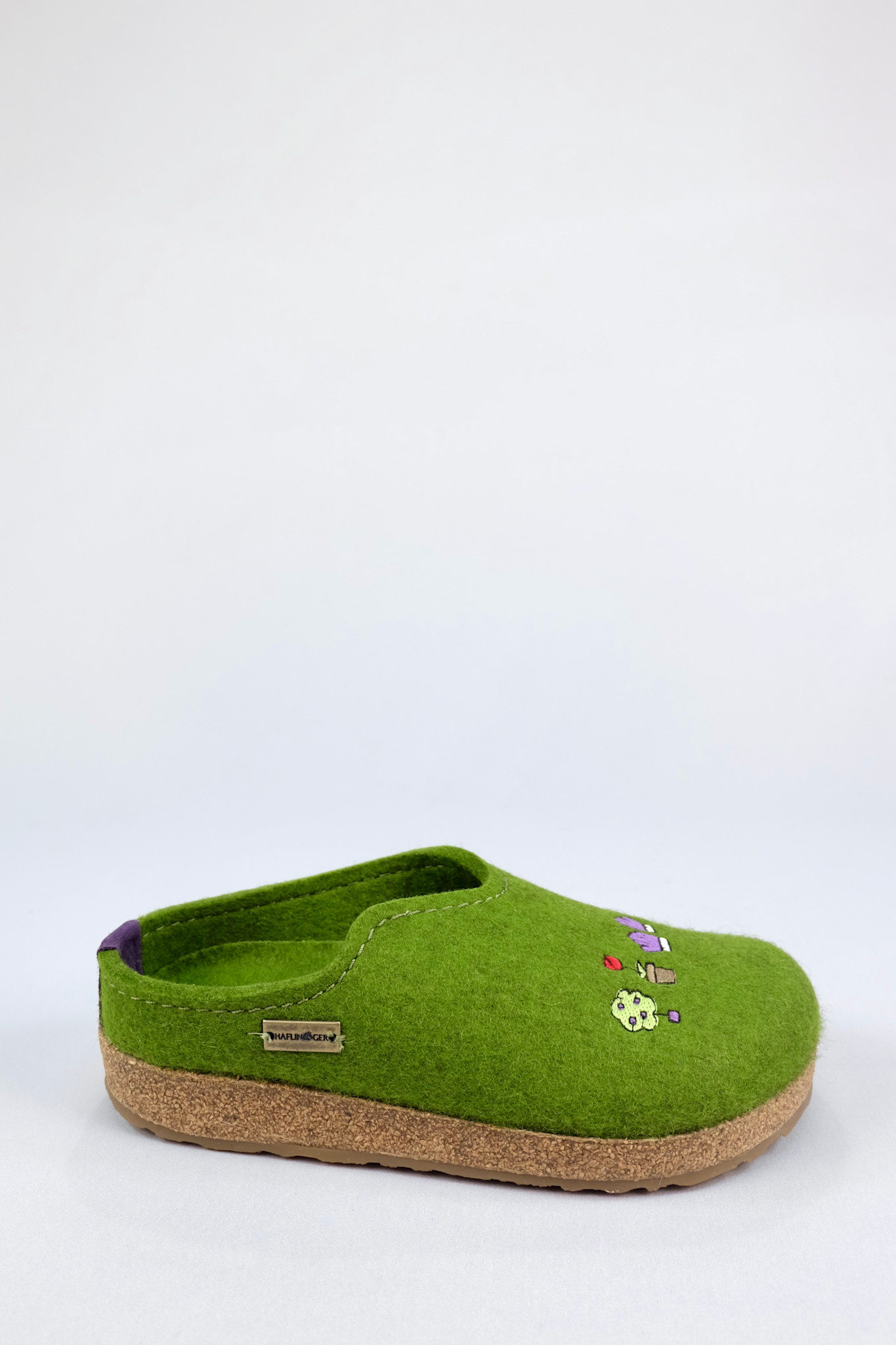 Felted wool slipper in green with an asymmetrical cut and adorable embroidered gardening theme on a cork-based clog construction with arch support