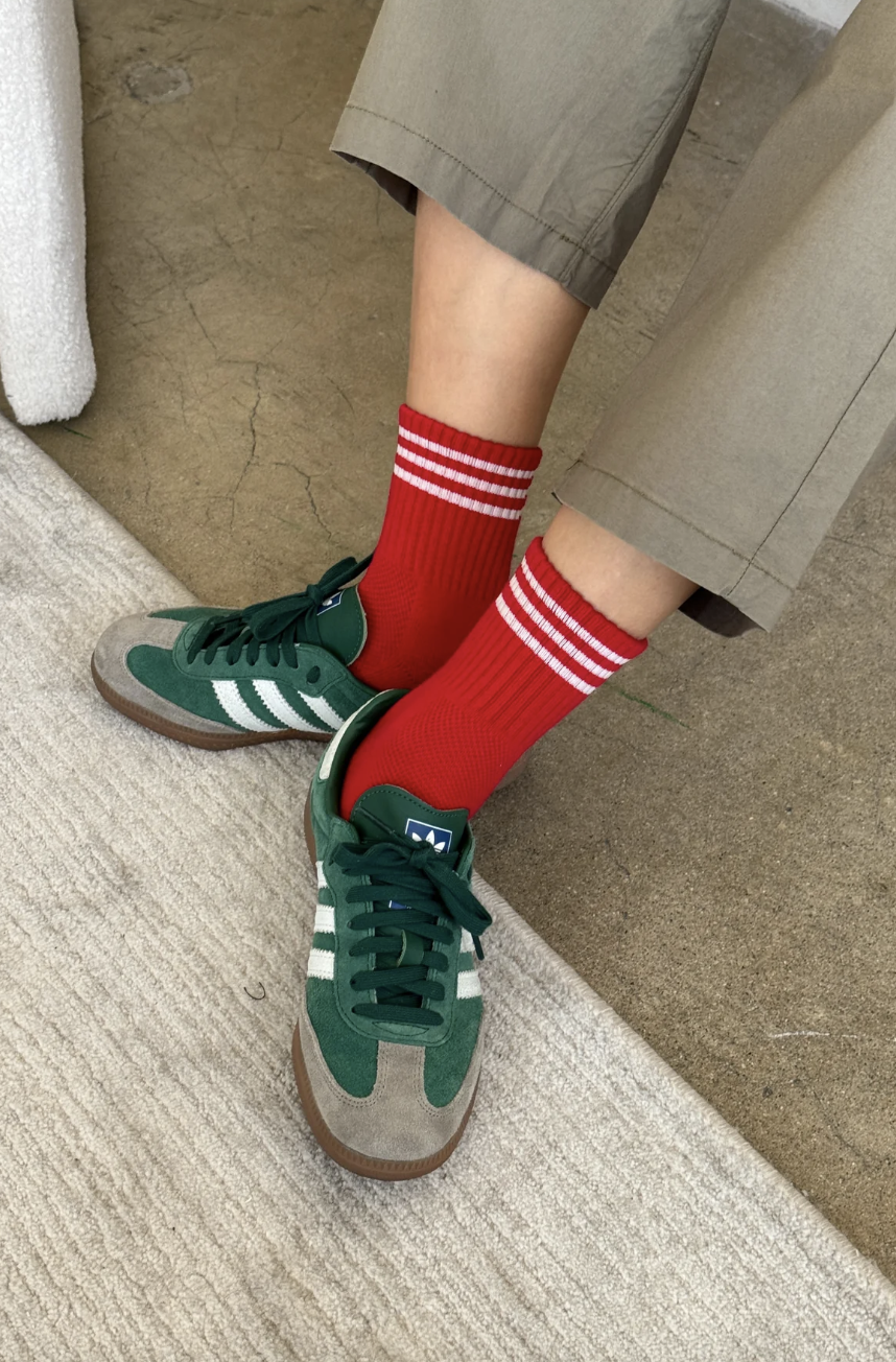 Cool quarter crew cotton blend athletic sock in red with a white triple contrast sport stripe along the ankle