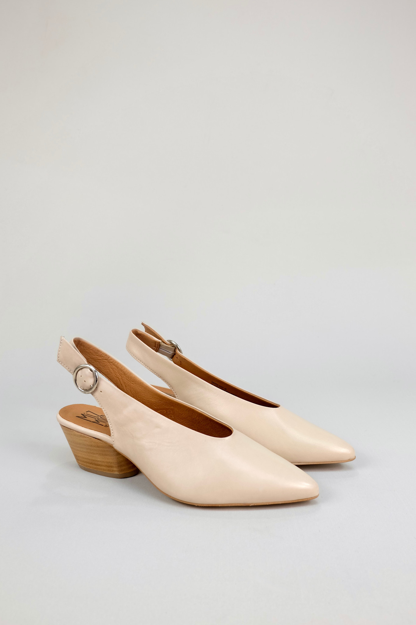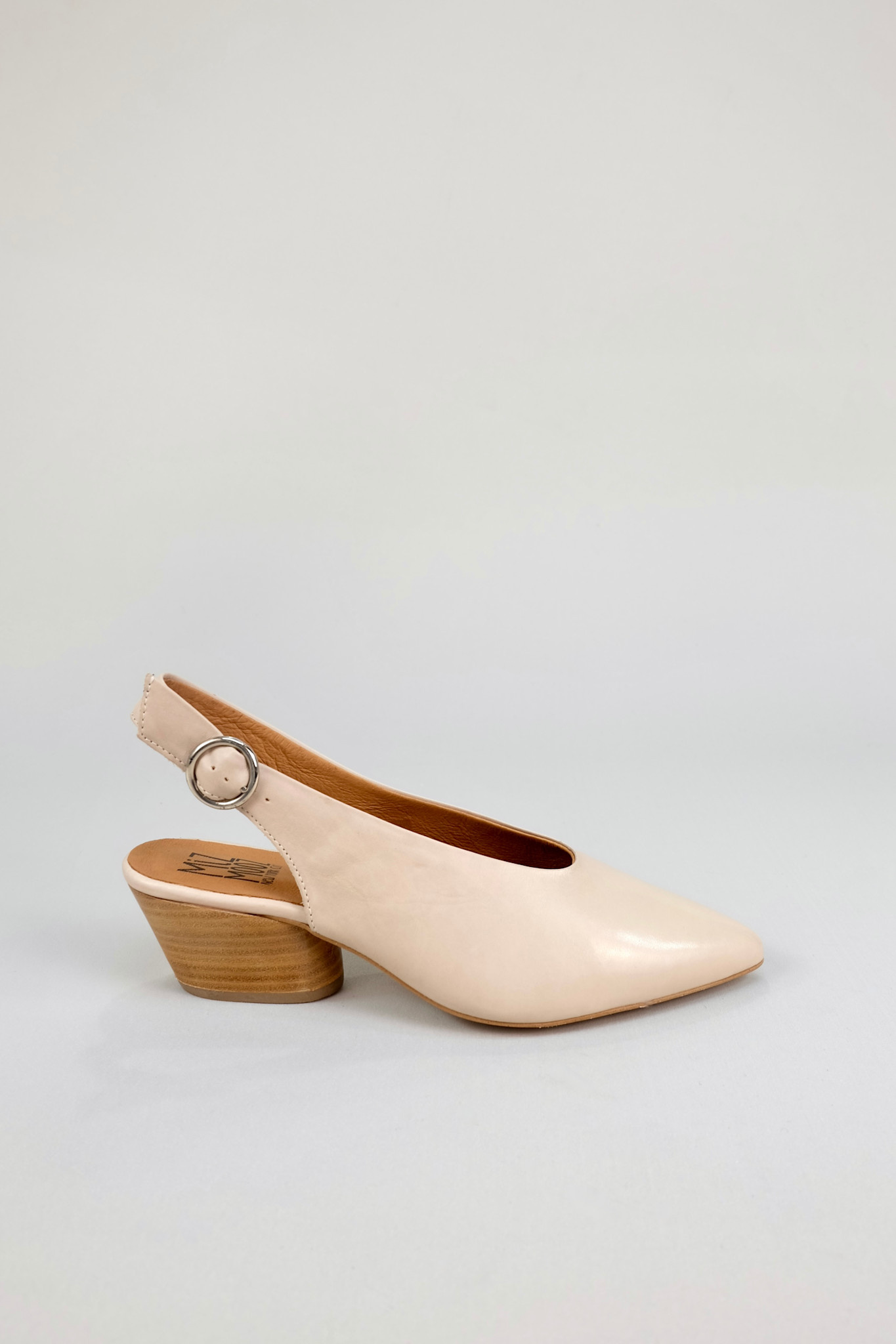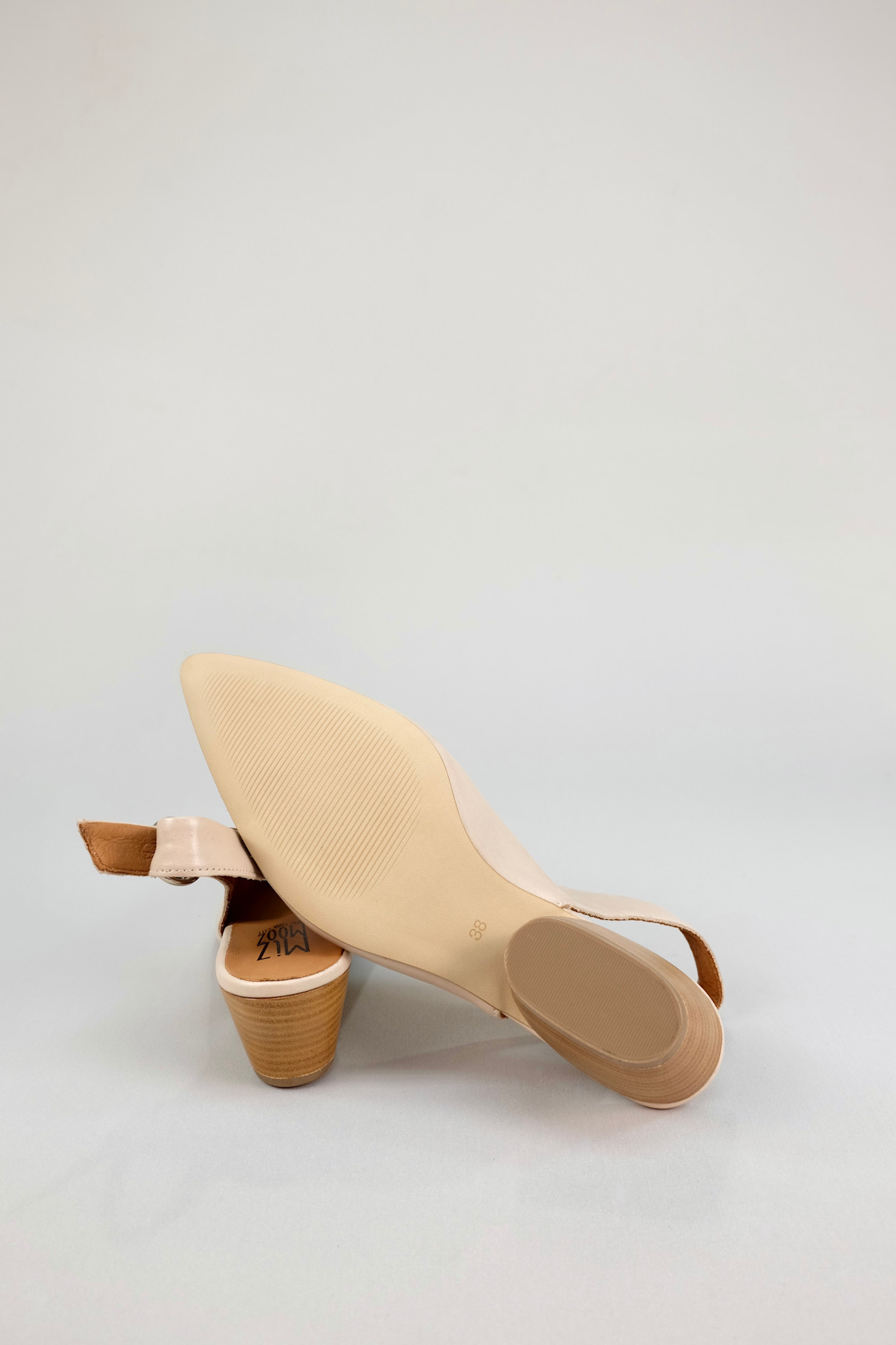 Pointed toe sling back dress shoe in light creamy beige soft leather with a comfortable sturdy angled block heel