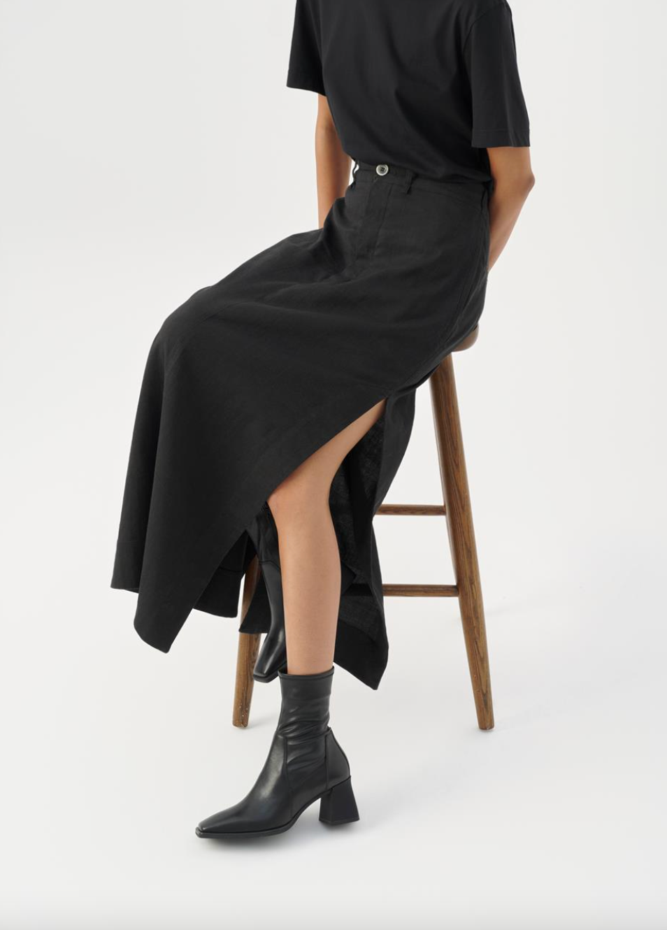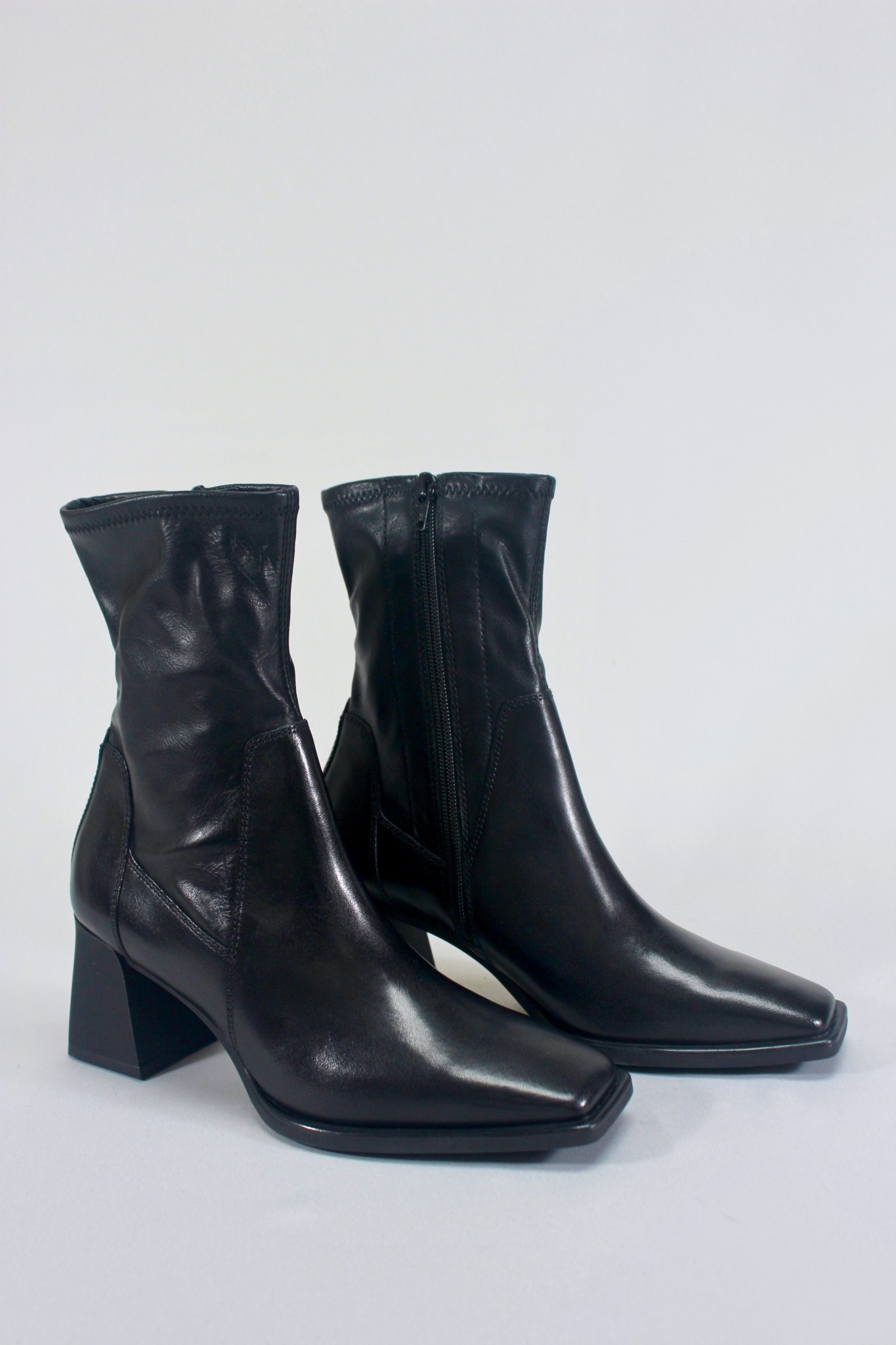 Sexy ankle boot with a square toe and flared block heel in black leather featuring a stretch material shaft for a sleek fit