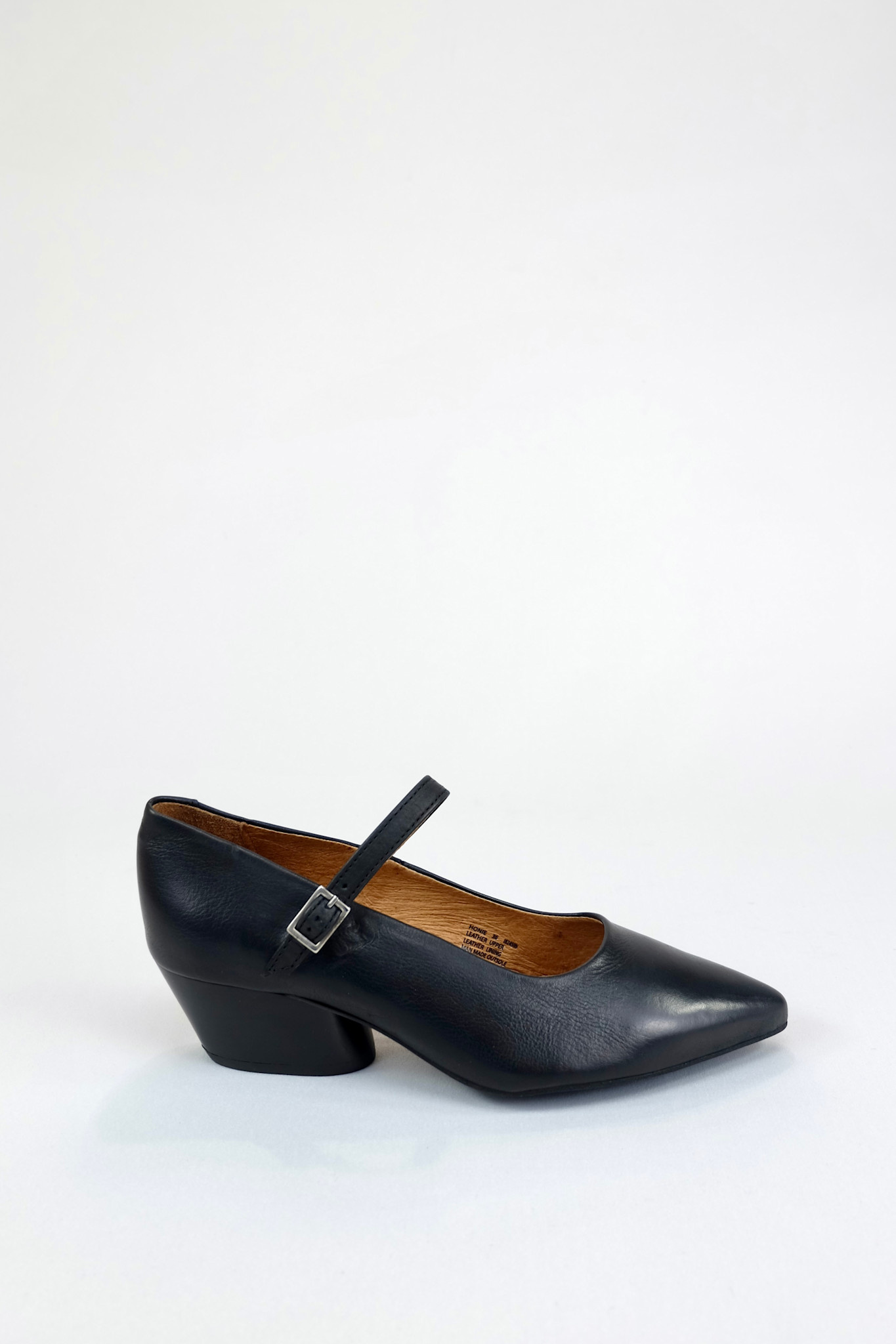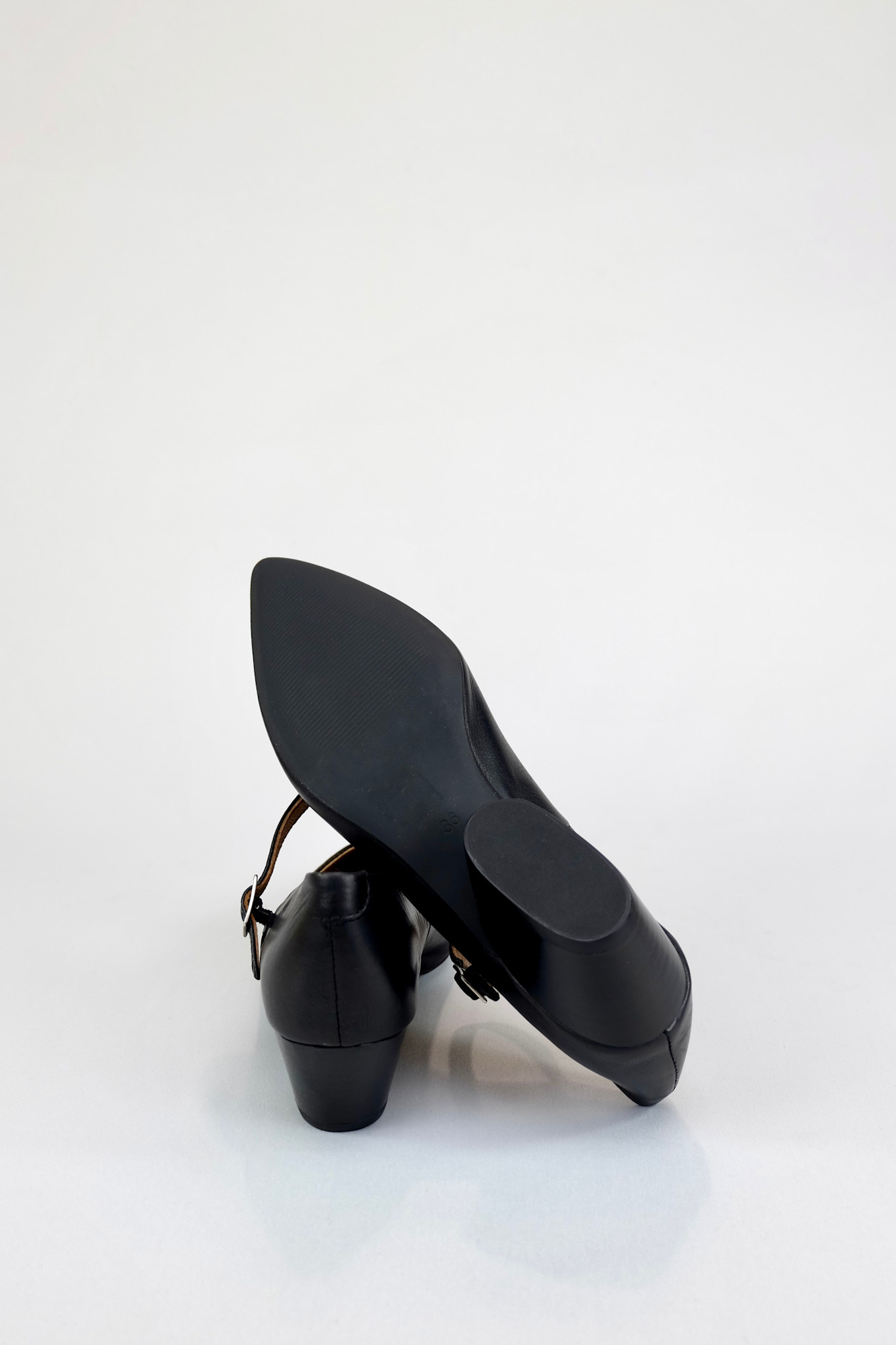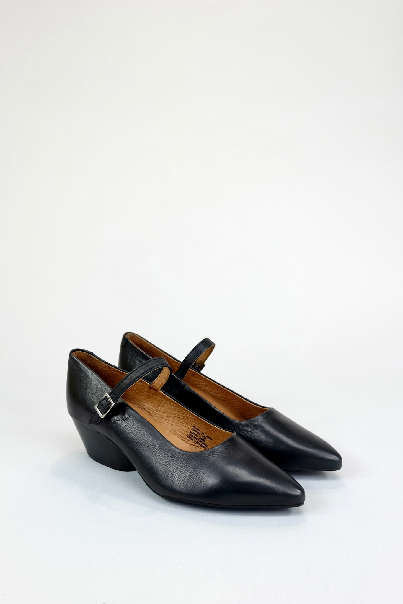Refined mary jane pump in soft black leather with a pointed toe and comfortable angled block heel