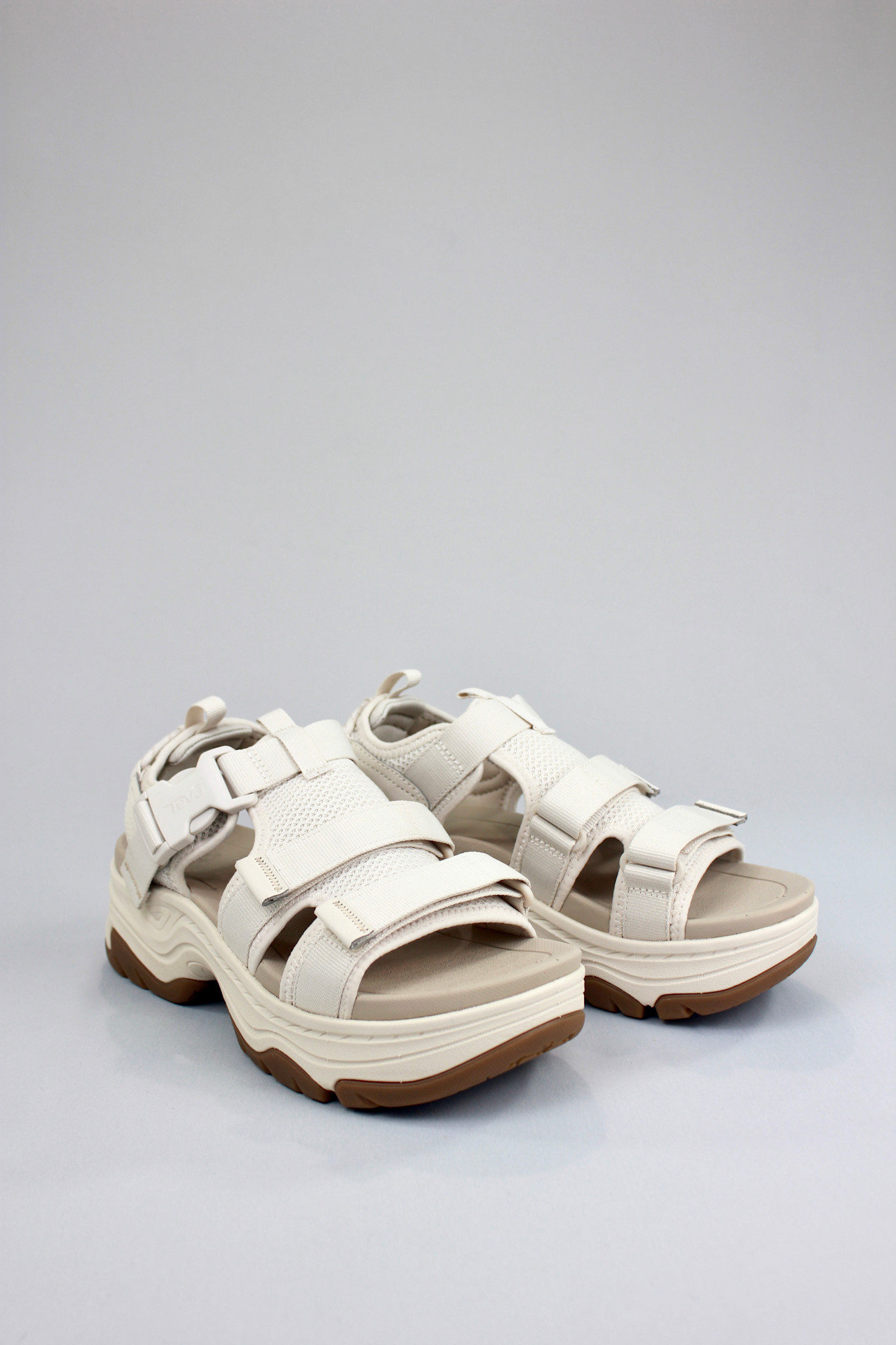 Sporty platform sandal in cream with design elements borrowed from hiking gear like padded mesh, velcro straps, and ticked elastic rope all on a high traction chunky sole