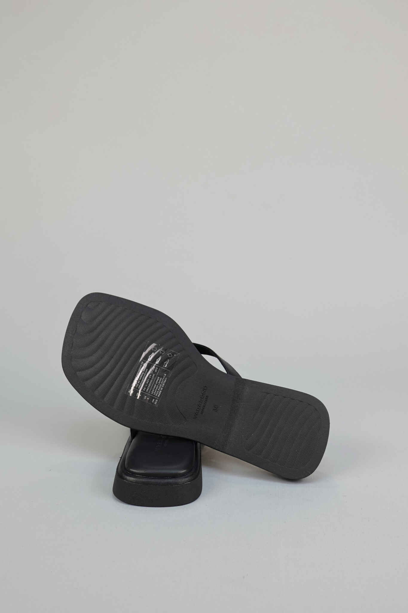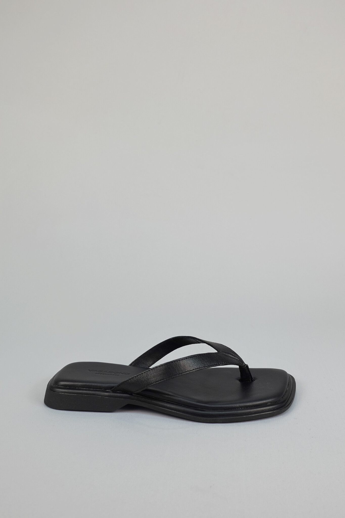 Sleek and streamlined flat flip flop sandal in black leather with a stylish square toe