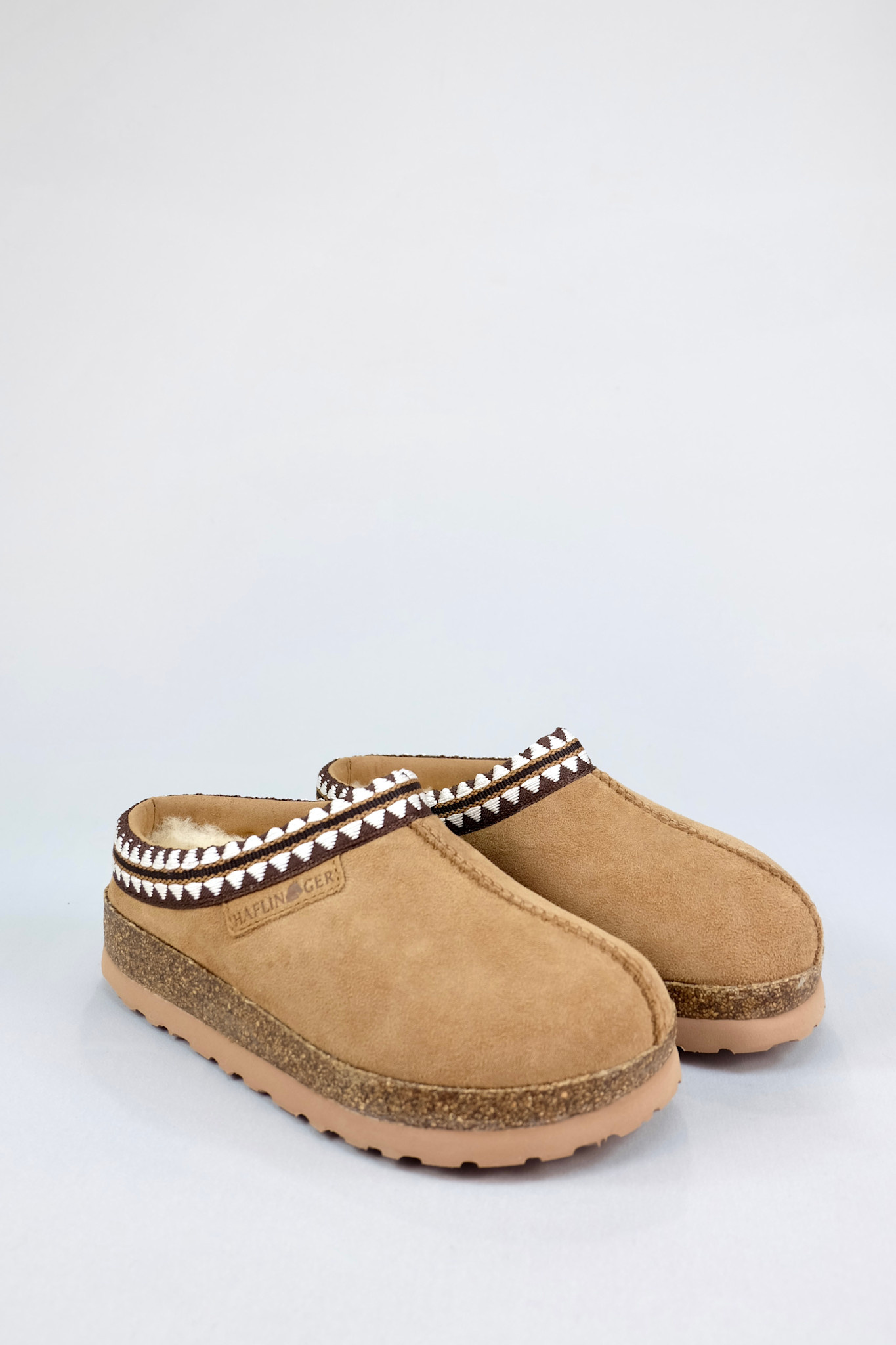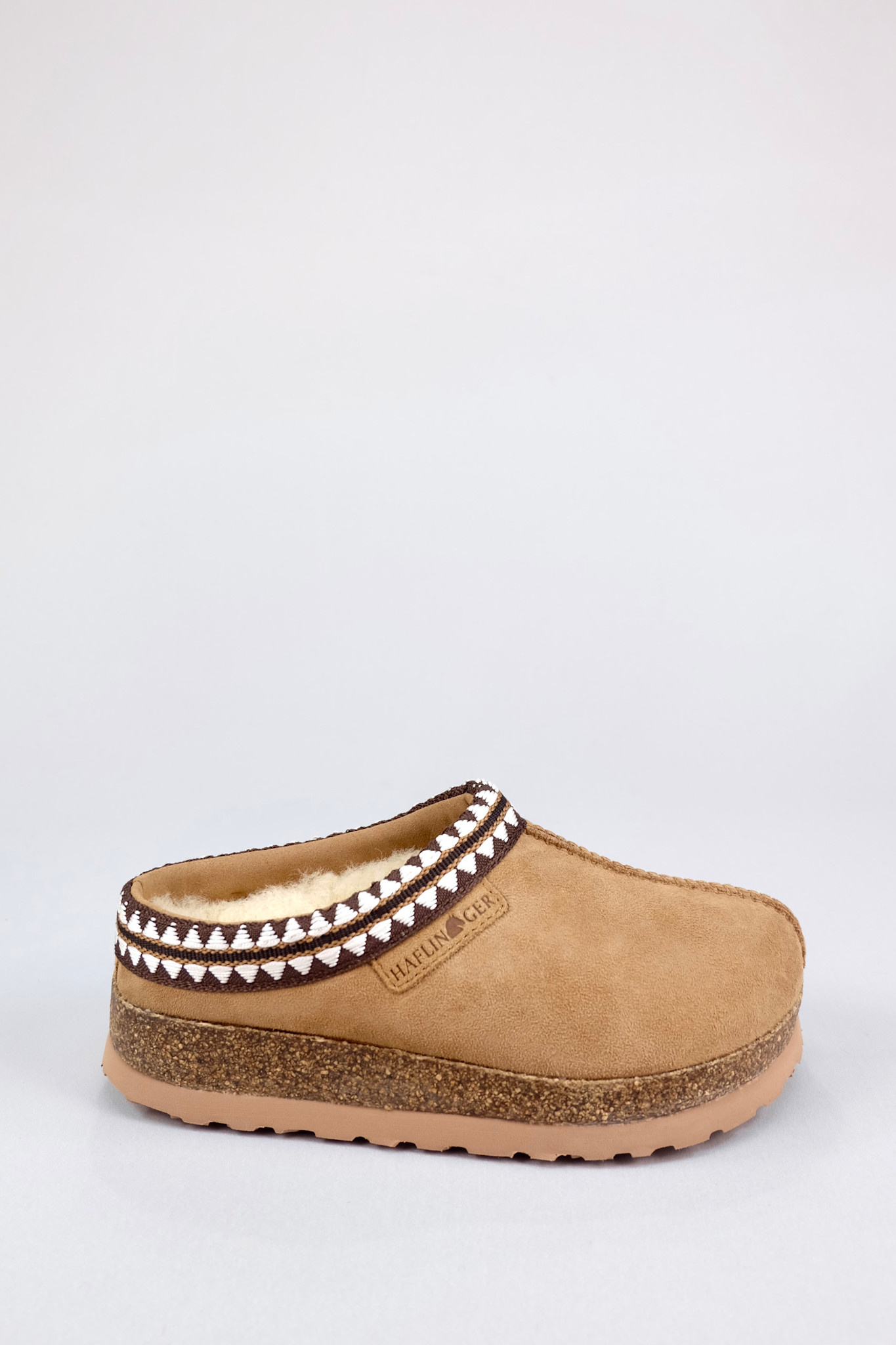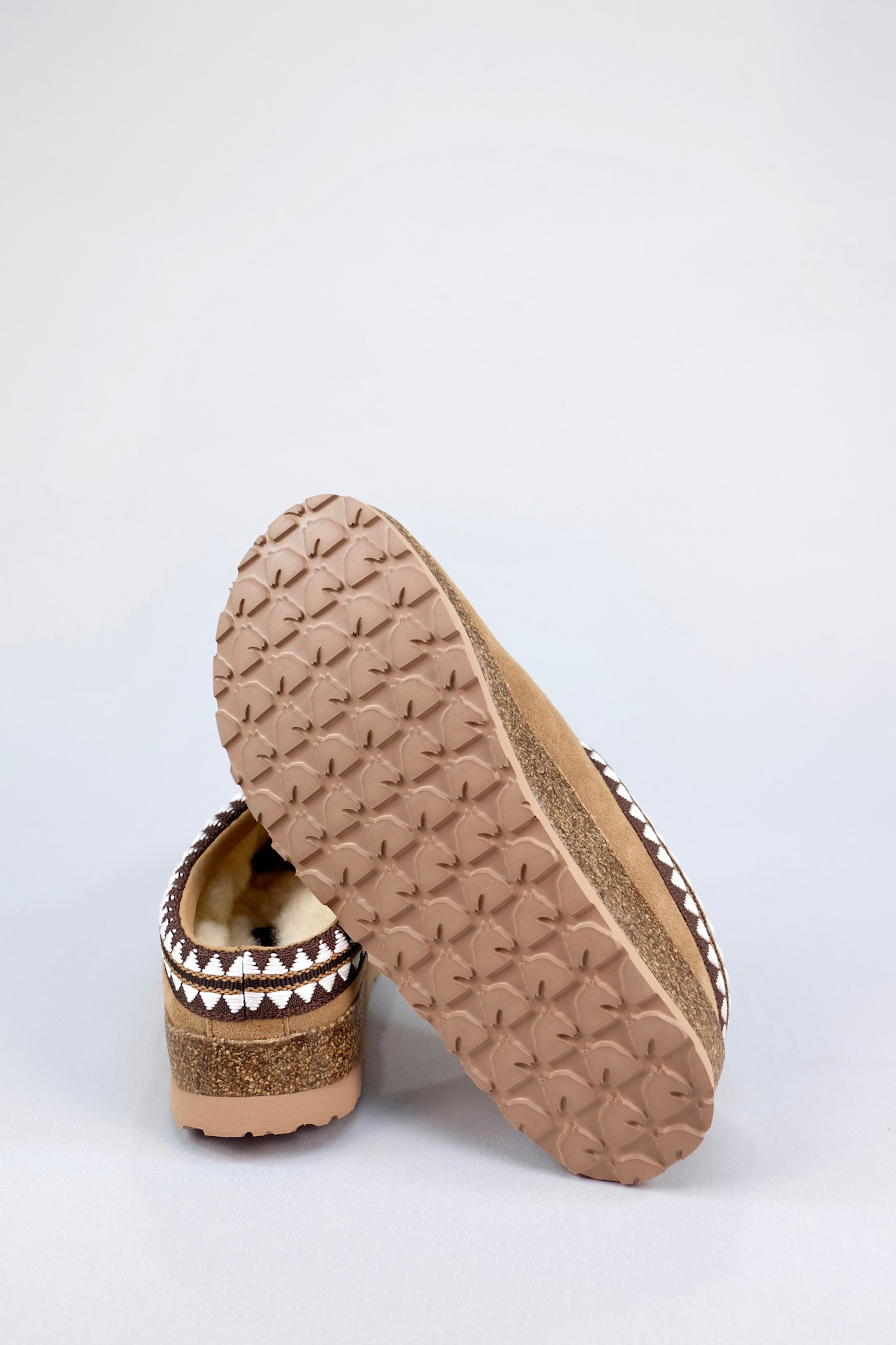 Create an accountLeather upper / shearling lining / cork blend midsole with eva outsole
