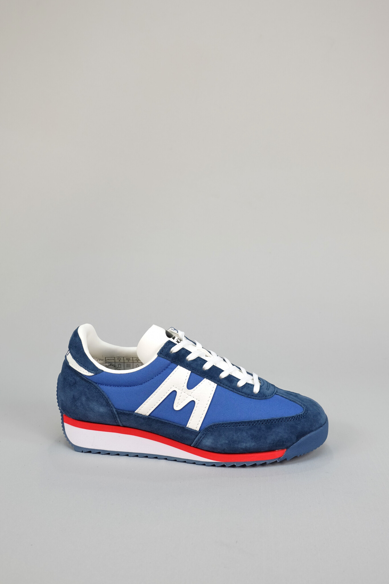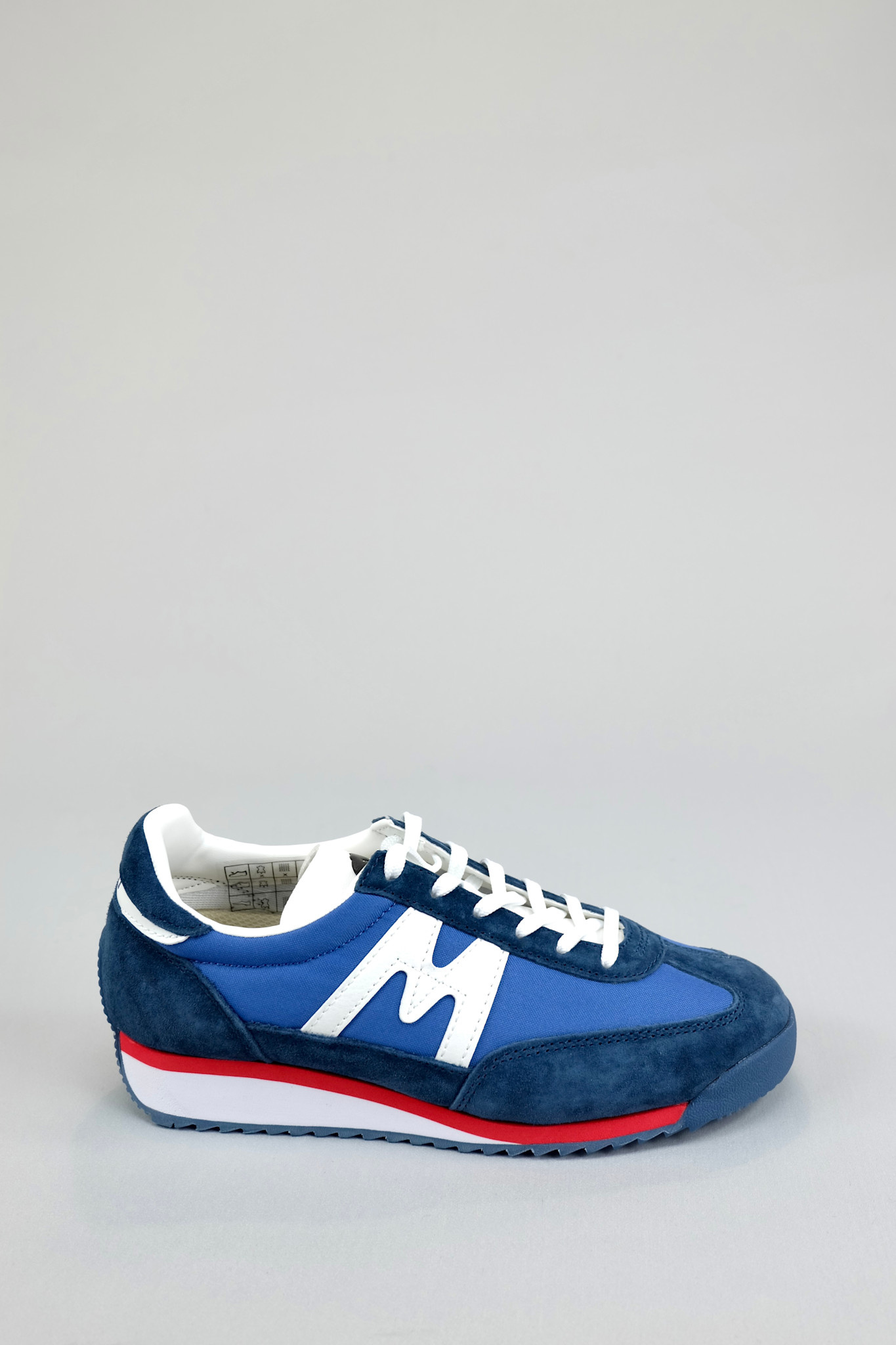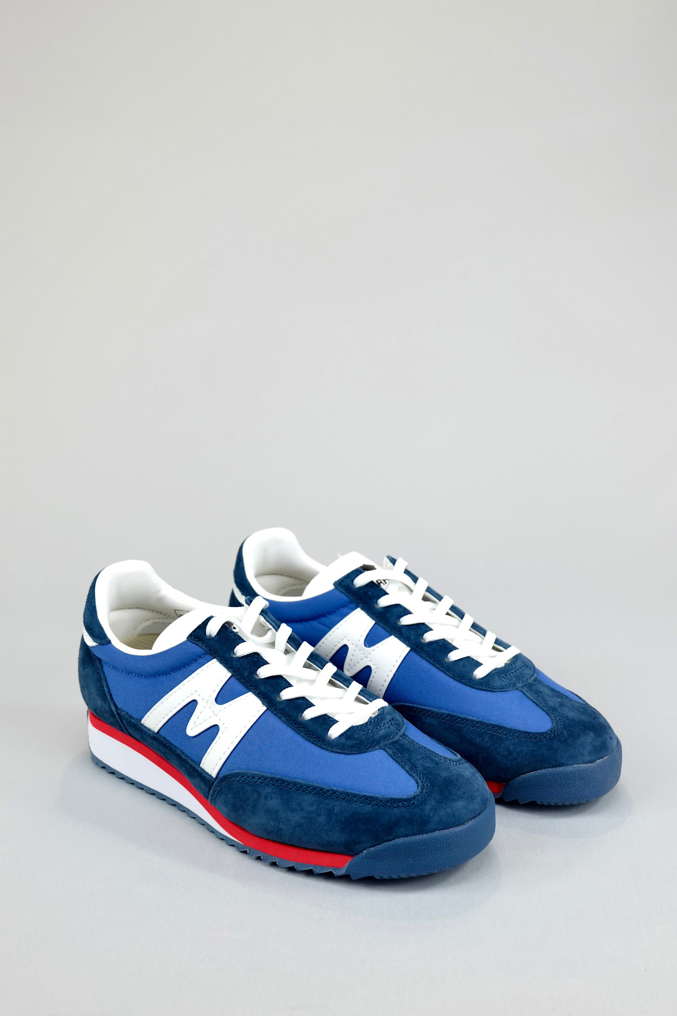 Lightweight and streamlined retro 70s lace up sneaker that is a rerelease of the original Mestari colourway in a mix of blue and white nylon and suede overlays with a pop of red