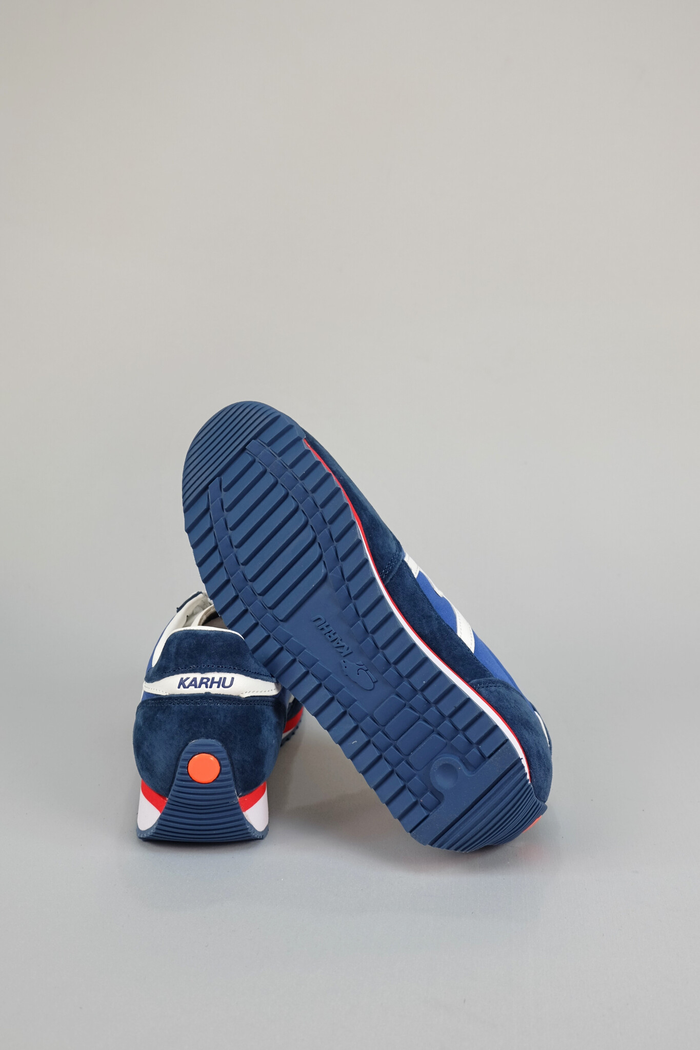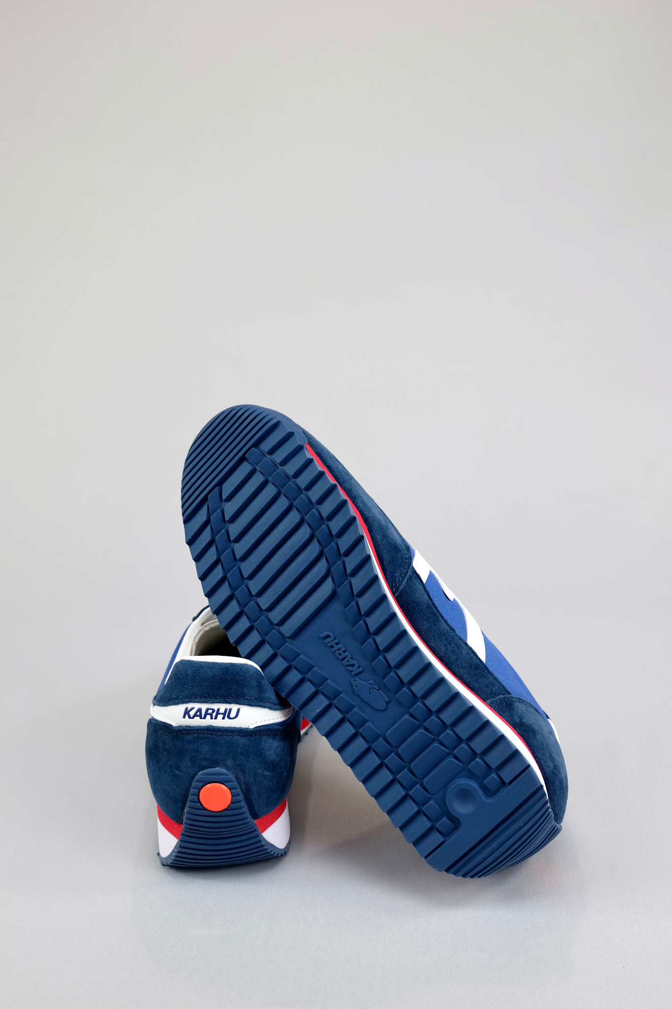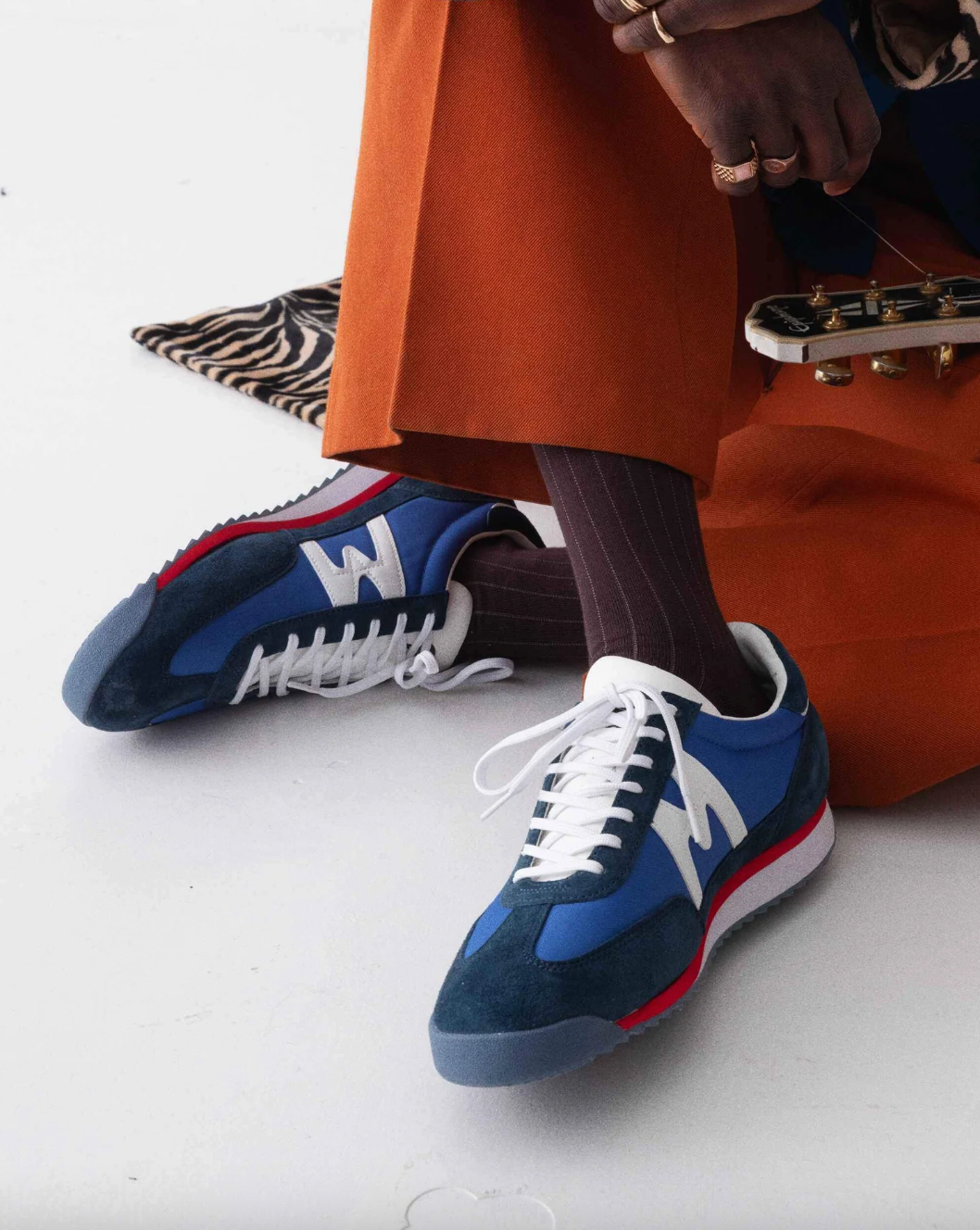 Lightweight and streamlined retro 70s lace up sneaker that is a rerelease of the original Mestari colourway in a mix of blue and white nylon and suede overlays with a pop of red