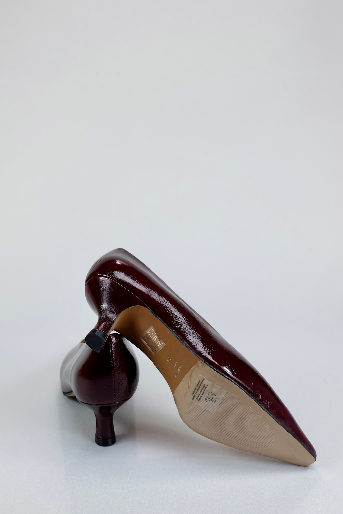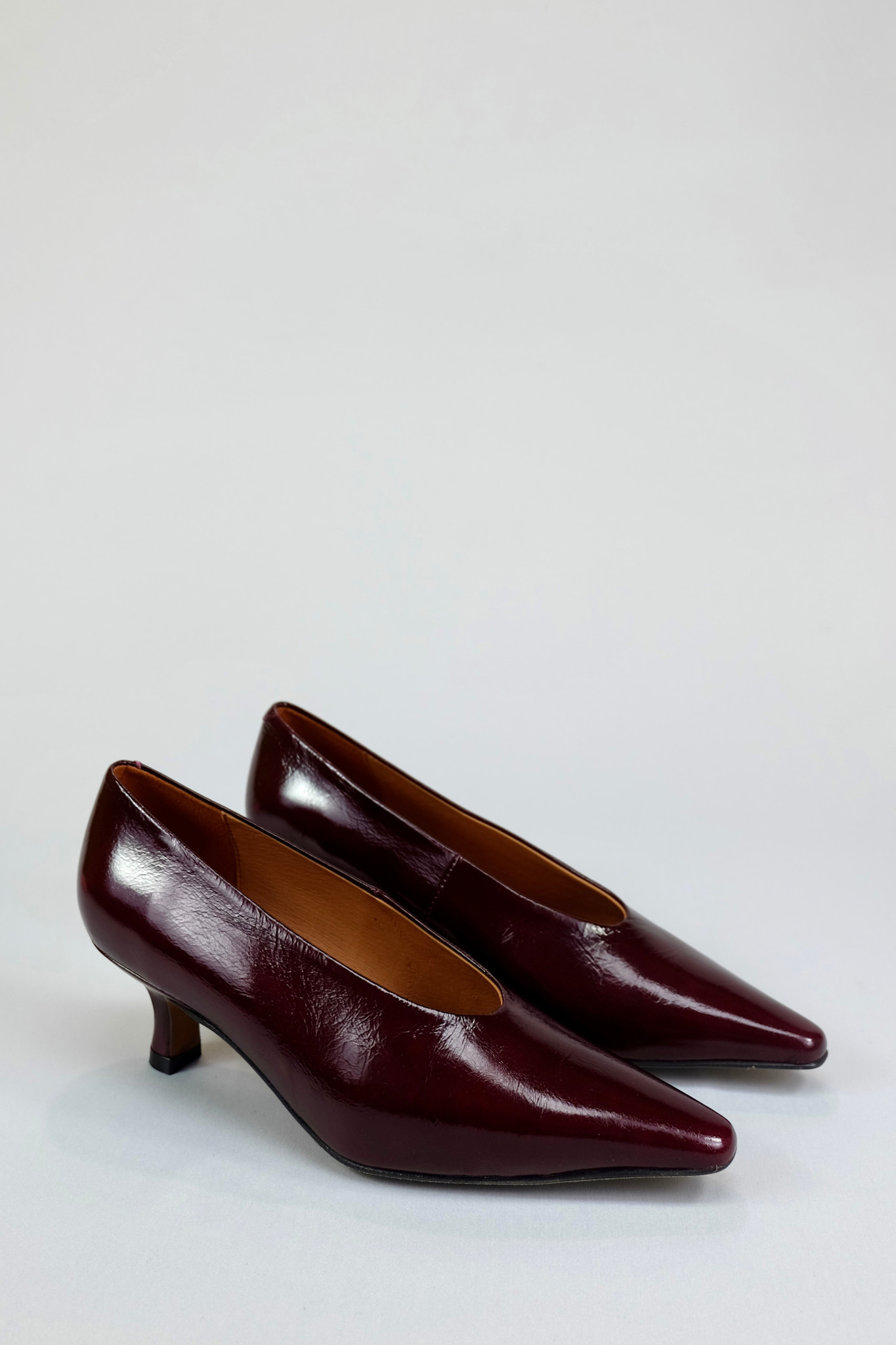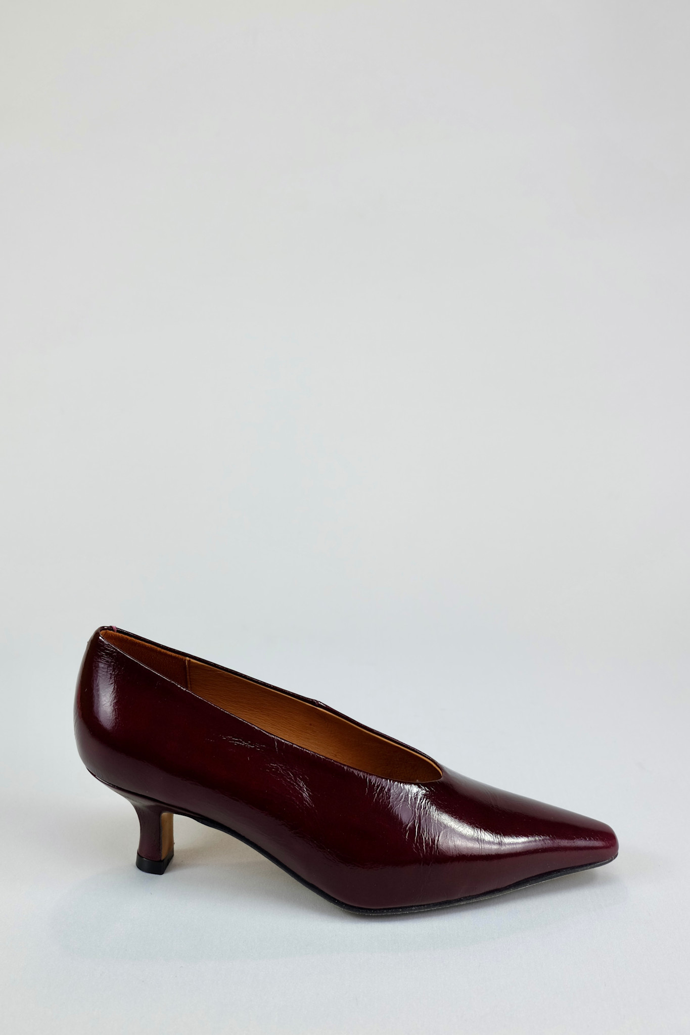 Elegant and sophisticated kitten heel pump in deep burgundy patent leather with a timeless pointed toe