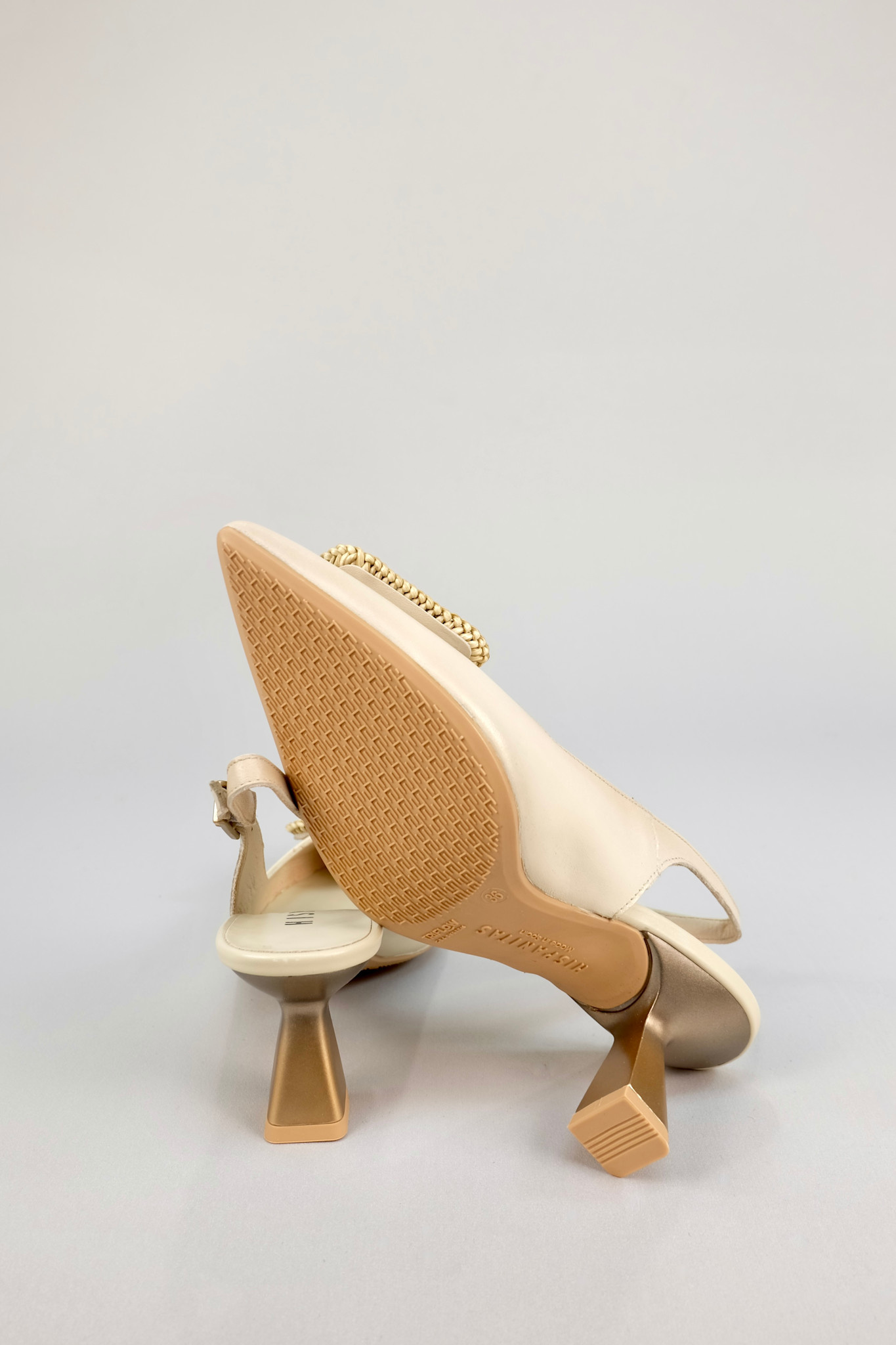 Elegant pointed toe slingback pump in light creamy beige leather with a wrapped square buckle accent