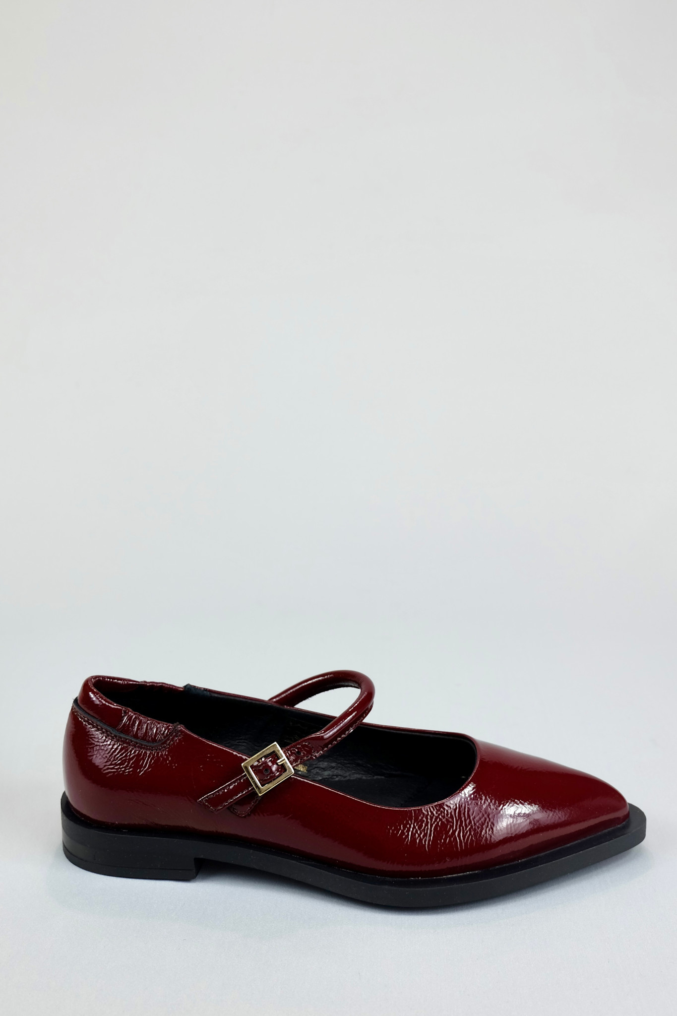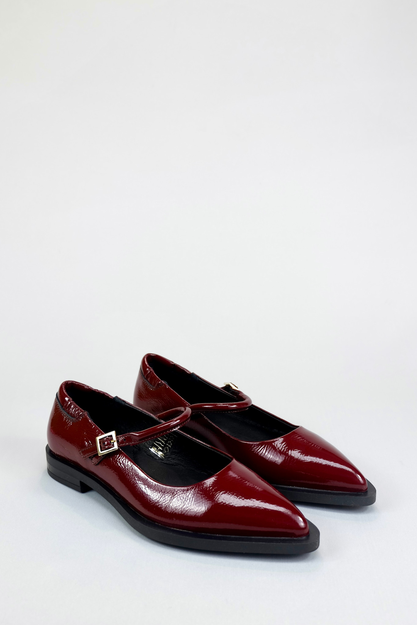Modern mary jane flat with a statement pointed toe and scrunched elastic back in a trendy wine red patent leather