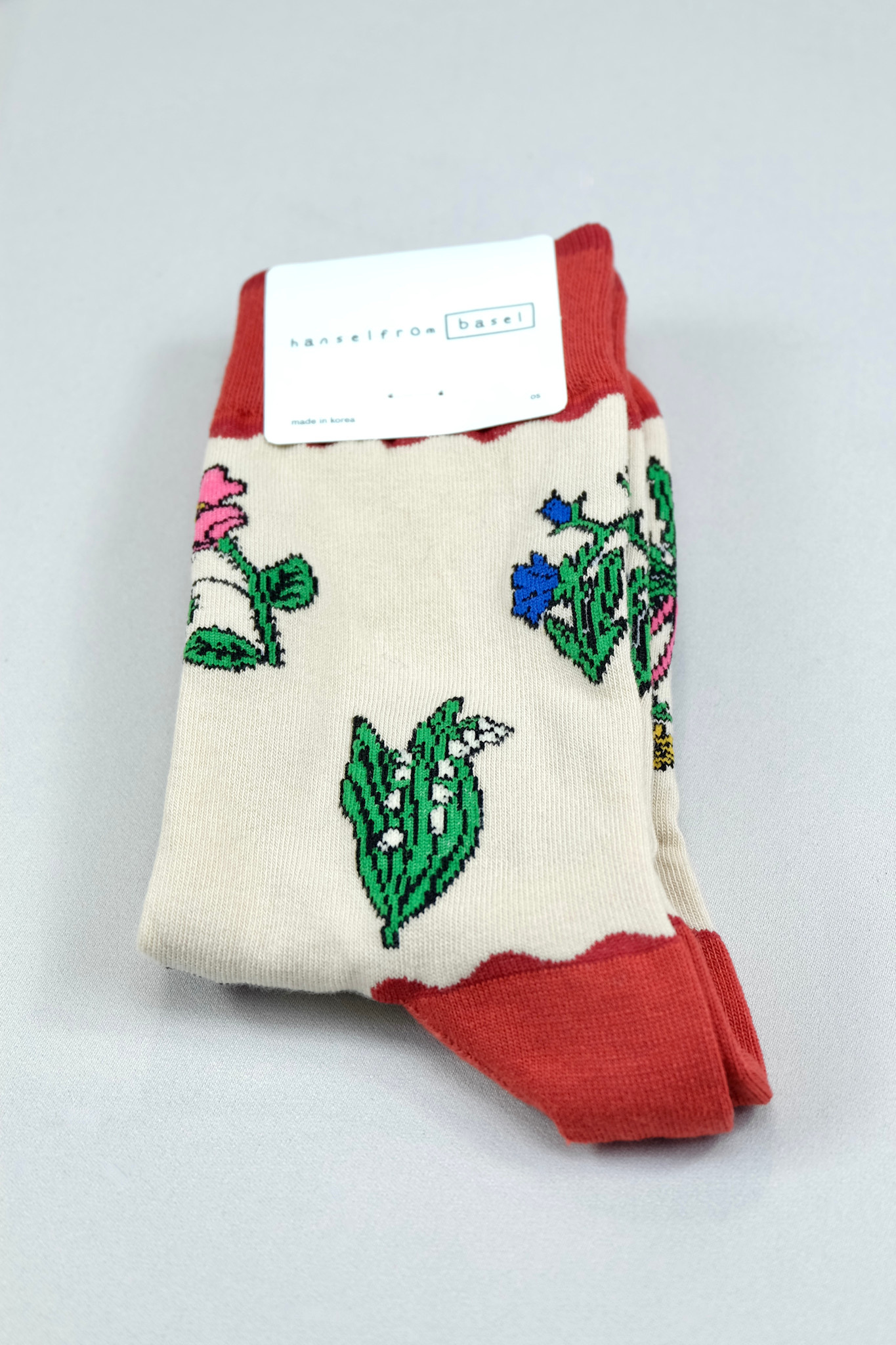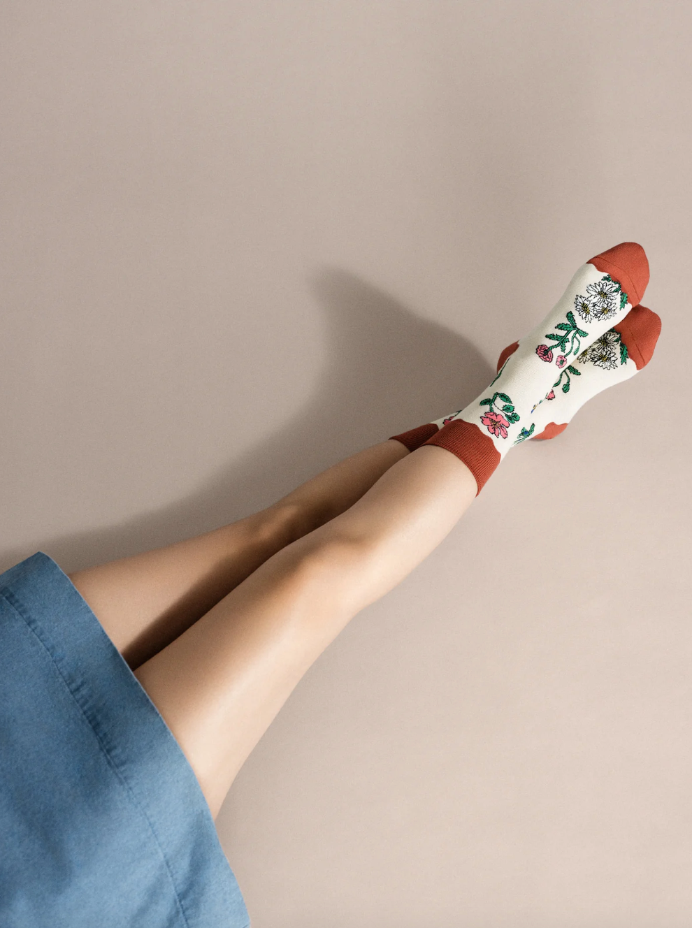 Lovely cream and rust cotton blend crew sock with a 70s-inspired botanical print
