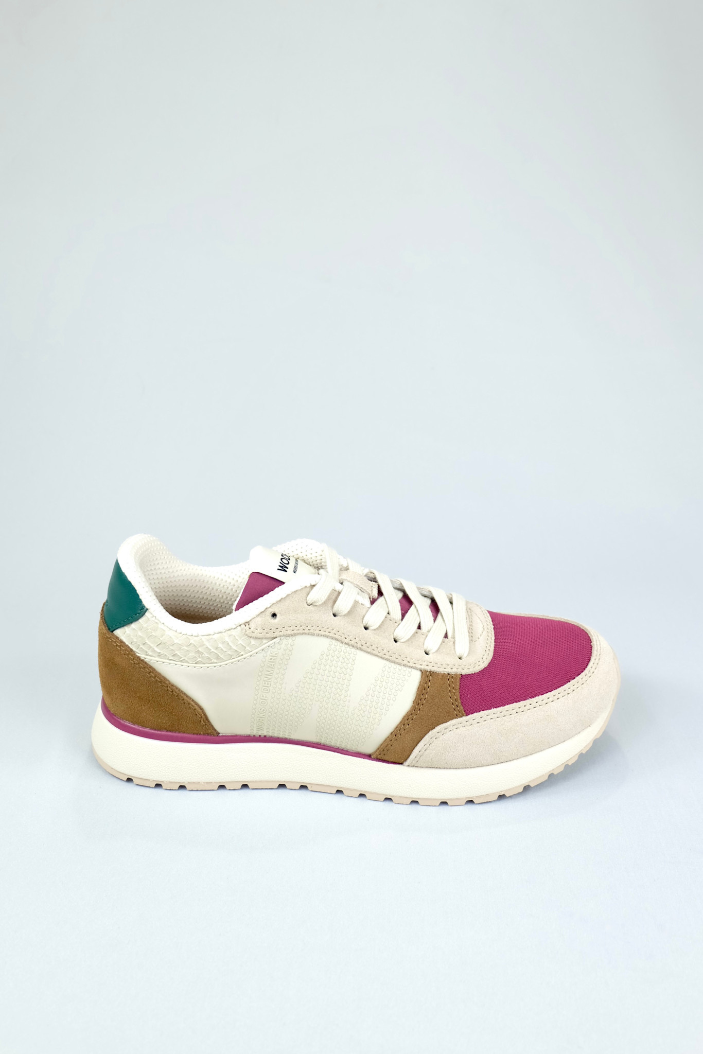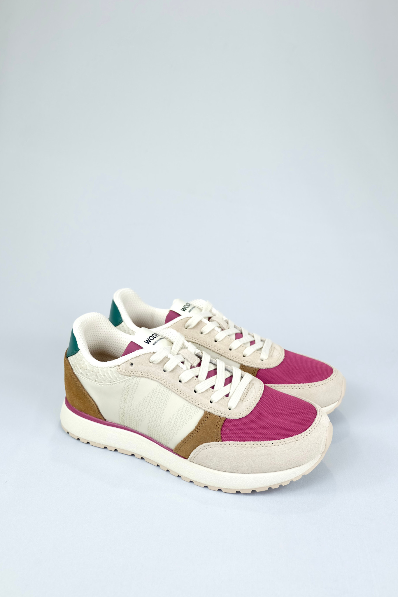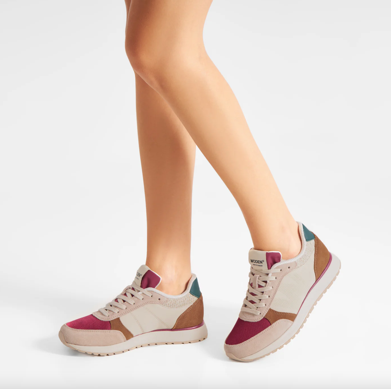 Sporty lace up sneaker featuring an easy combo of light neutrals and rich berry and autumnal shades in a mix of suede and recycled textile panels with fish leather accents (runs a size small)