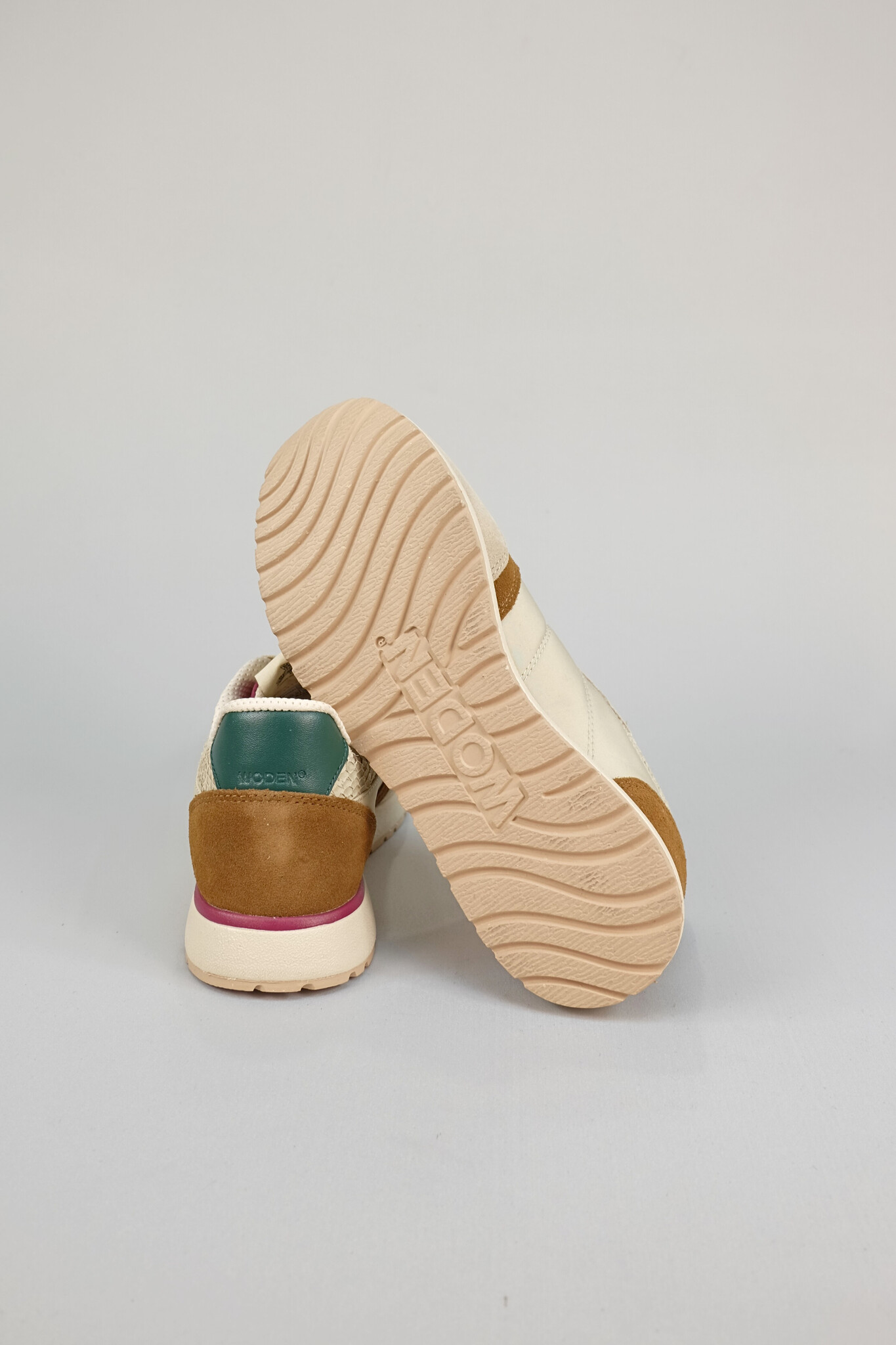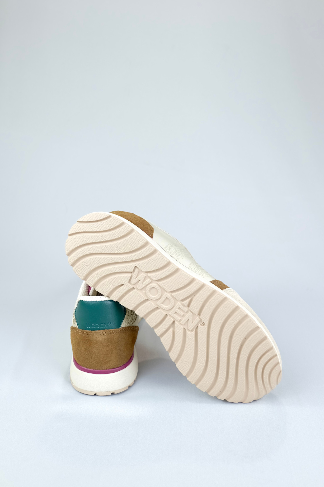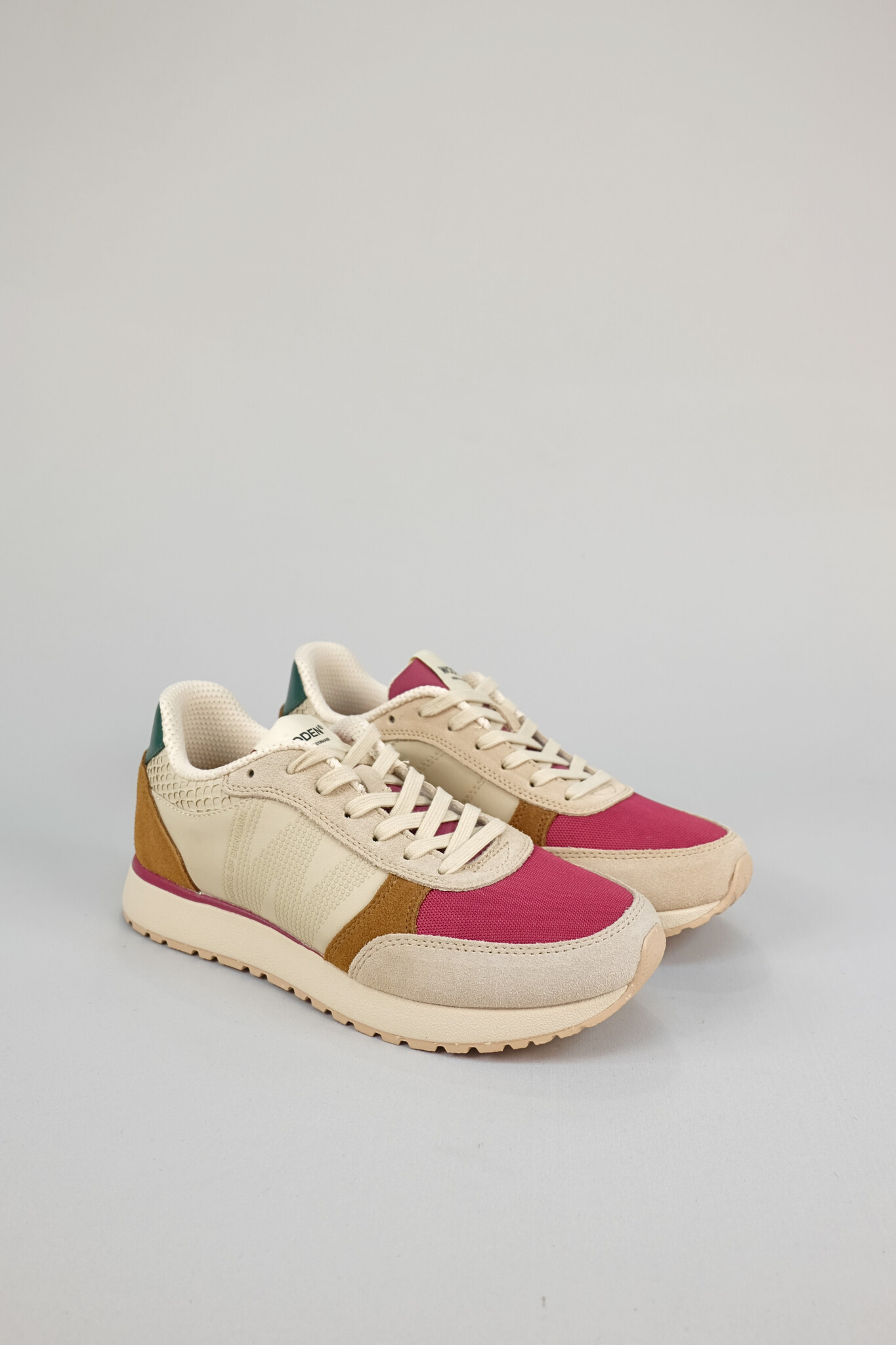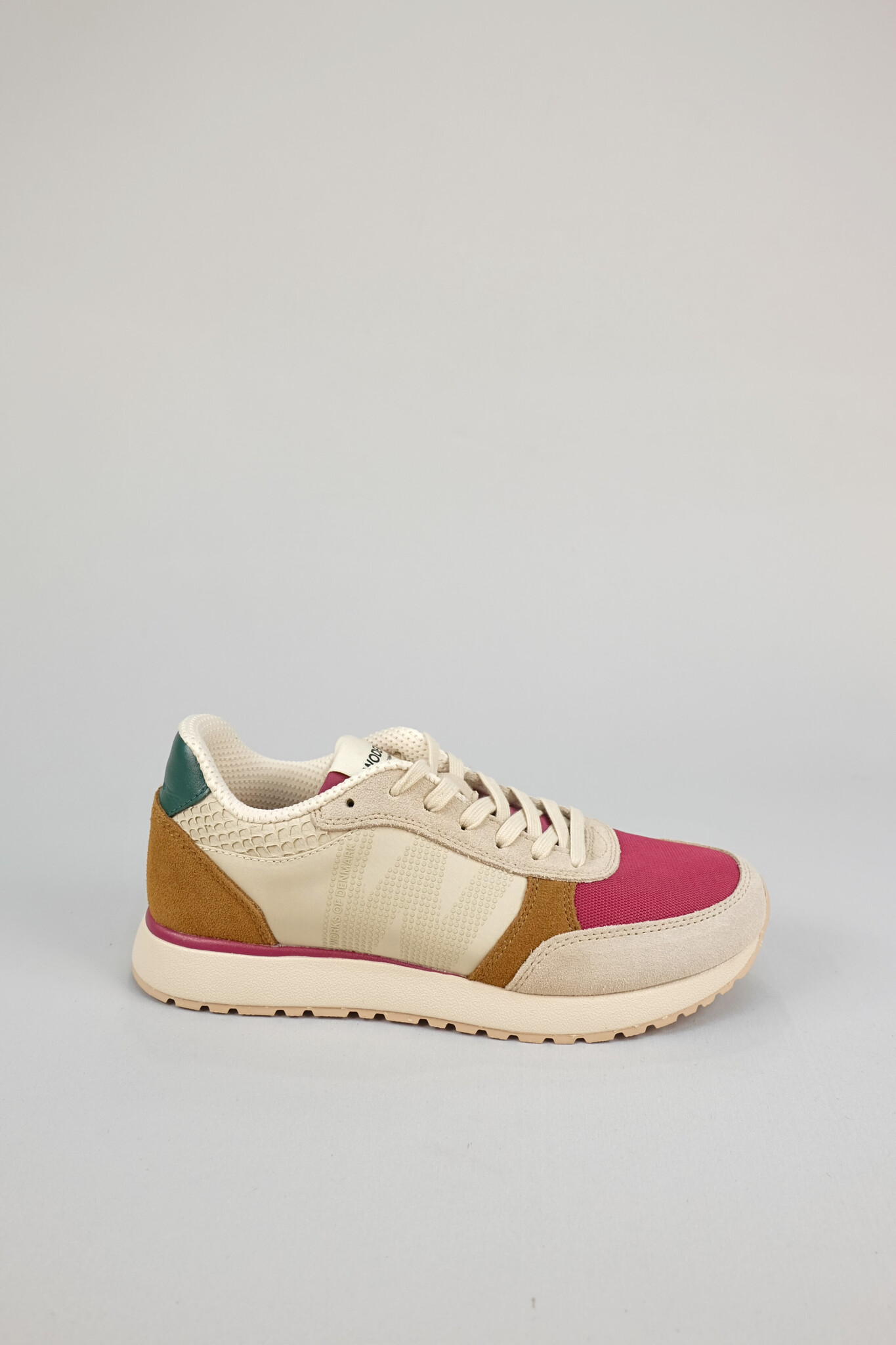 Sporty lace up sneaker featuring an easy combo of light neutrals and rich berry and autumnal shades in a mix of suede and recycled textile panels with fish leather accents (runs a size small)