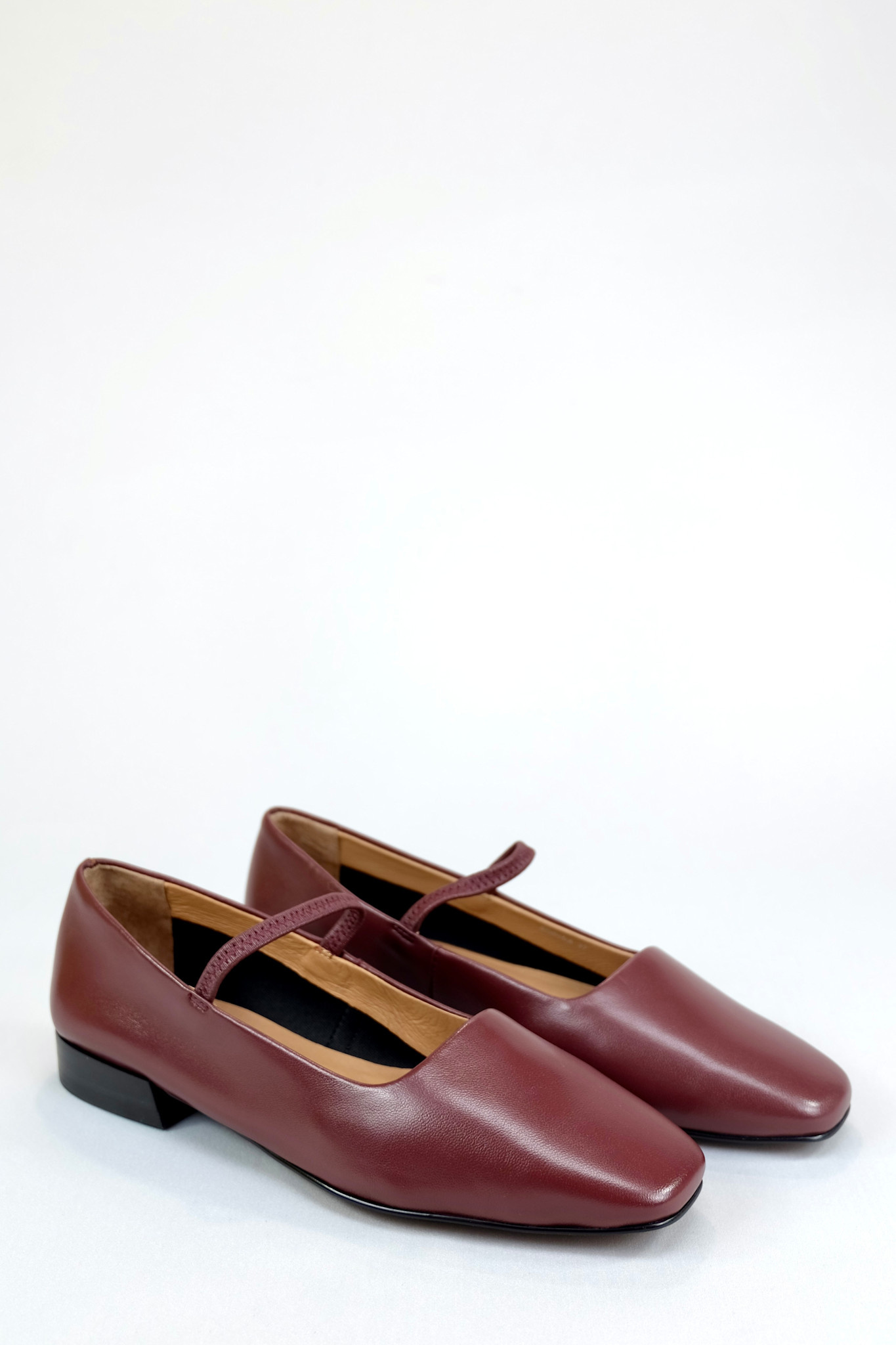 Sweet ballerina flat in oxblood leather with a chic square toe and elastic mary jane strap