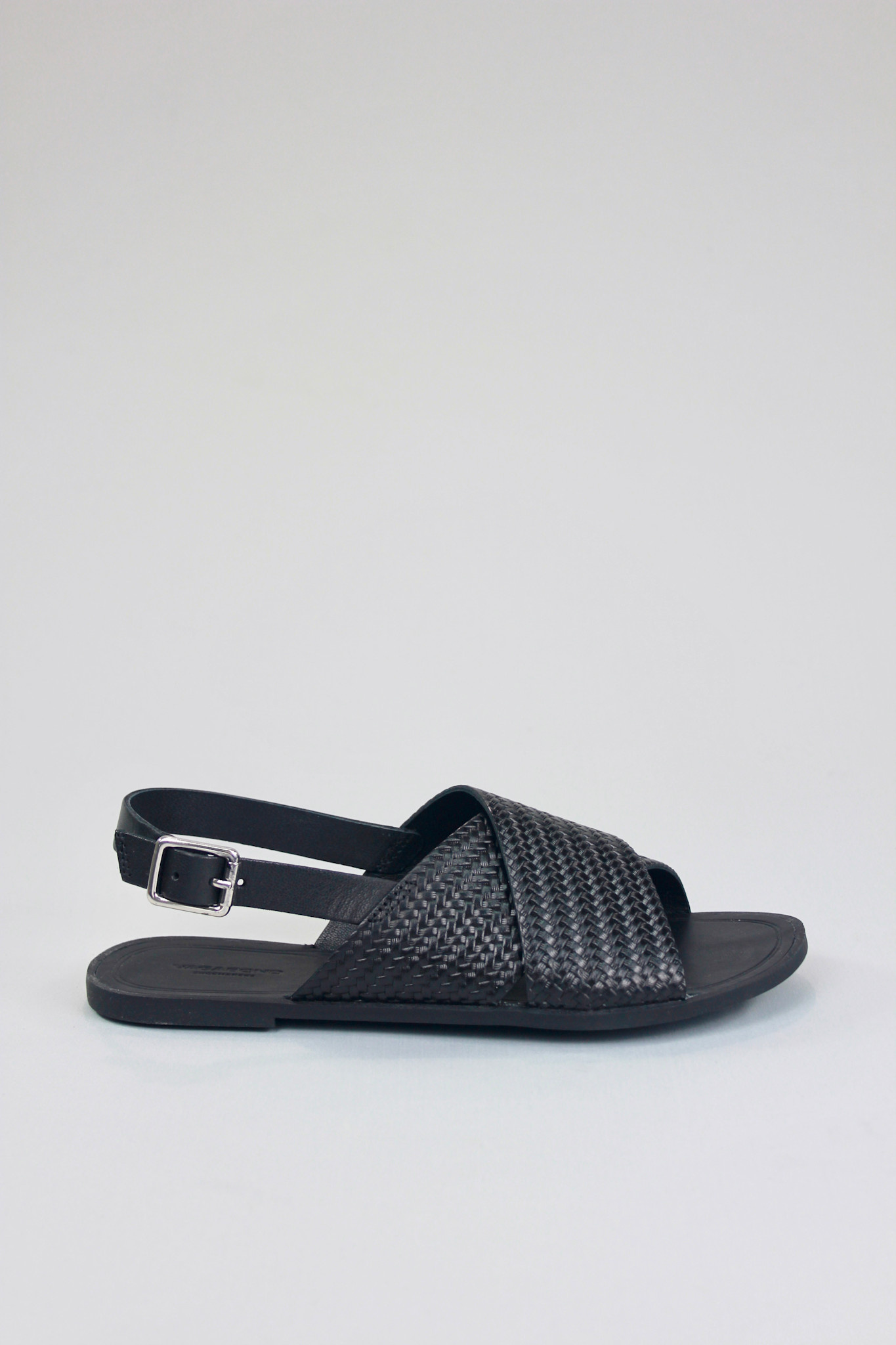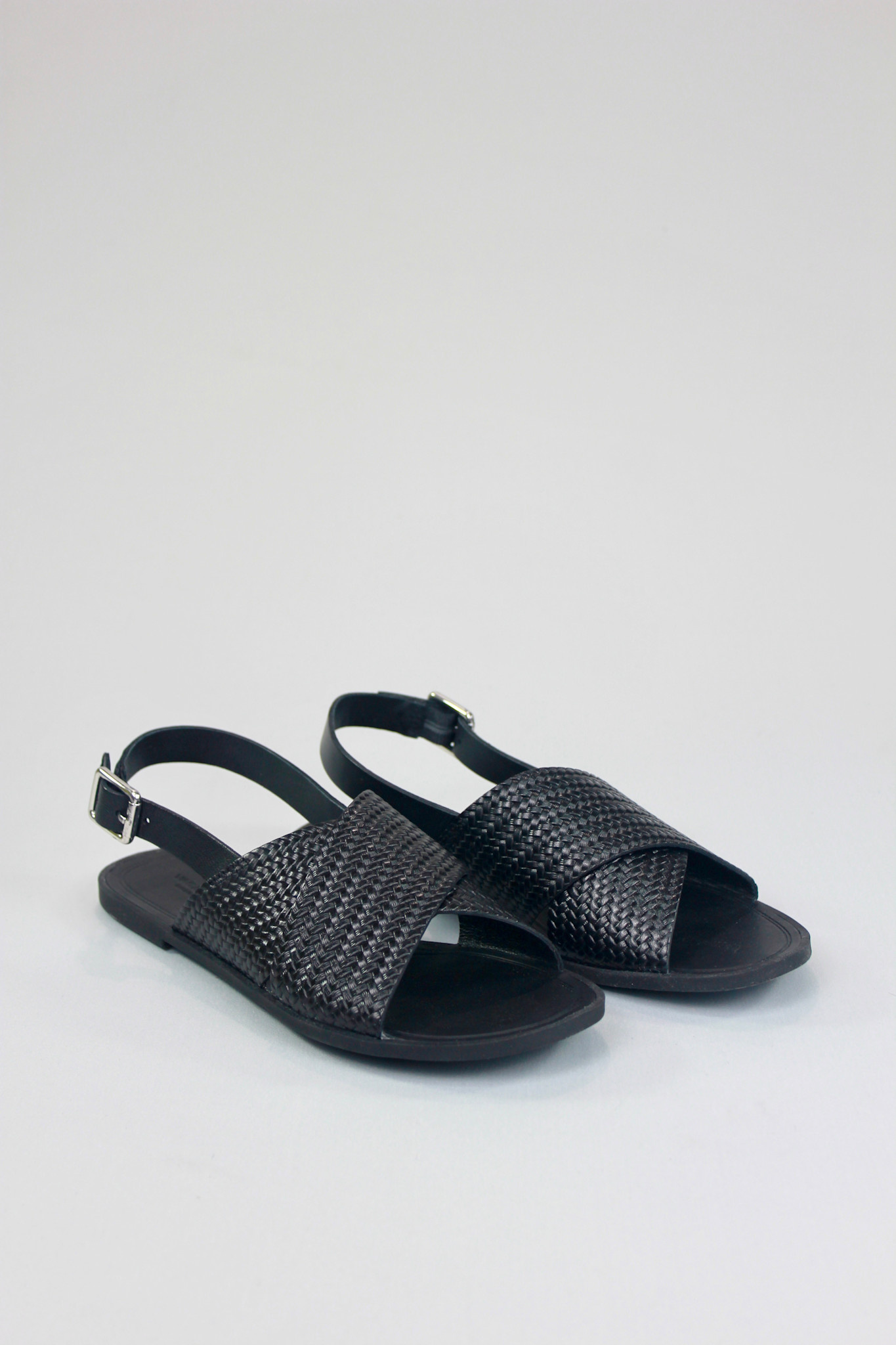 Buckled back strap sandal with a crisscross strap upper in a structured woven black leather on a lightweight and minimalist flat sole