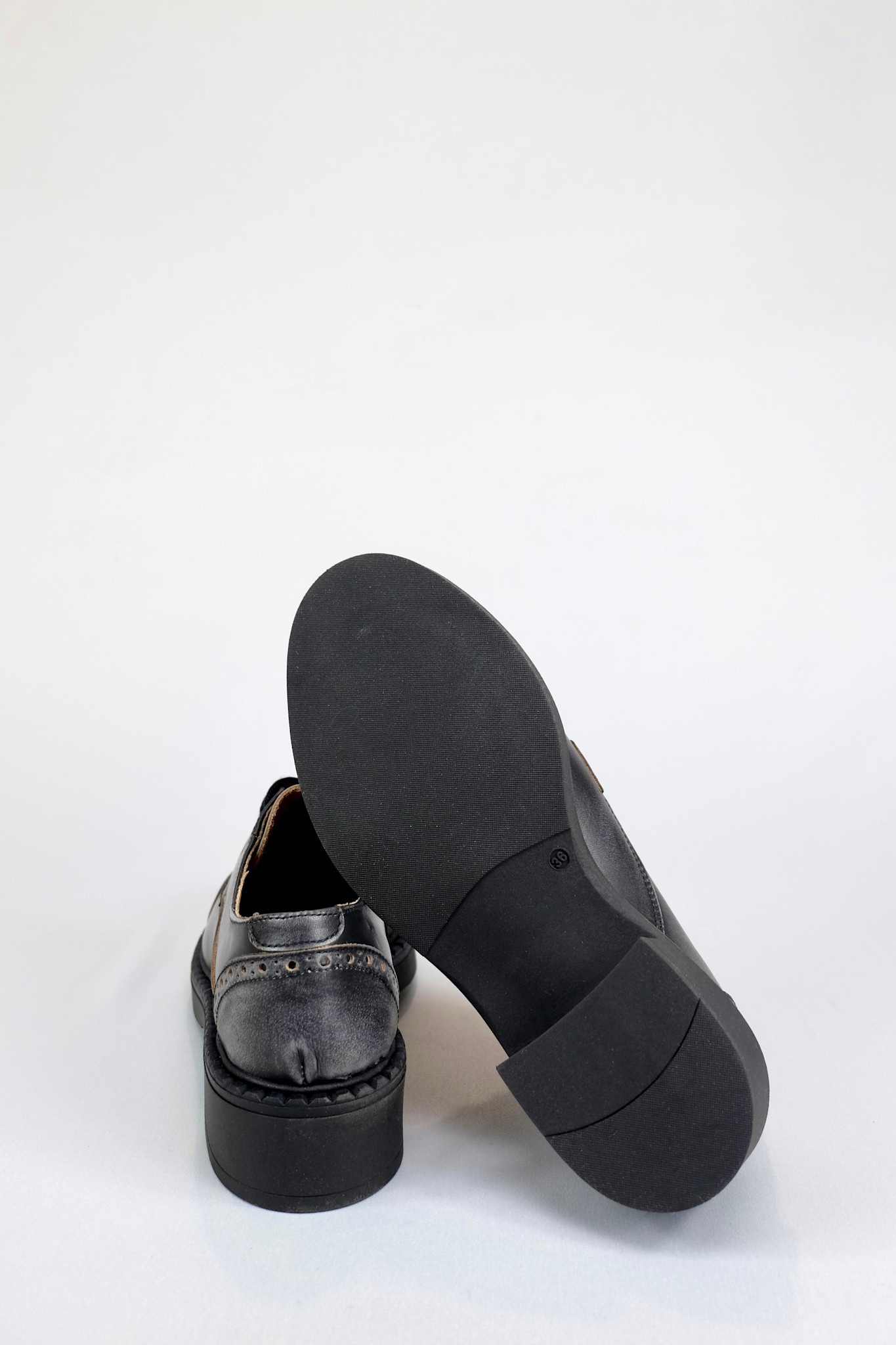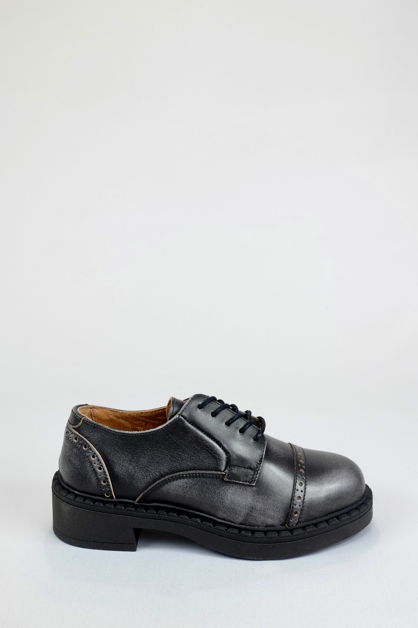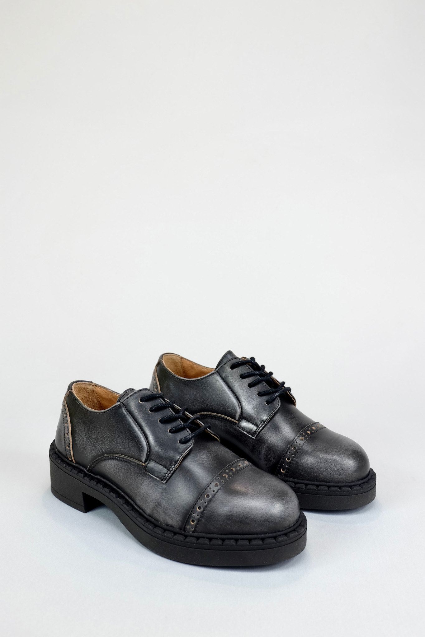 Classic menswear-inspired brogue derby shoe in a washed charcoal black leather with a sturdy sole