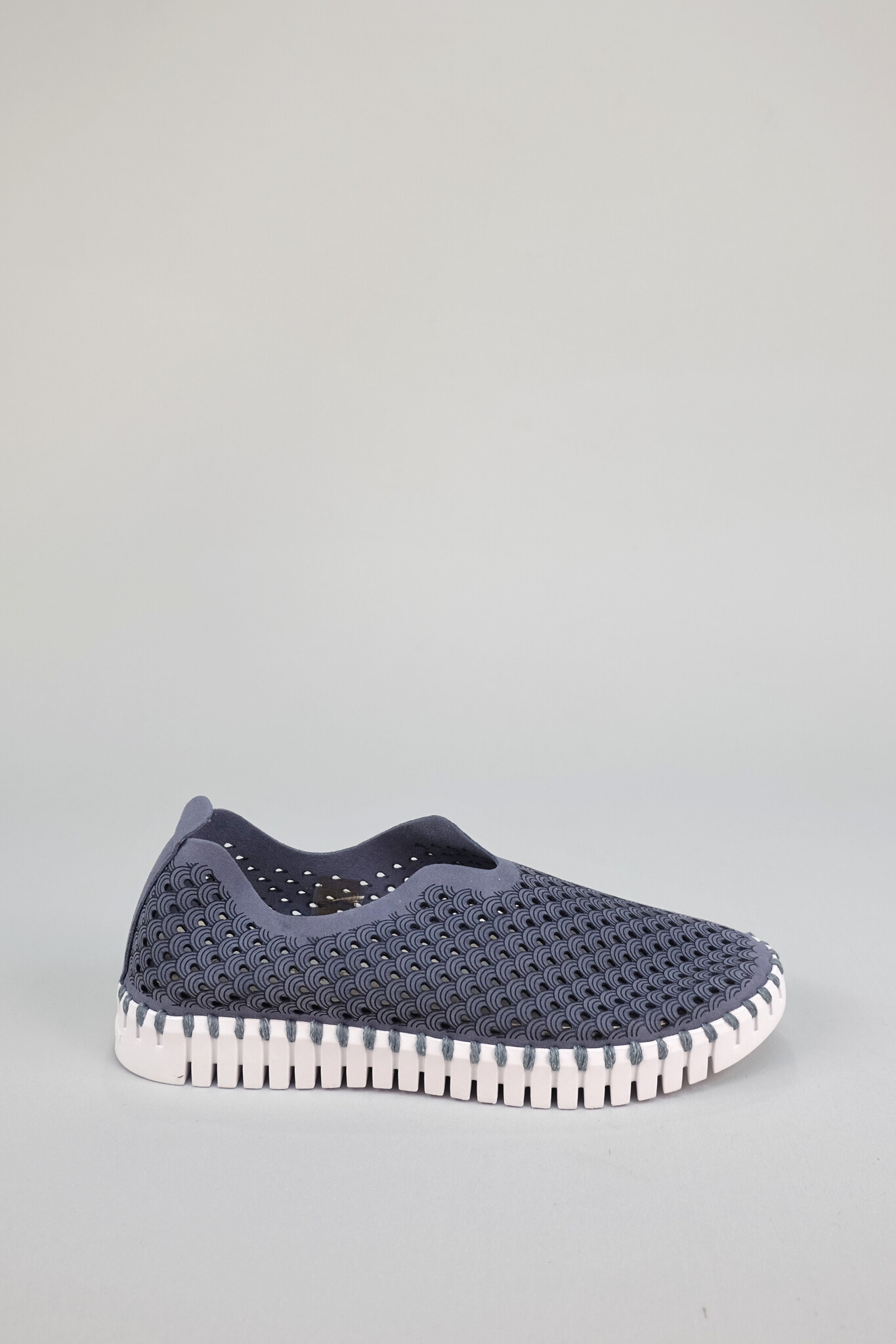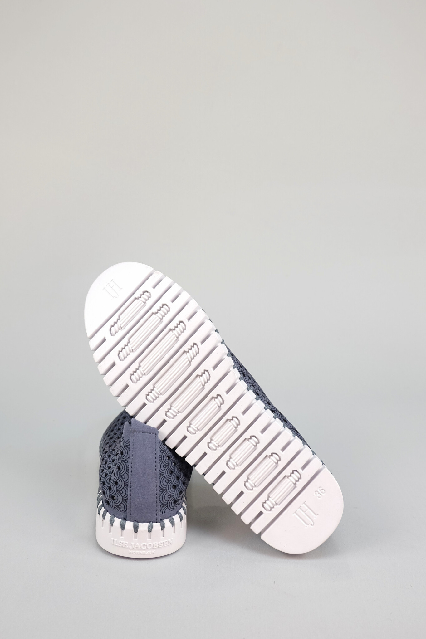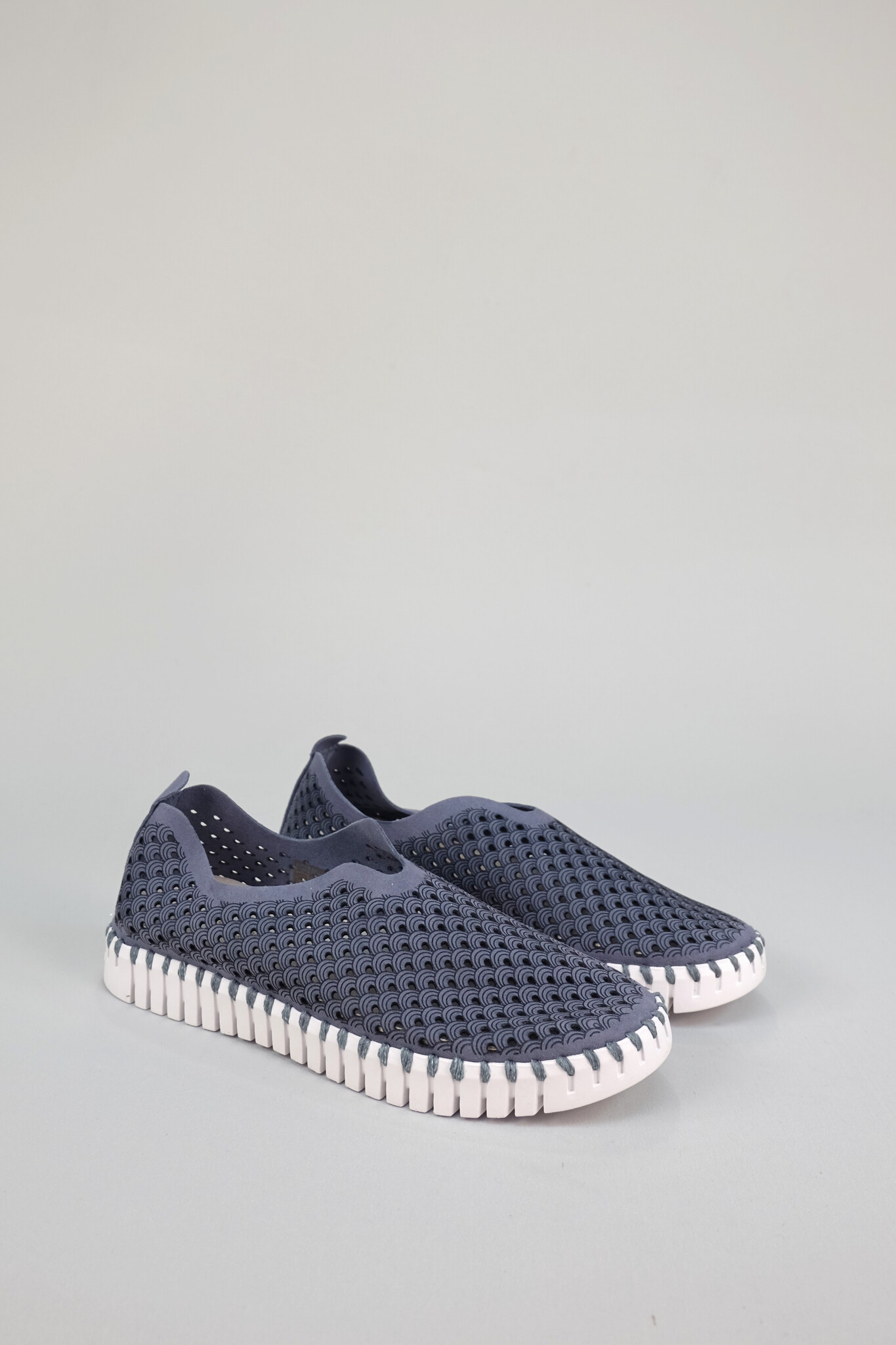 Lightweight and cushioned slip on shoe in steely blue perforated microfibre with a flexible natural rubber sole with whipstitched detailing