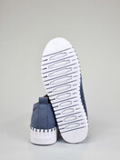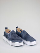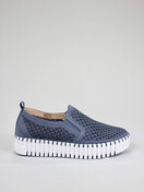 Slip on shoe with a perforated microfibre upper plus elastic panels for a more flexible fit on a rubber platform sole with whipstitch finishing