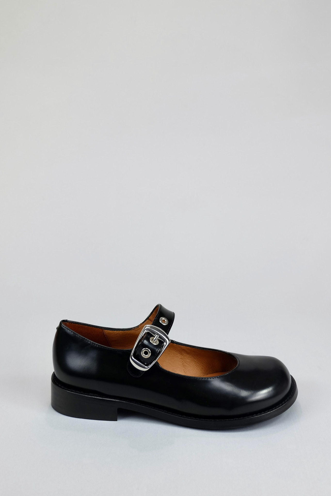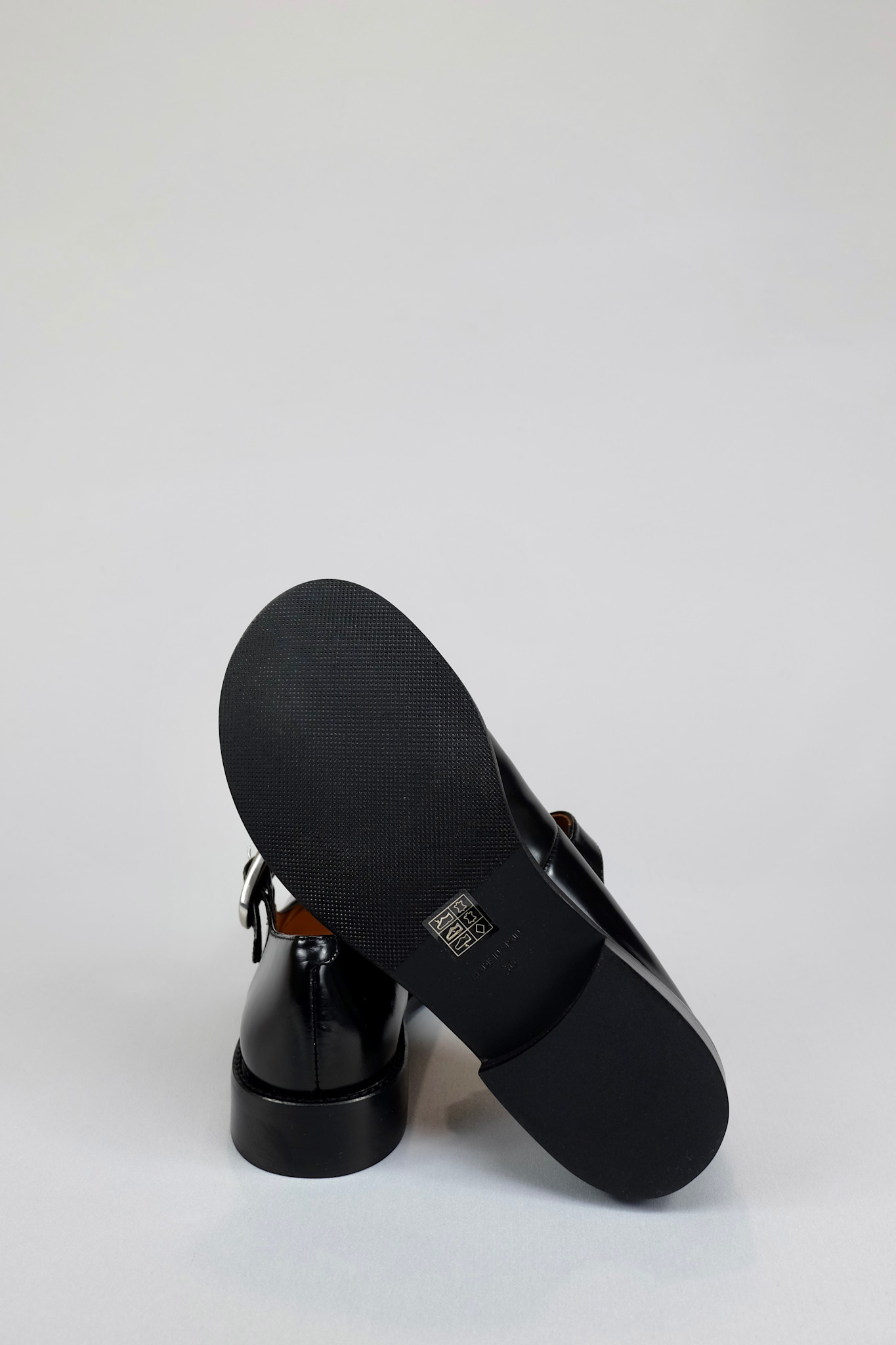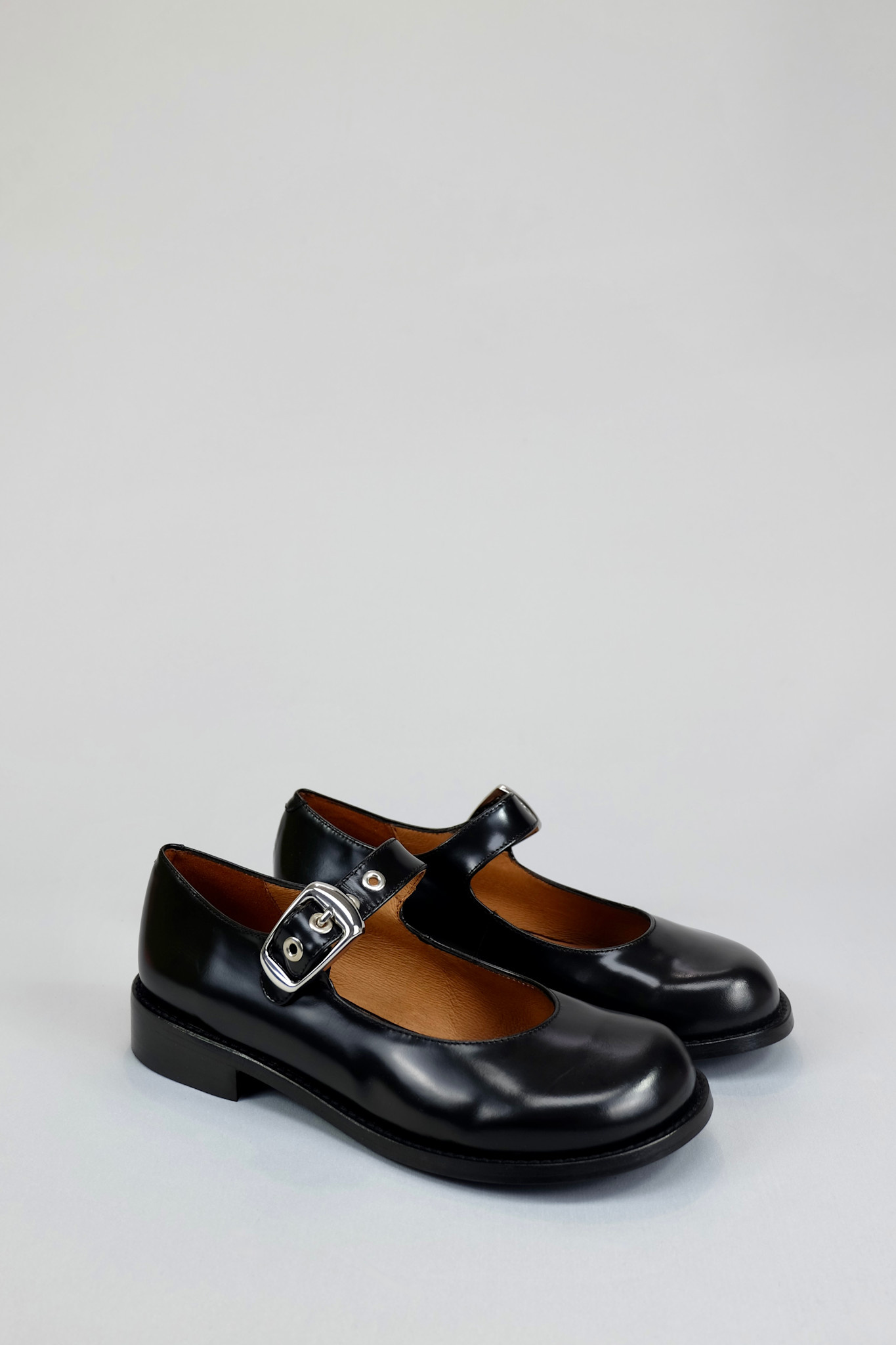 Classic and easy-to-wear mary jane shoe in polished black leather with a round toe, silver hardware, and a very modest lift
