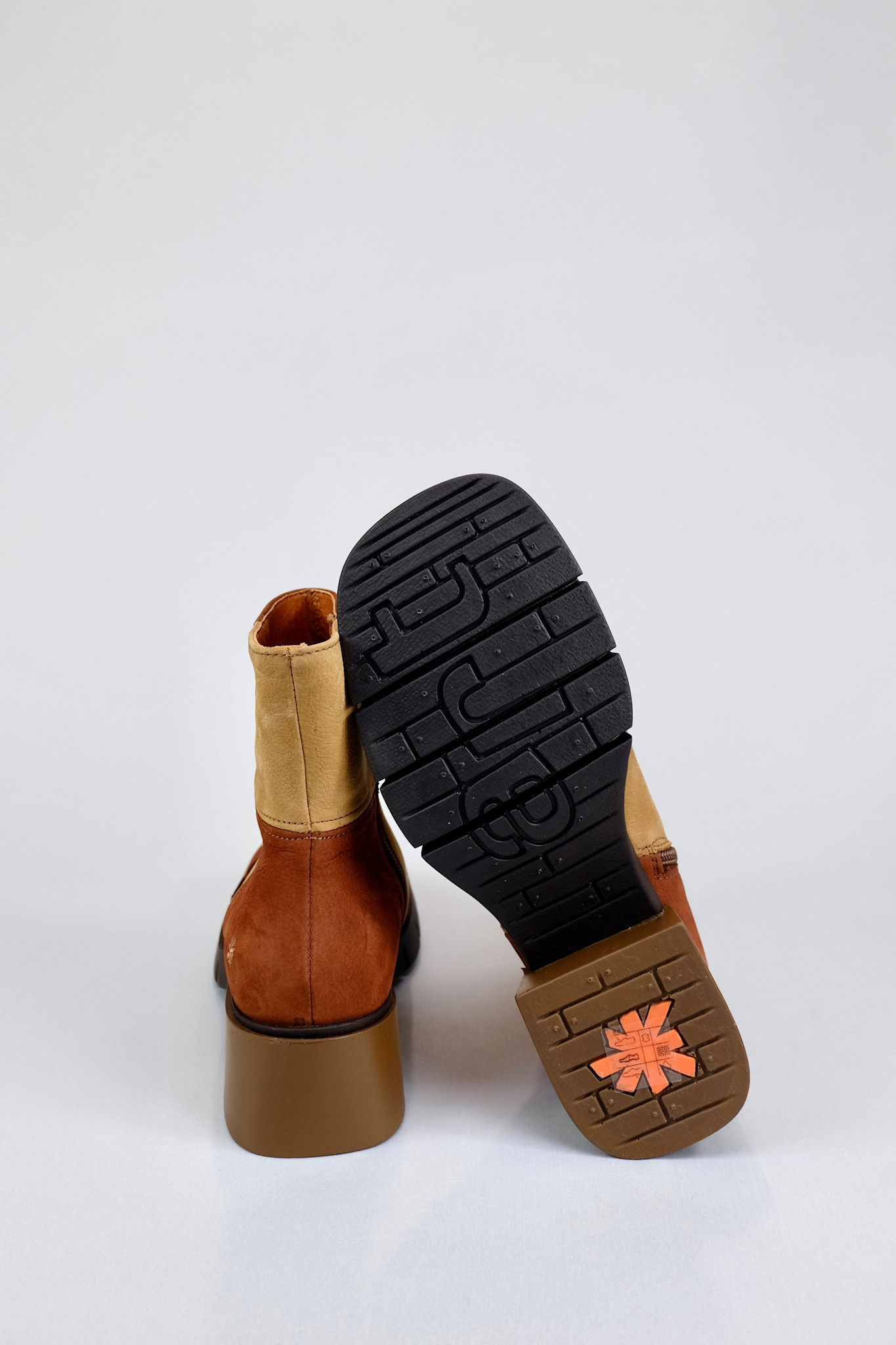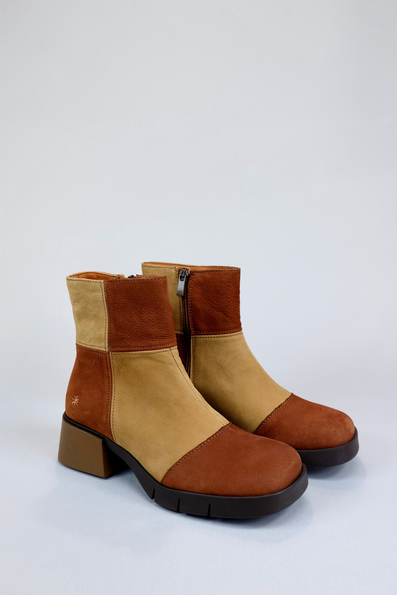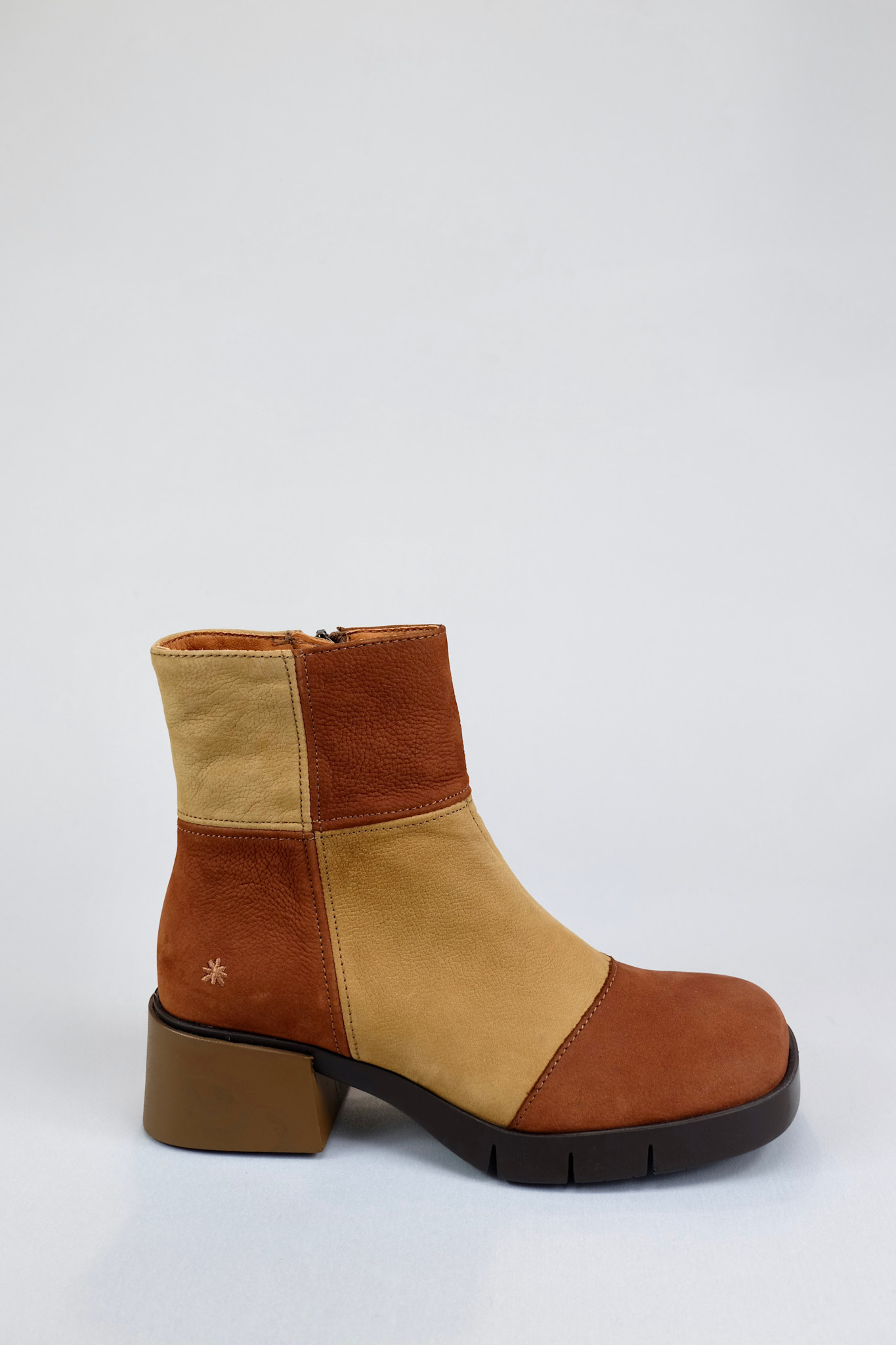 Playful block heel ankle boot in a fantastic retro 70s brown patchwork of pebbled nubuck leather with a softly squared toe and inside zipper